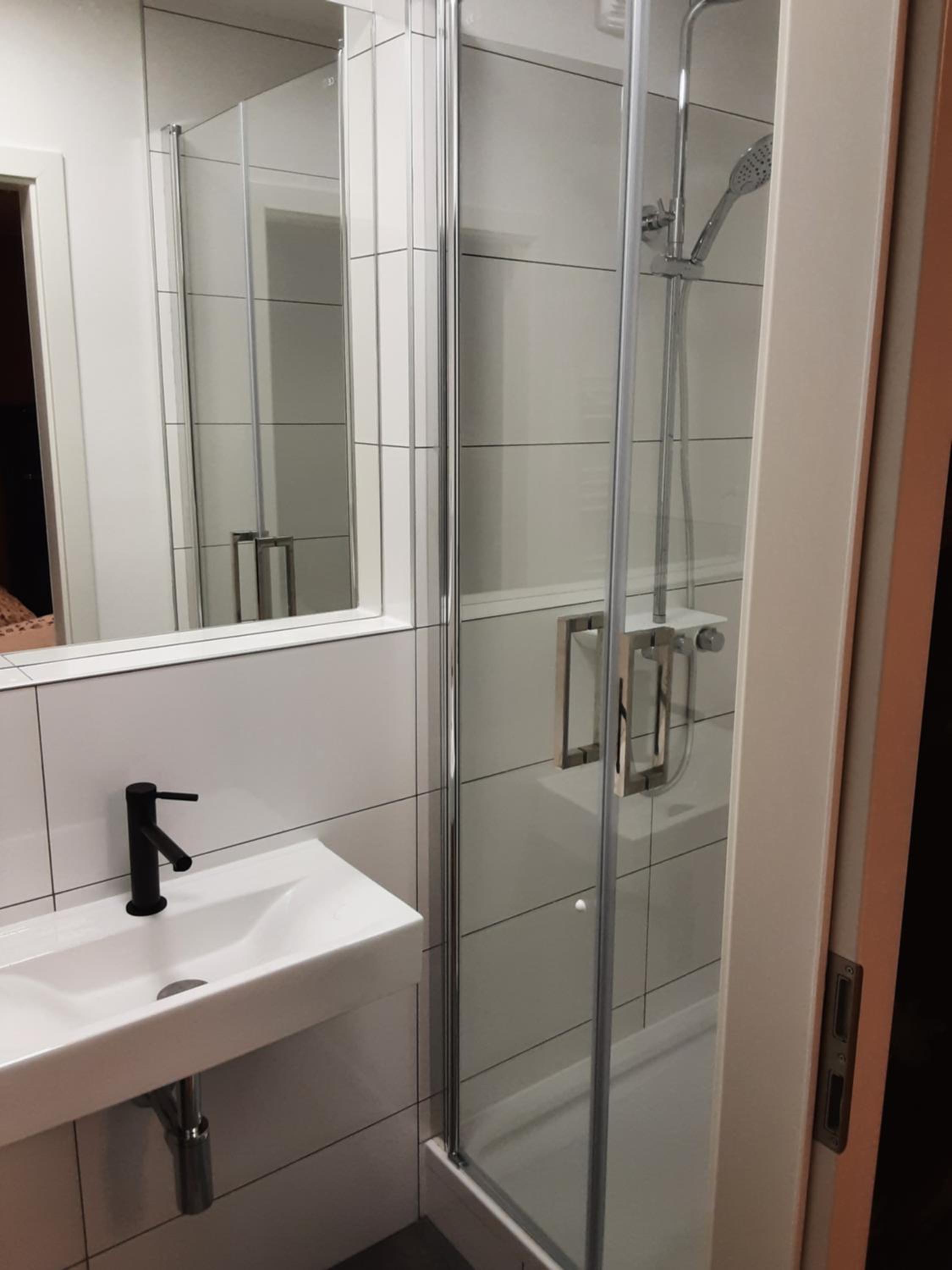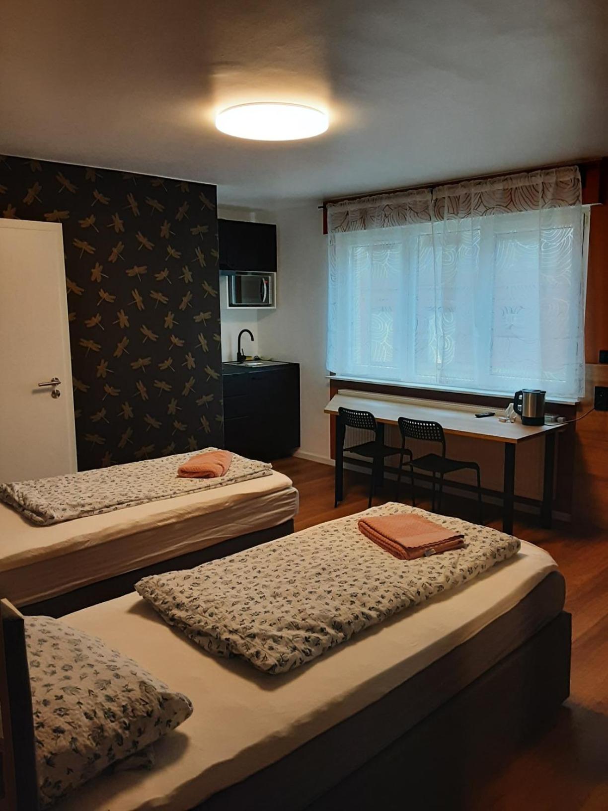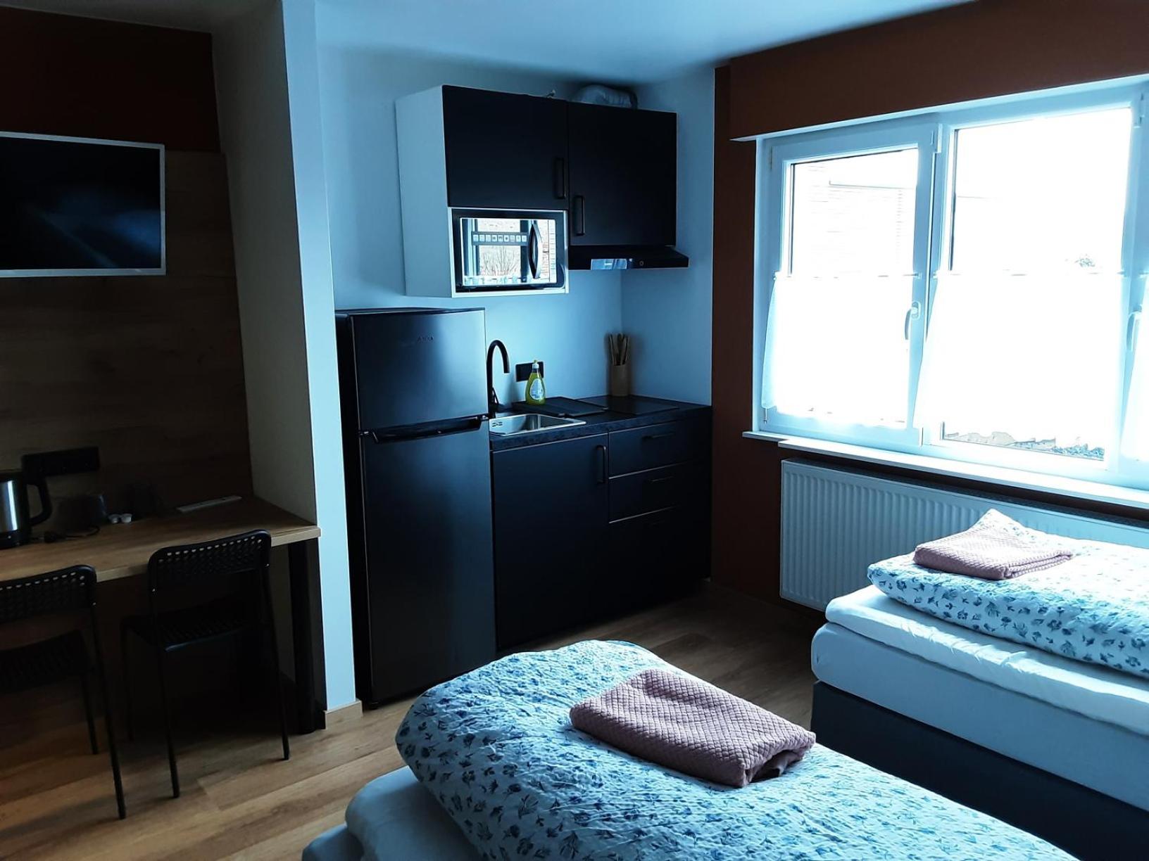 Sehr freundlicher Empfang, schönes Zimmer mit zwei Einzelbetten, große Dusche, Küche mit großem Kühl-/Gefrierschrank