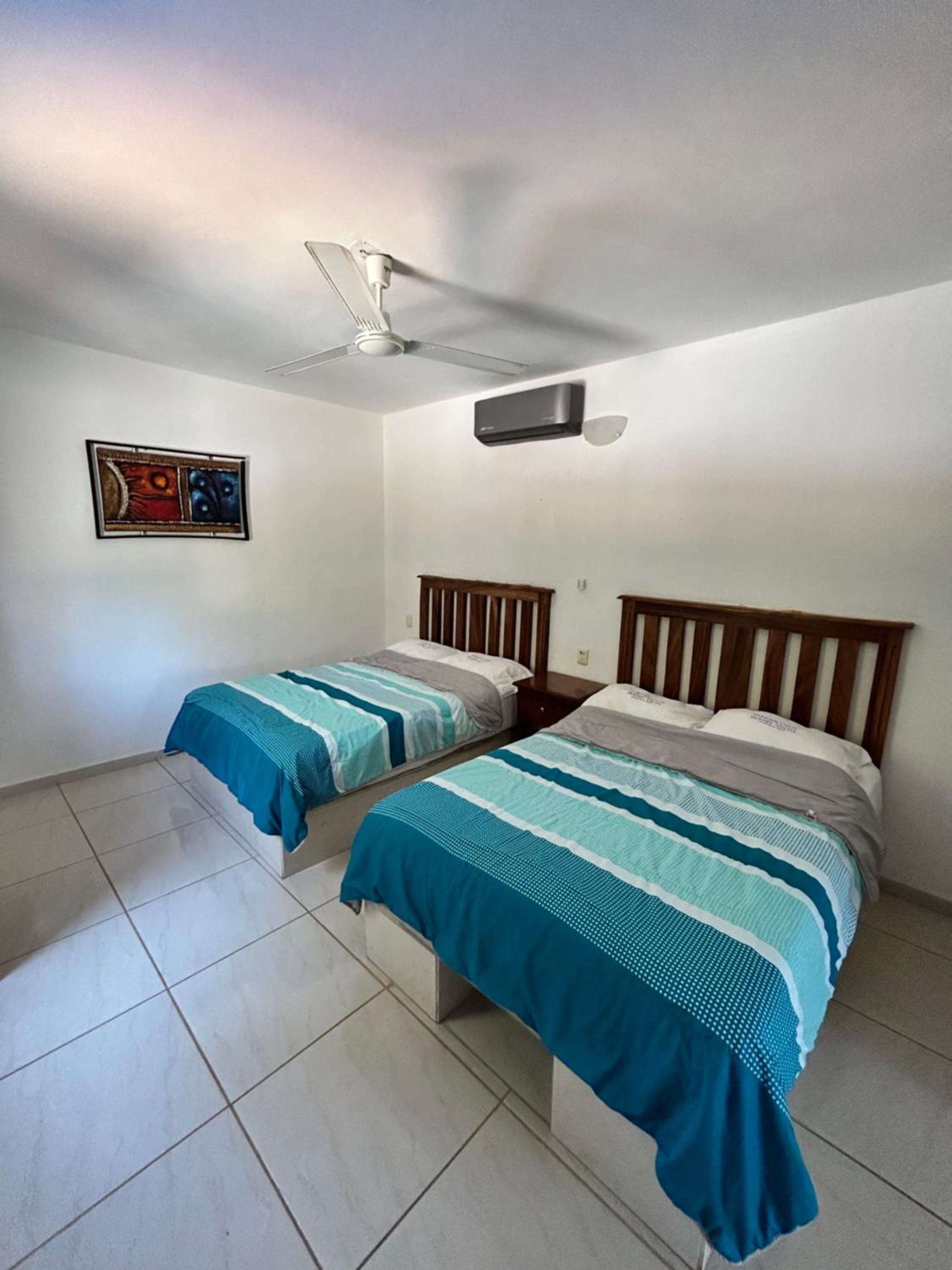 Great view. Comfortable beds . Very good showers with hot water! The cooking facilities and fridge were in good order. The ocean walkway at base of hill, is beautiful so walking into main beach is nice and the Cafe overlooking the nearby small calm beach area ,is especially good