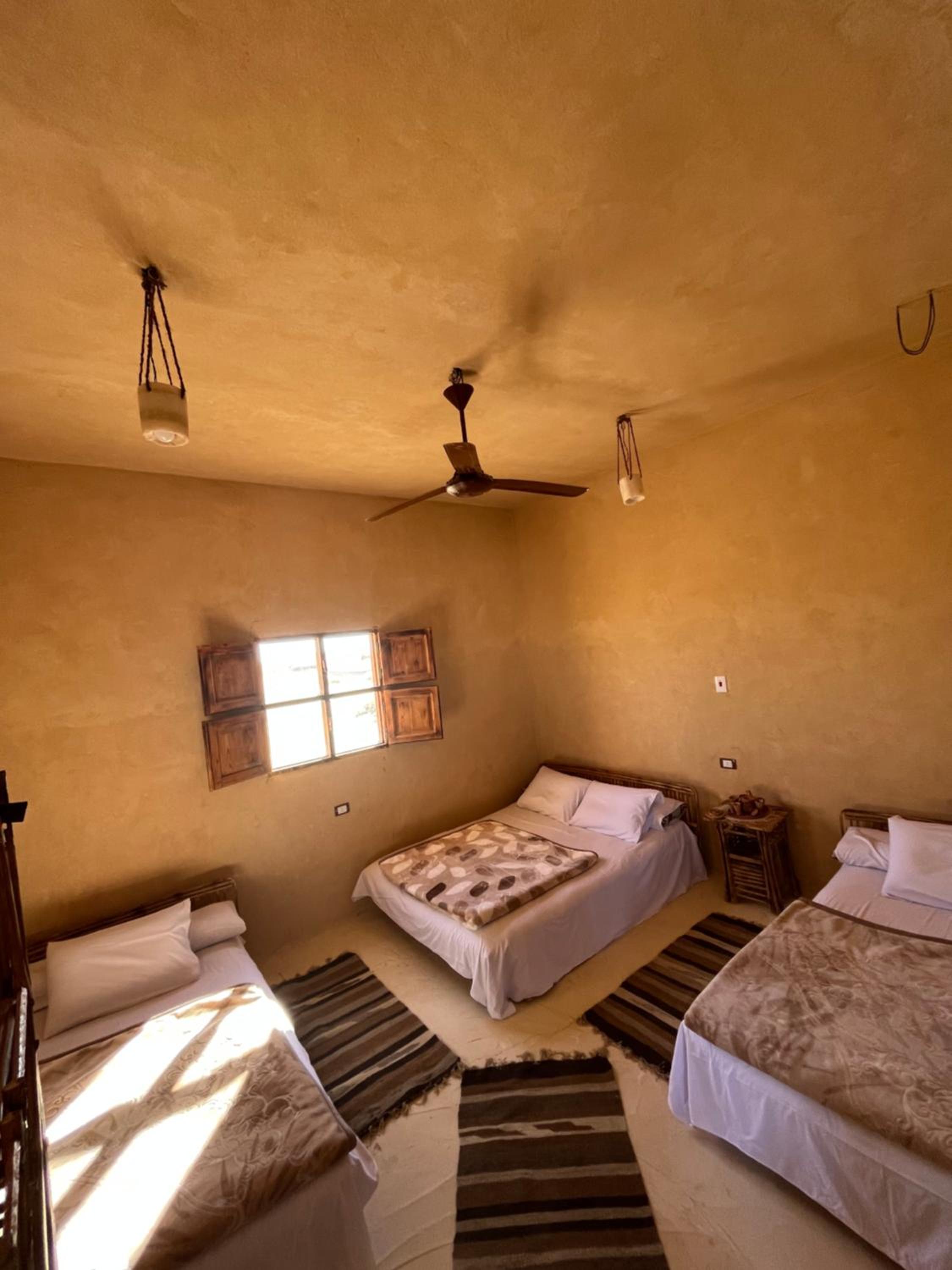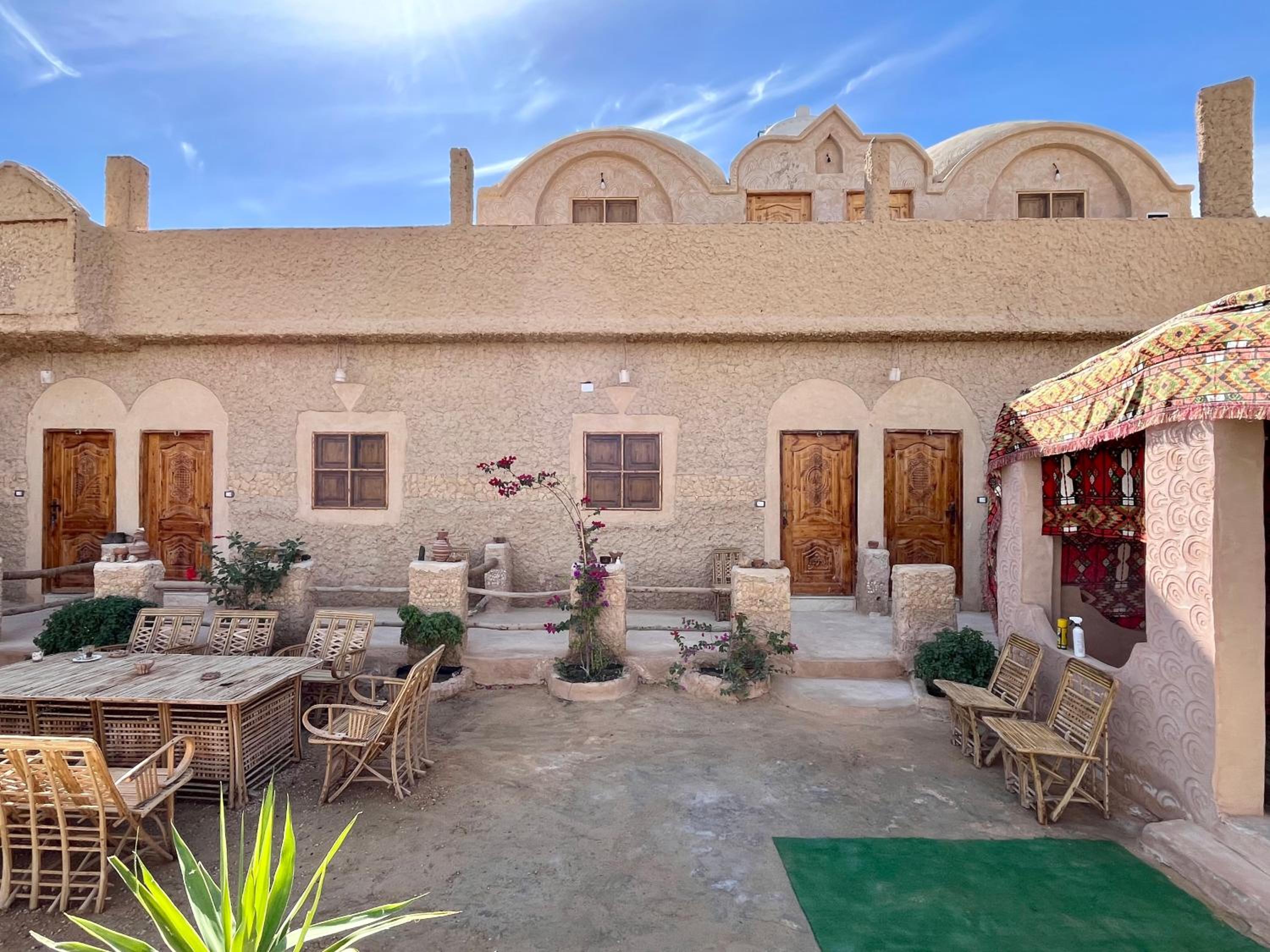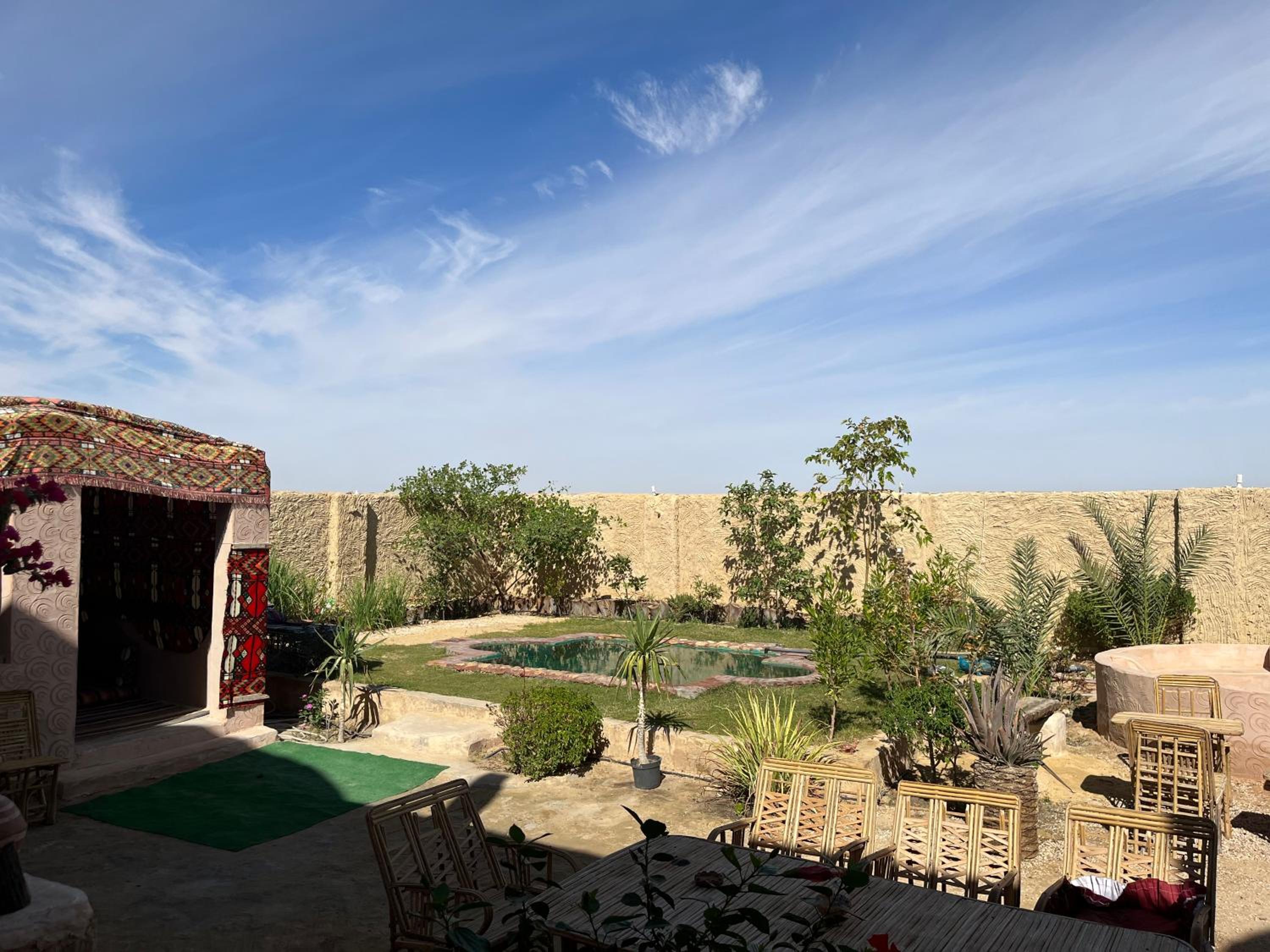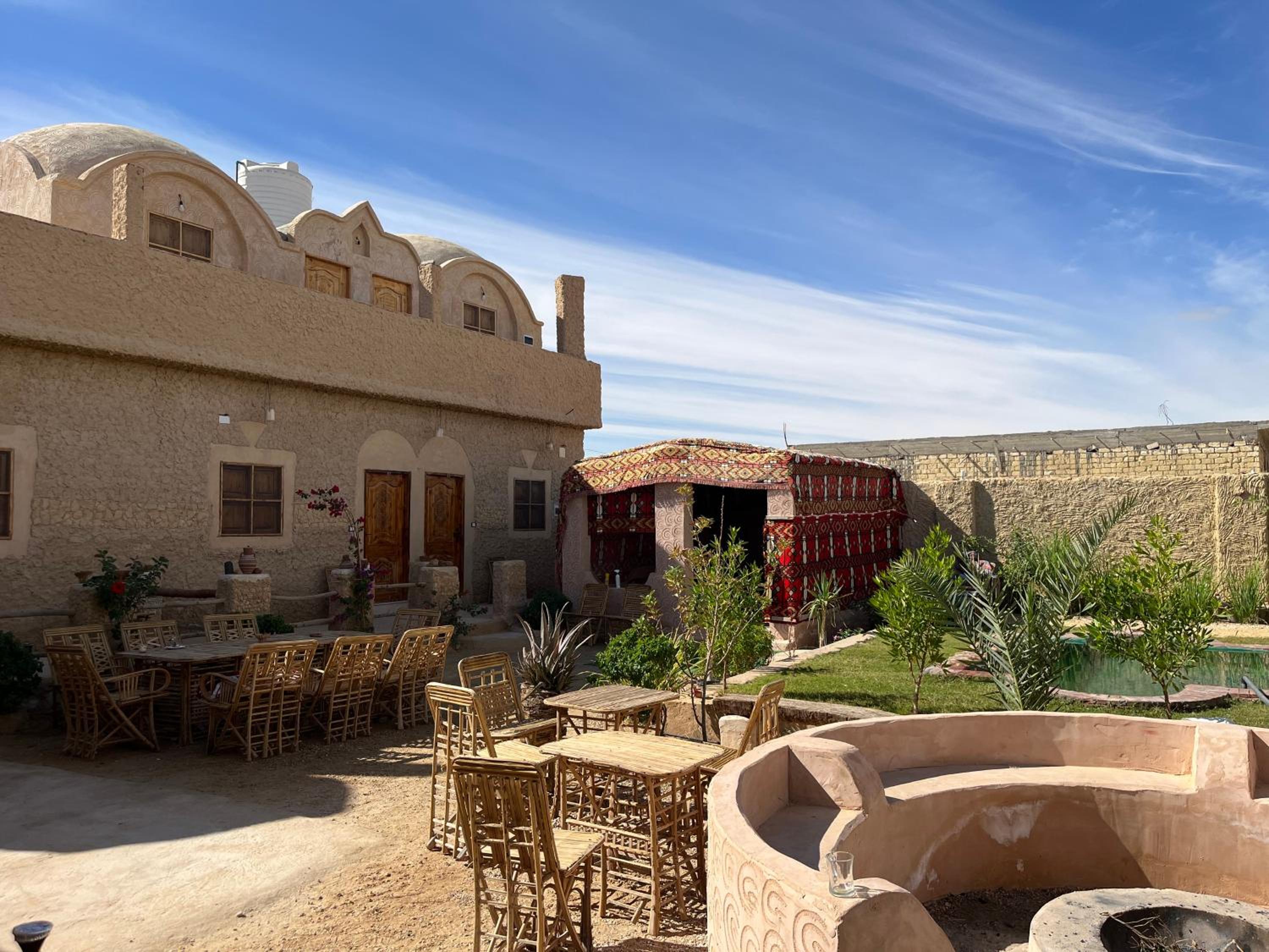 The place is in a very calm and peaceful part of Siwa. There's a beautiful inner yard with a small pool and a campfire seating. It was really nice to sit around the fire in the evening and drink tea. The room and bathroom were nice and clean. There were warm and soft blankets for winter months. Breakfast was delicious and there was also possibility to order lunch and dinner. The owner is very kind and accommodating.