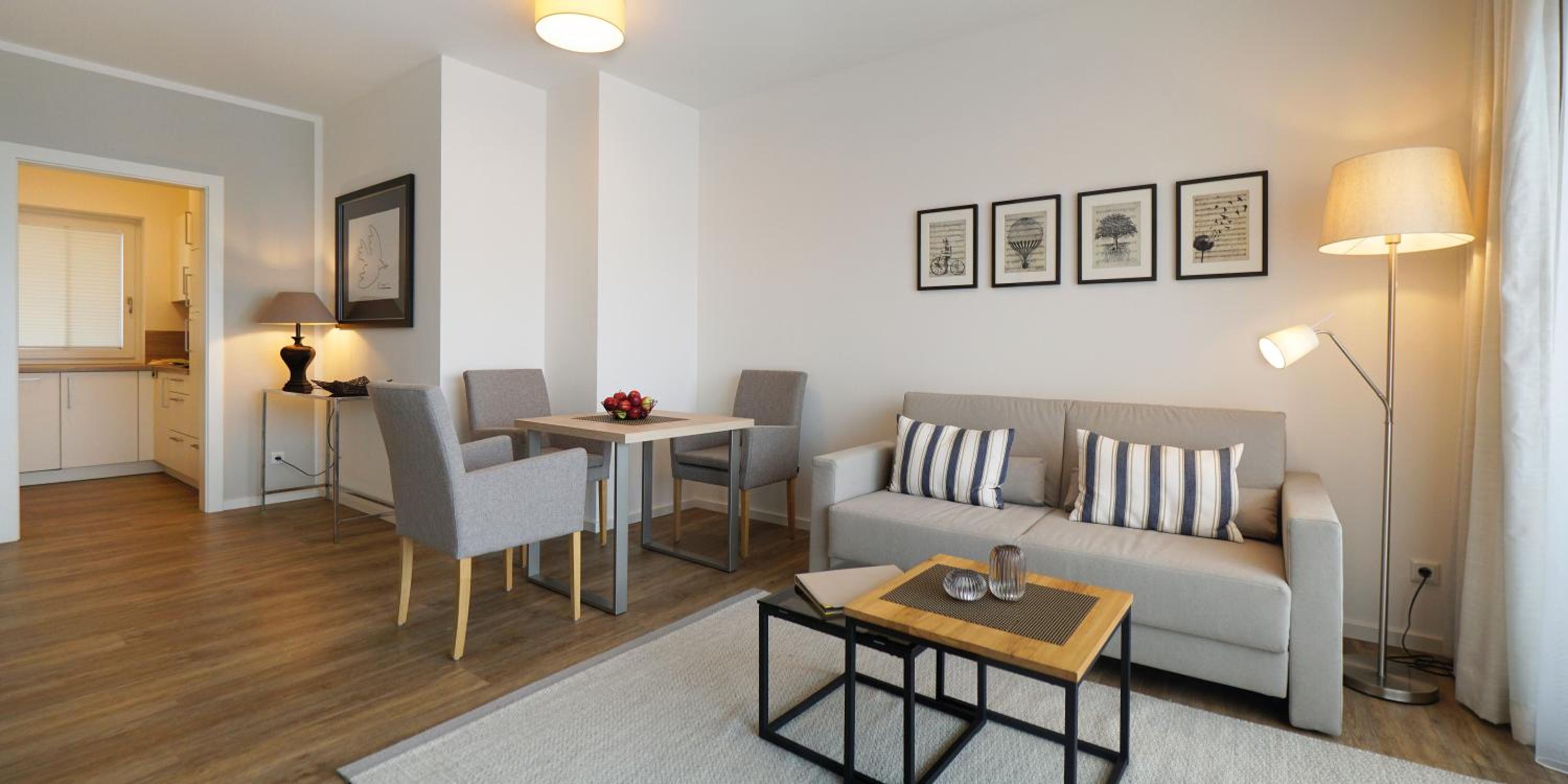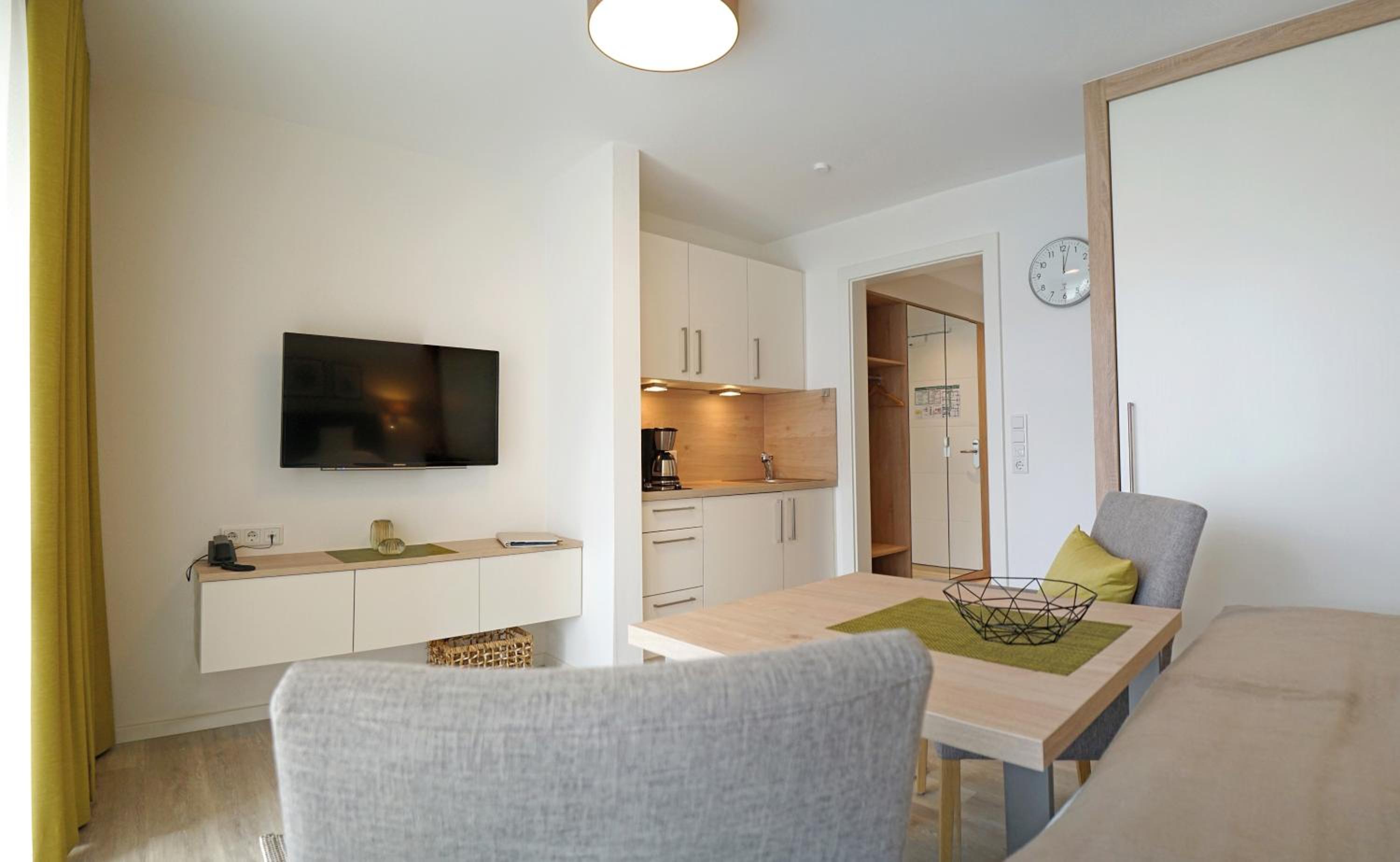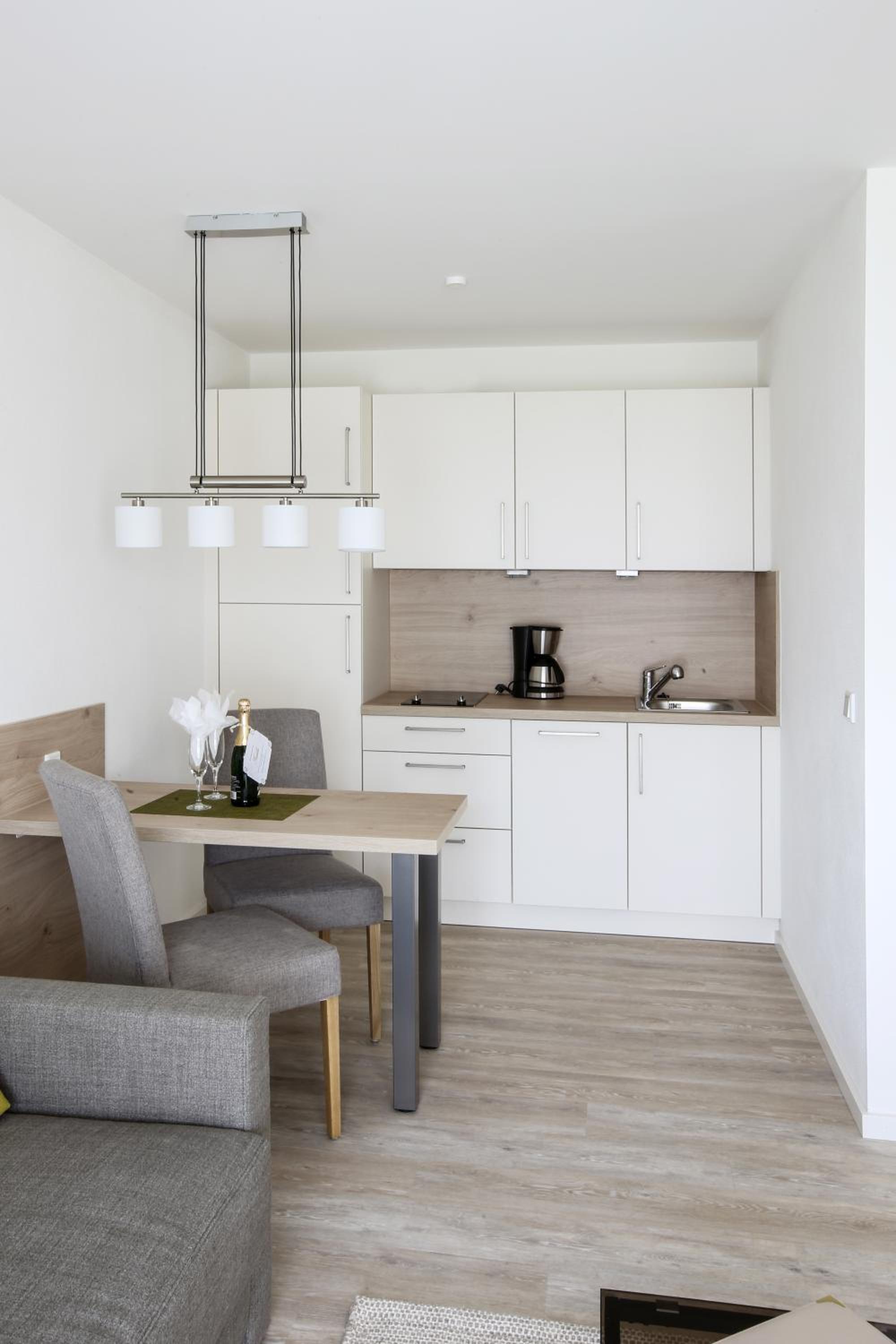 Die Küchenzeile könnte leichte Aufbesserungen vertragen wie ein Regalchen über dem Tisch, wo man Kleinigkeiten abstellen könnte. Auch der Tisch ist einfach zu klein wie auch die Sofatische. Also, wenn das mal ausgetauscht werden sollte,sollte man das beheben. Und, irgend eine Art von Schreibtisch resp PC-Tisch ist auch für das Zielpublikum, mind ü60, mind gern gesehen. Vllt sollte man anbieten - gegen Aufpreis ? - dass bei 2-wöchigem Aufenthalt mal 1 Reinigung erfolgt.