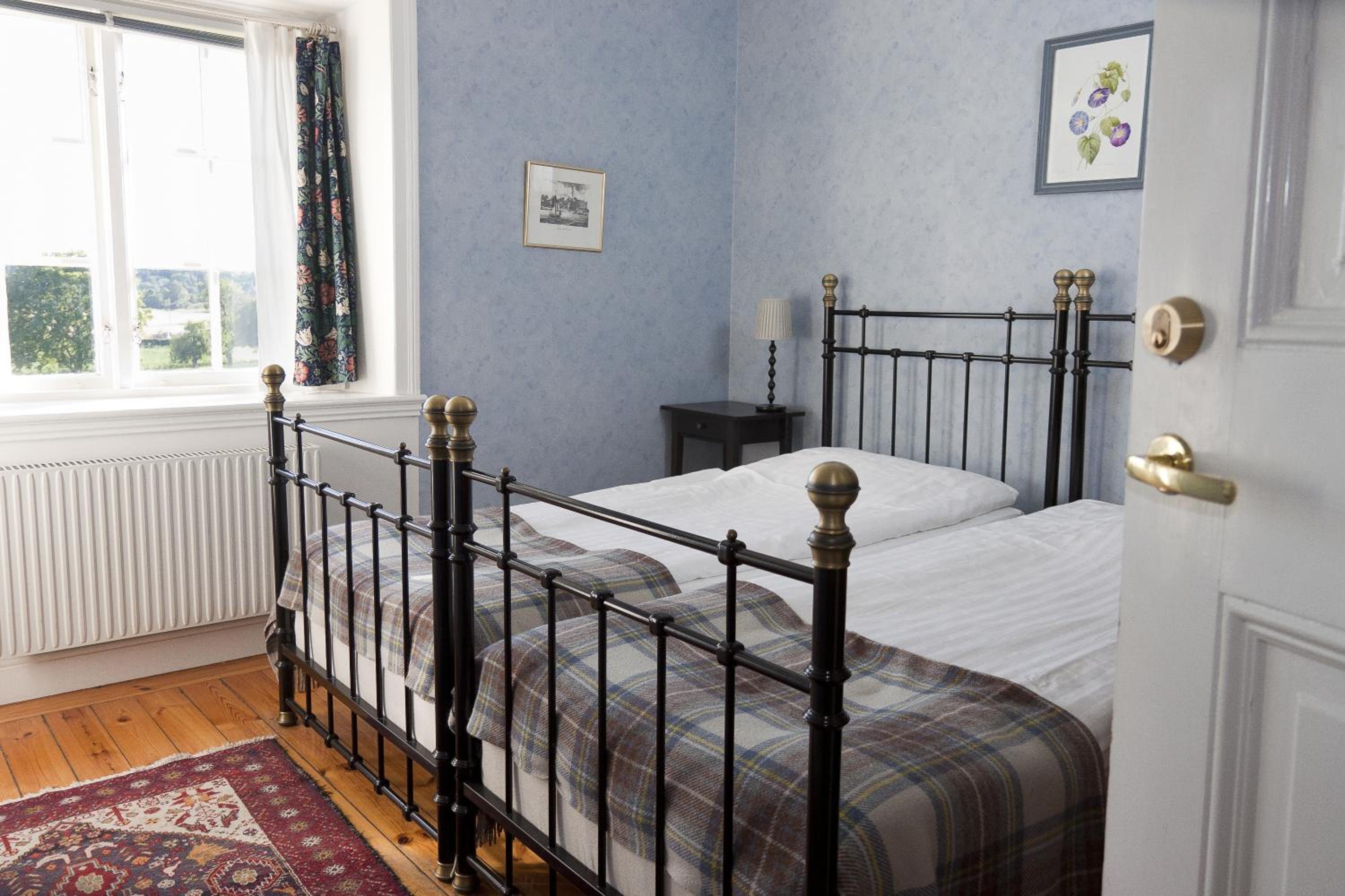 Experience the charm of Stegeborg Hotel's guest rooms, featuring fresh bathrooms, traditional wrought-iron bed frames, and cozy amenities like writing desks and lounge areas, all exuding an old-world atmosphere for a truly memorable stay.