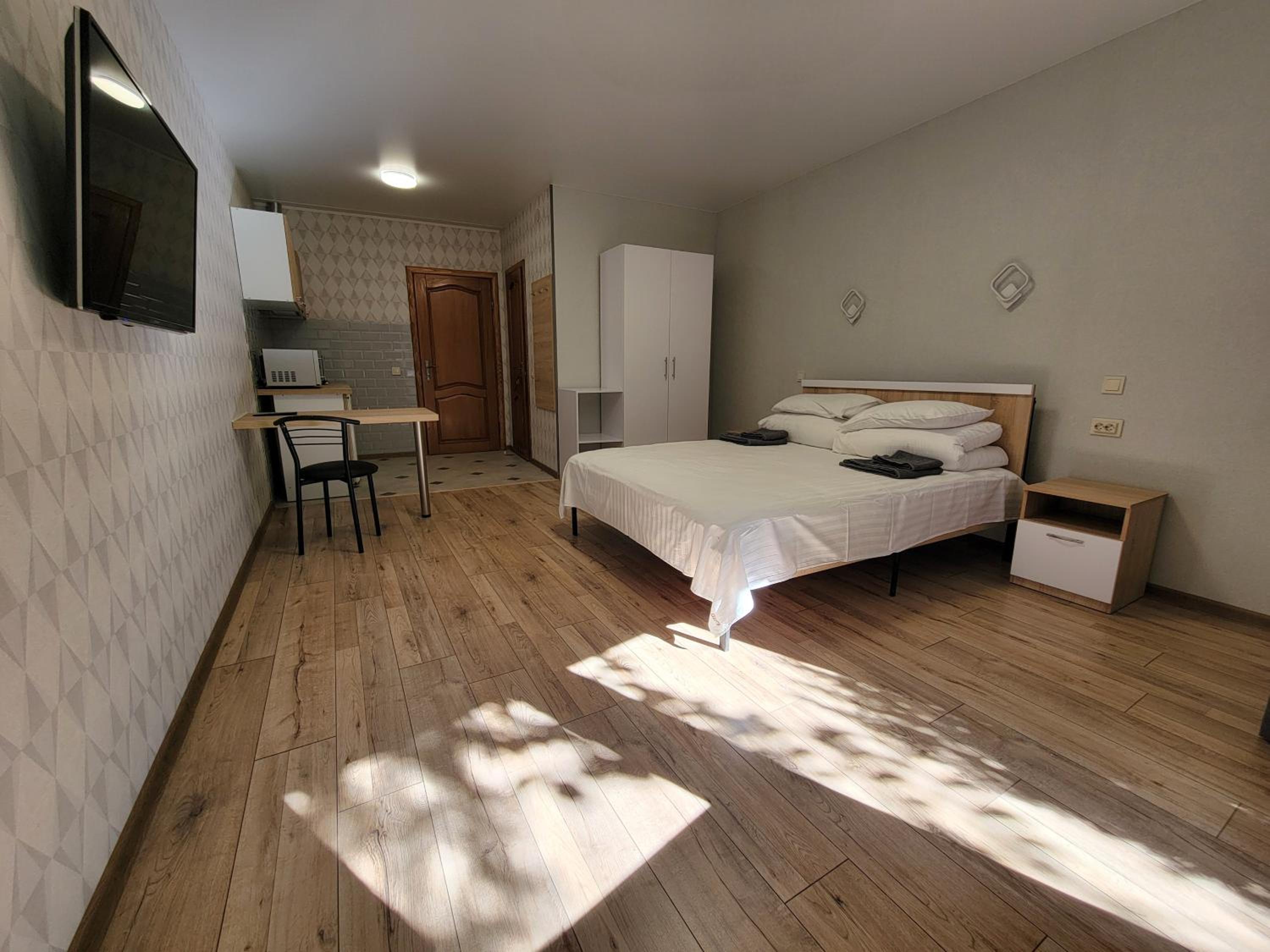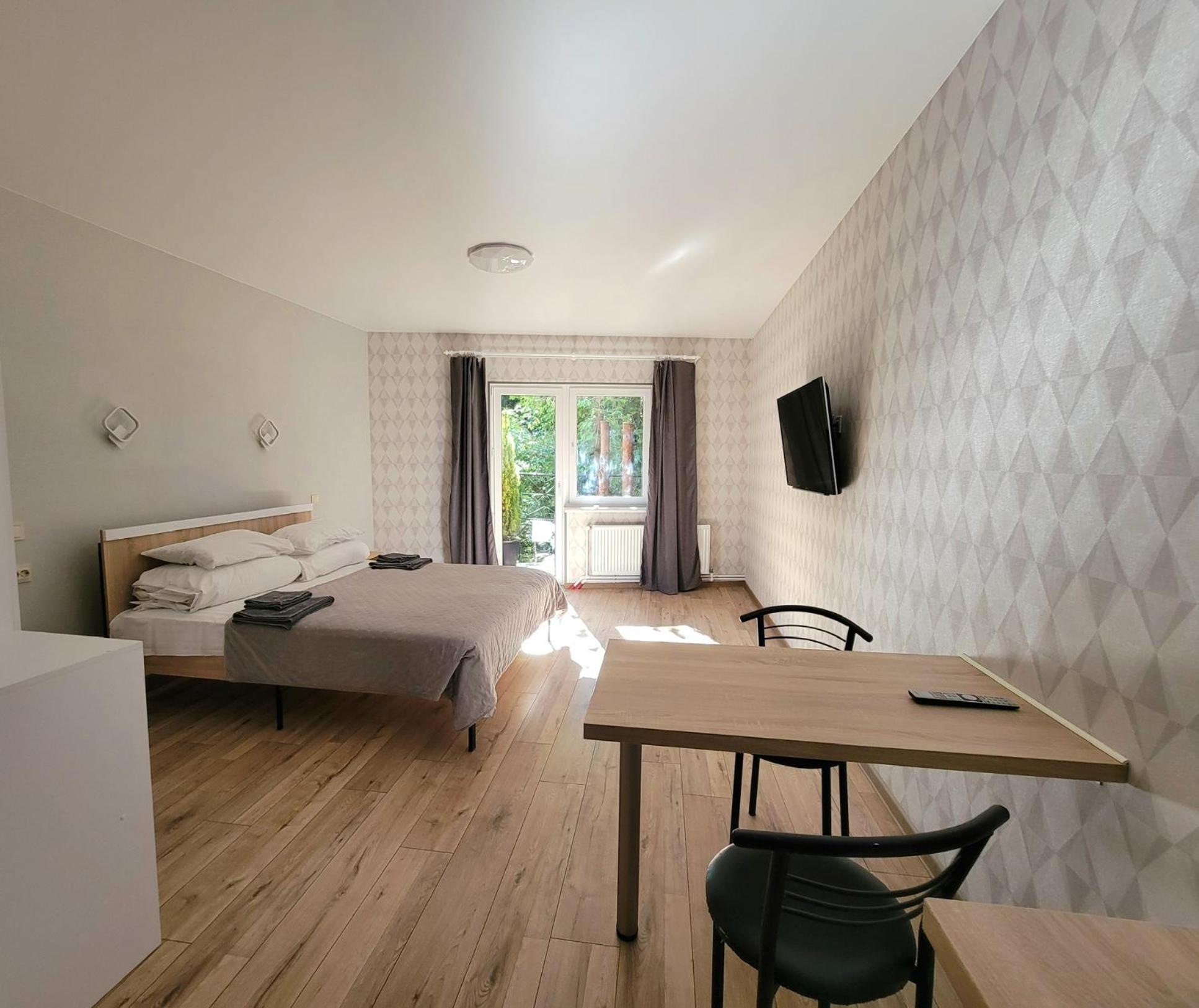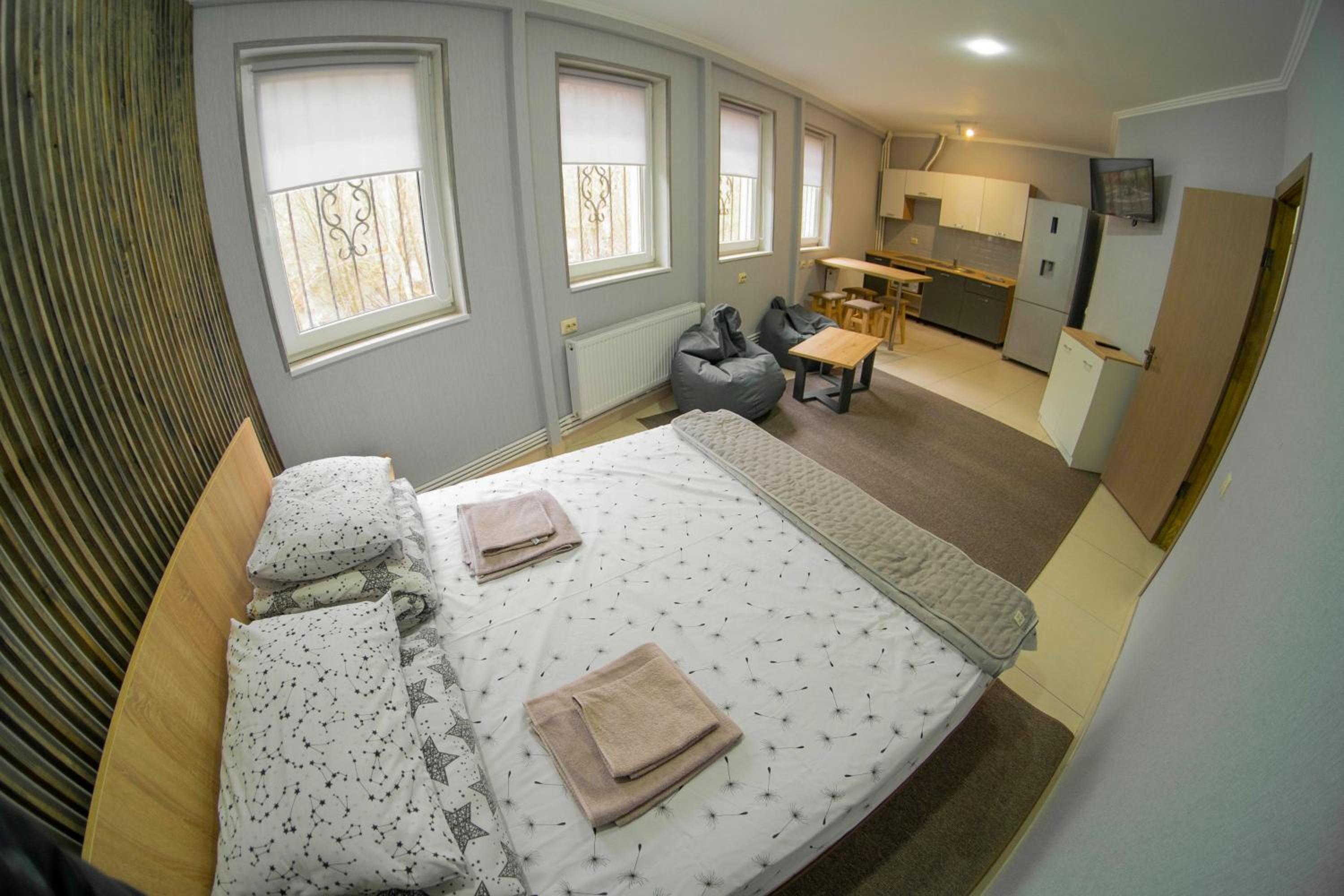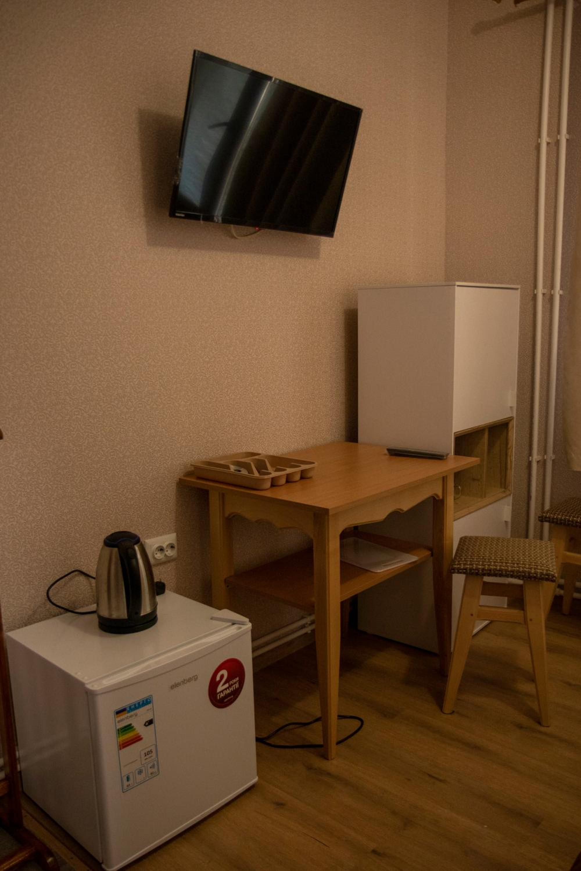 Мешкали в Люксі. Номер комфортний, є невеличкий холодильник, чайник та мінімальний набір посуду. Є кухня з можливістю приготувати їжу, але вона загальна і знаходиться на першому поверсі. Потреби в приготуванні їжі не було тому нас все влаштувало. Є безкоштовна парковка. В нас був пізній заїзд, але нас весь час чекали і були на звязку. По телефону провели кращою і зручнішою дорогою, дали рекомендації де краще відпочити та поїсти. Є безкоштовна парковка.
