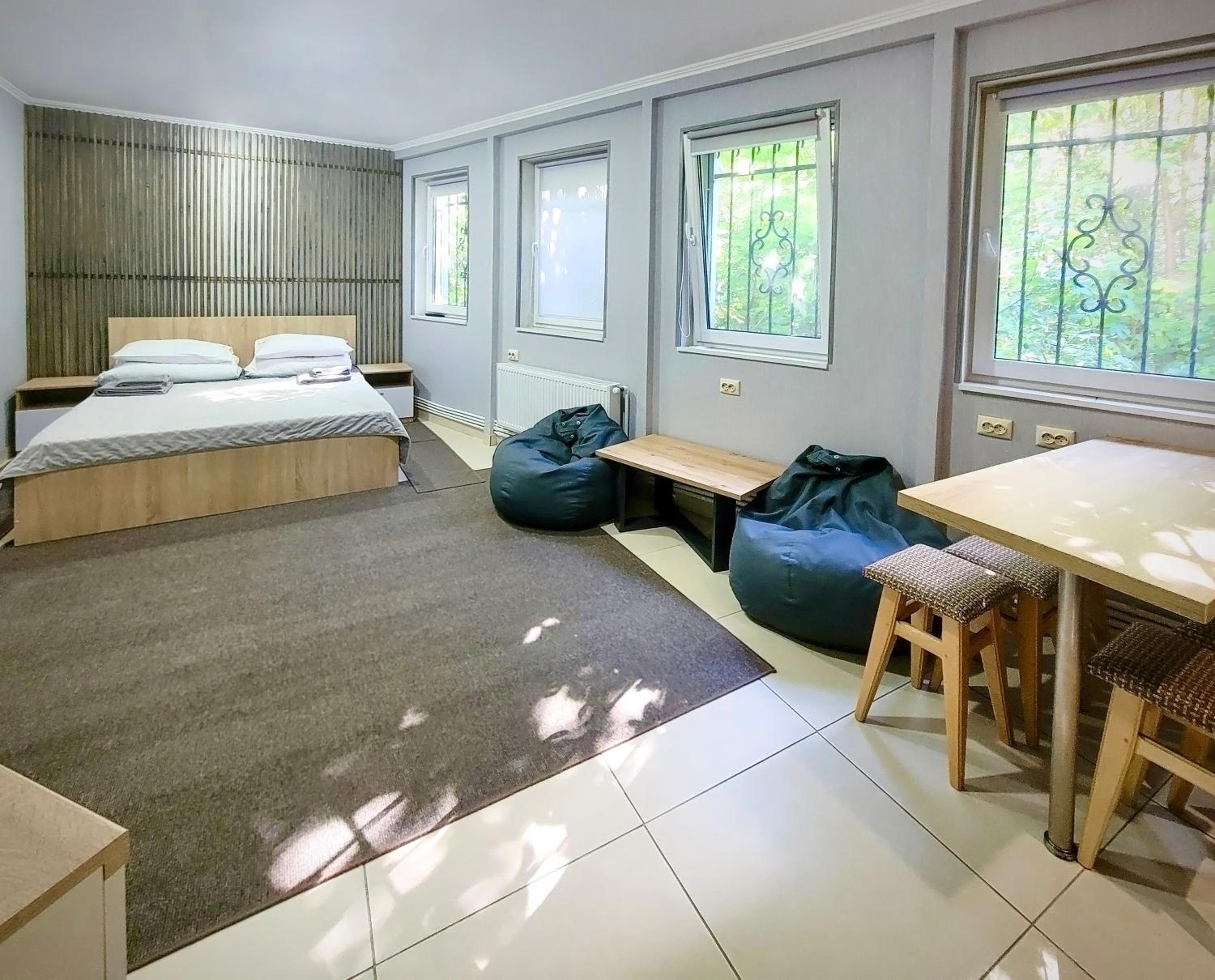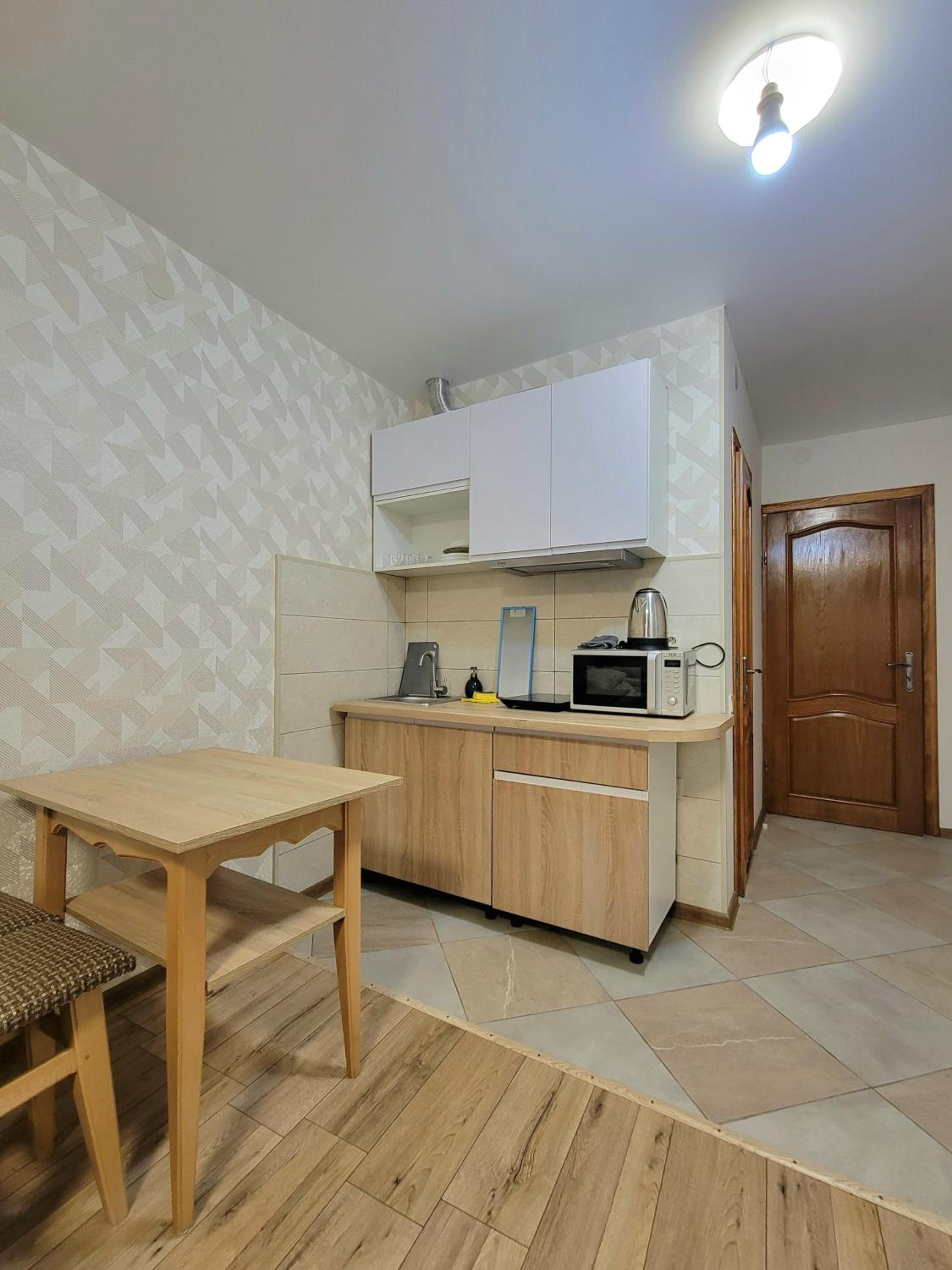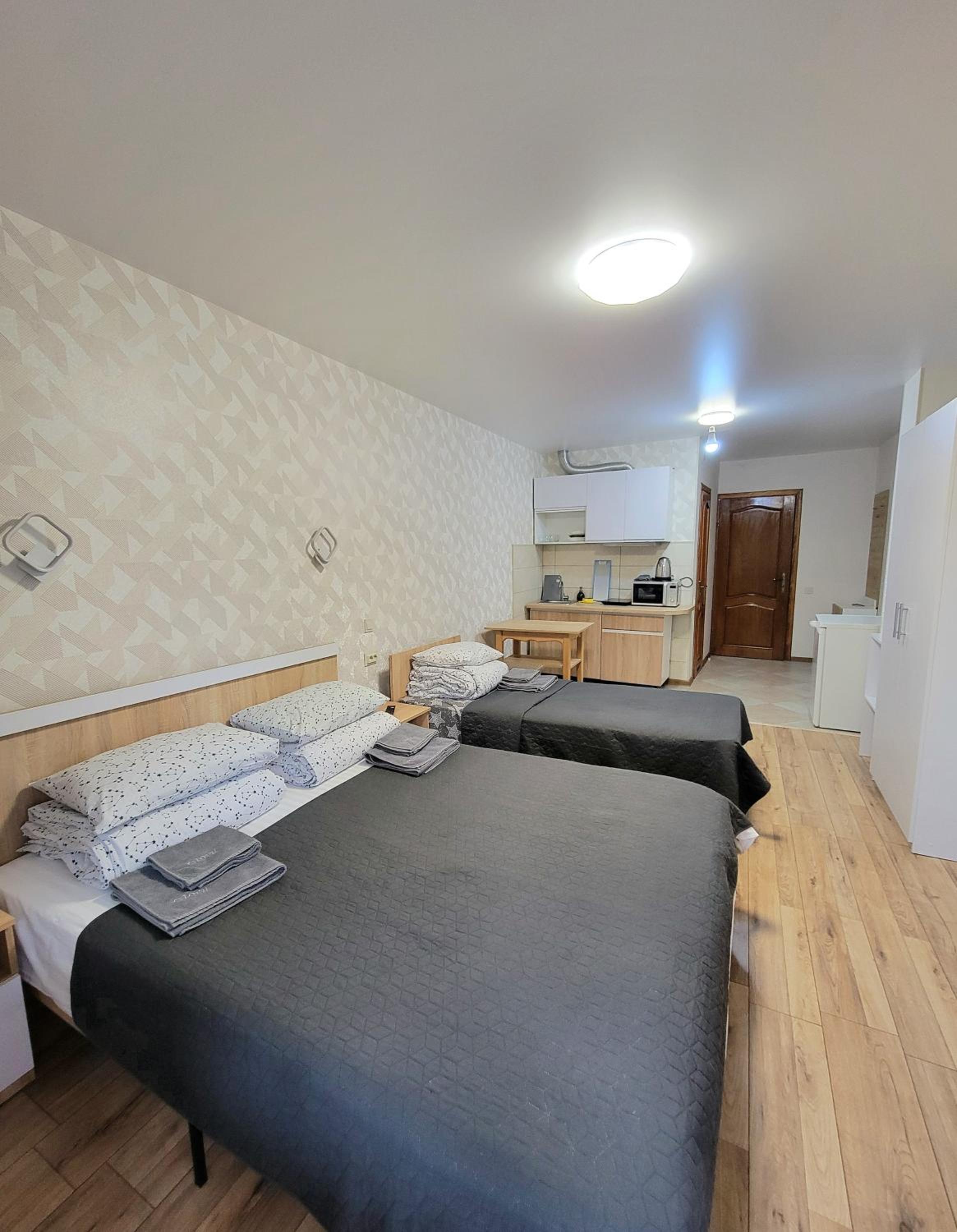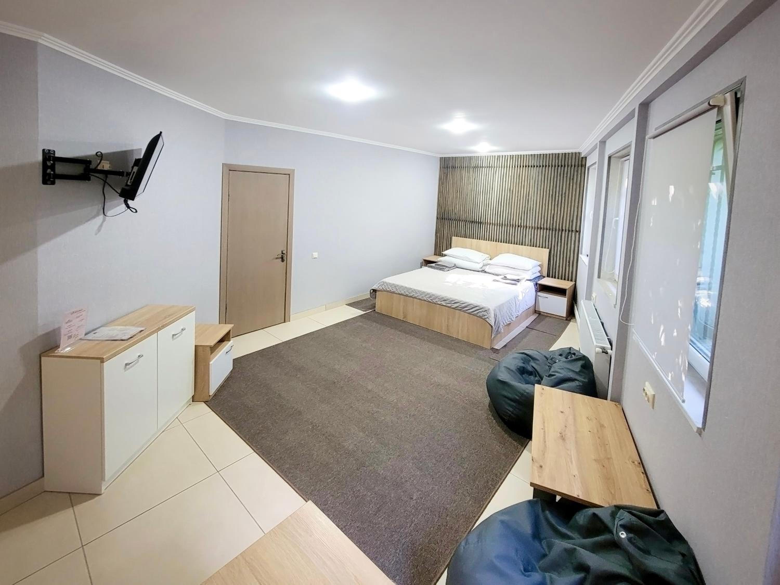 Мешкали в Люксі. Номер комфортний, є невеличкий холодильник, чайник та мінімальний набір посуду. Є кухня з можливістю приготувати їжу, але вона загальна і знаходиться на першому поверсі. Потреби в приготуванні їжі не було тому нас все влаштувало. Є безкоштовна парковка. В нас був пізній заїзд, але нас весь час чекали і були на звязку. По телефону провели кращою і зручнішою дорогою, дали рекомендації де краще відпочити та поїсти. Є безкоштовна парковка.