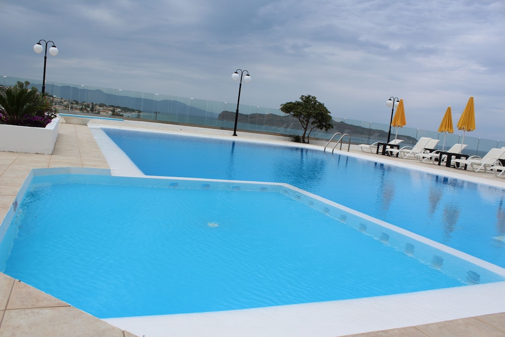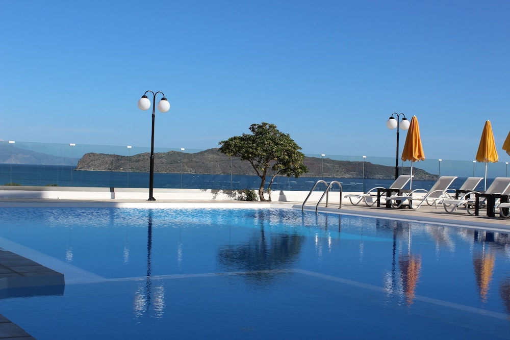 Très belle piscine avec une vue sur la mer chambre assez spacieuse malgré une petite salle de bain mais je crois que c’est la règle en Crète le problème de cette hôtel c’est l’insonorisation on entend absolument tous les voisins qui discutent les chasse d’eau etc. etc. Autre problème le ménage est fait absolument tous les jours même le dimanche à partir de neuf heures on toc à votre porte impossible de dormir et surtout éviter de dîner à l’hôtel c’est vraiment très cher pour ce que c’est il y a plein de restaurant dans le centre bien meilleur et moins cher sinon c’est un hôtel correct avec un personnel plutôt sympathique .