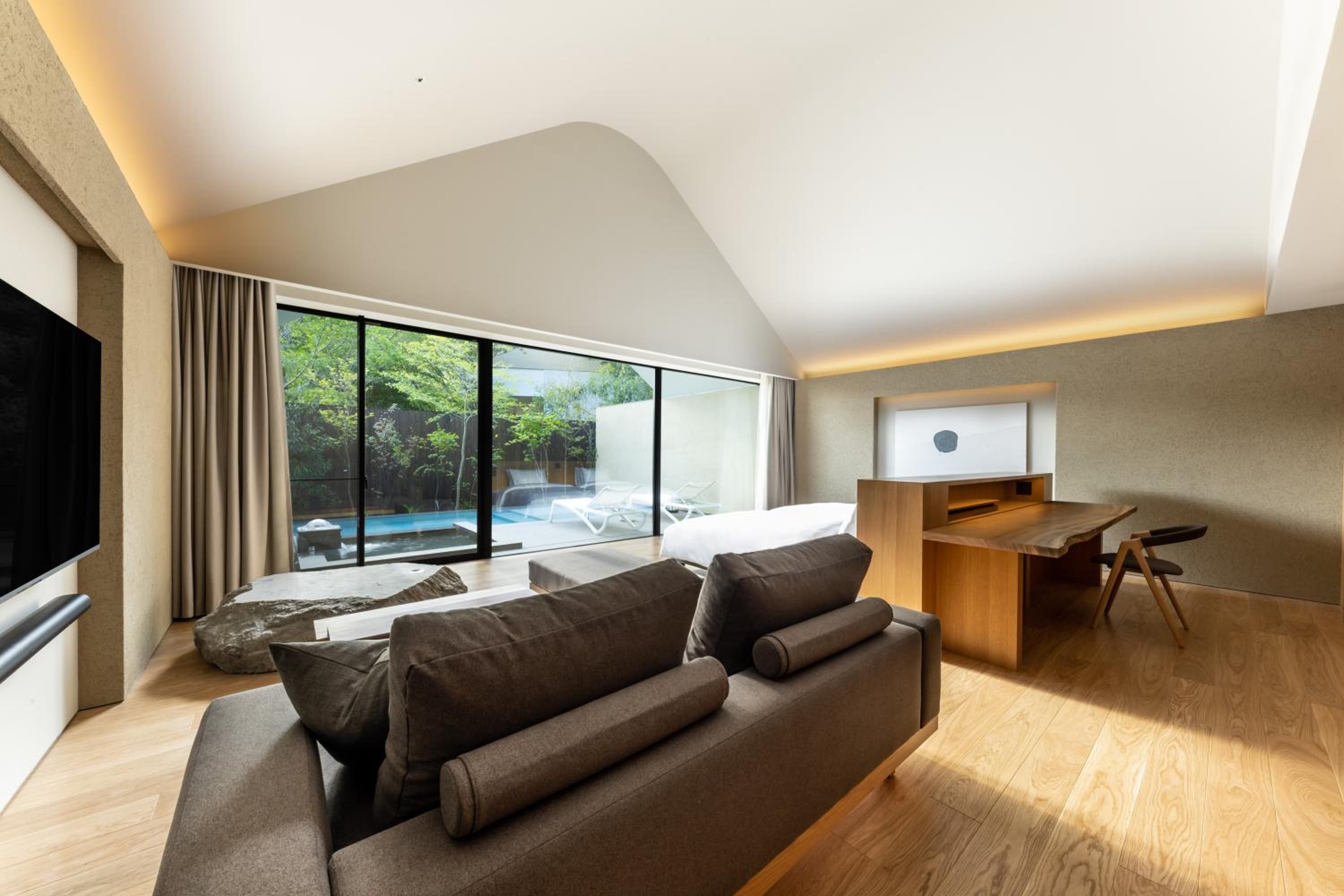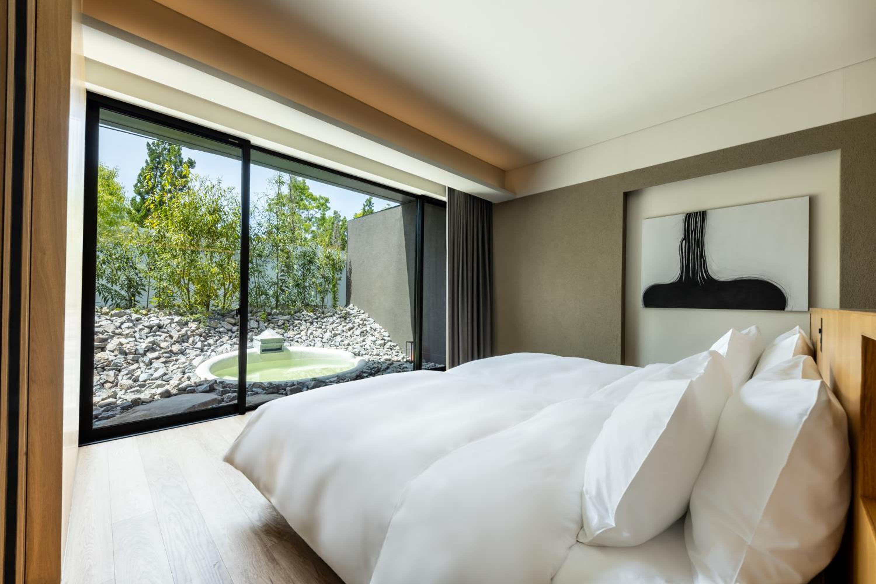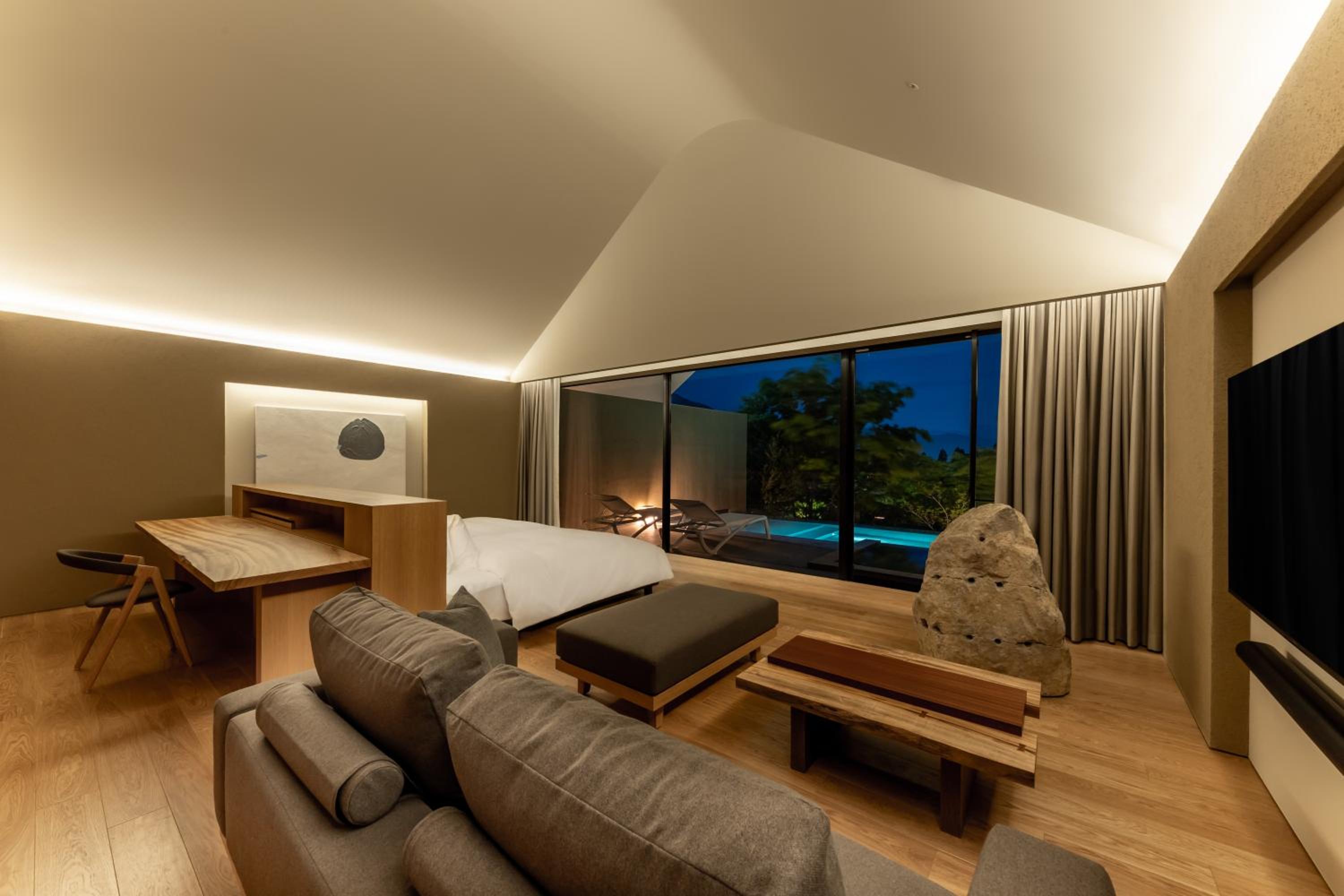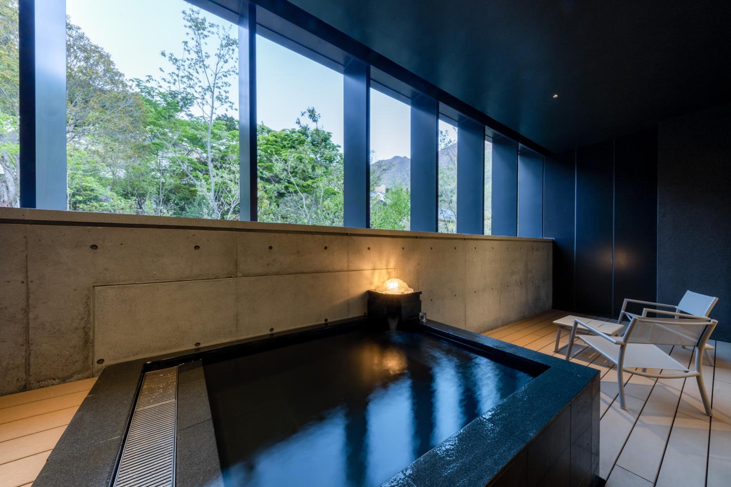 The design and beautiful trees facing the room including a plant in the room. The garden where pre dinner is served is beautiful. Details such as bathroom can access to the onsen pool and every details made the stay rejuvenating