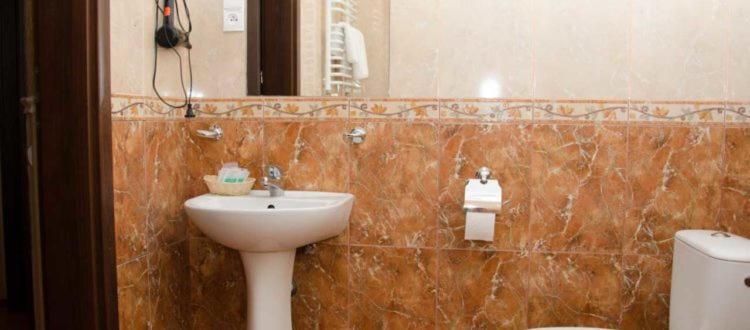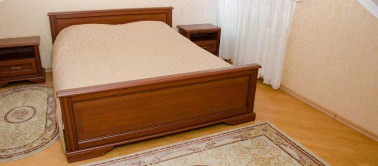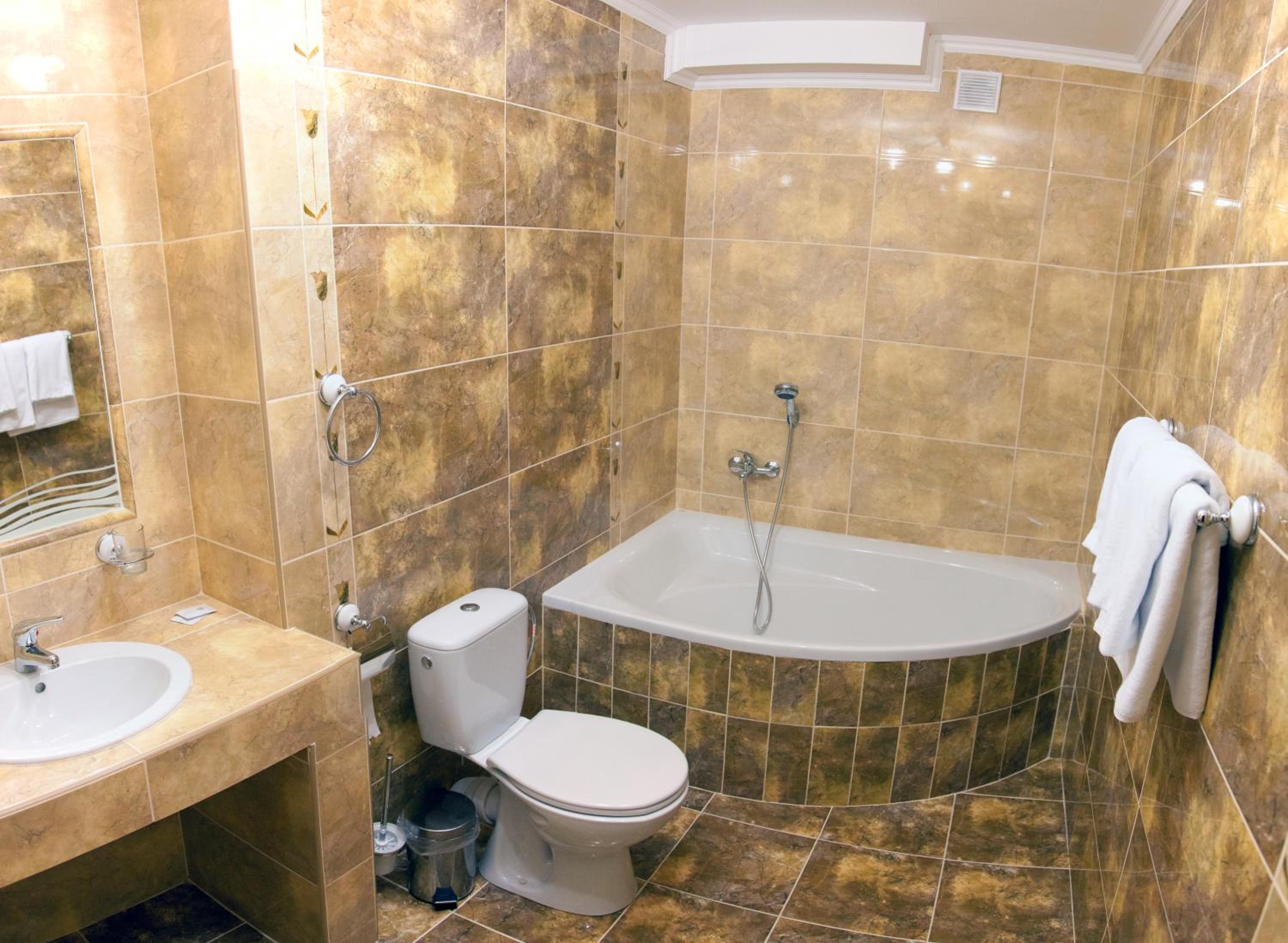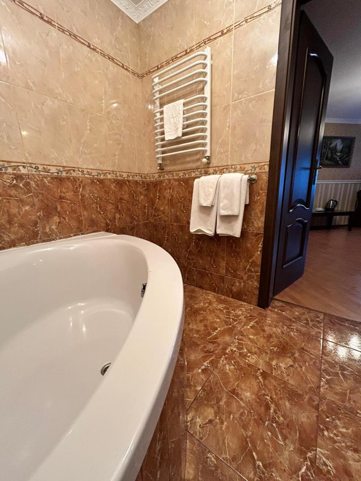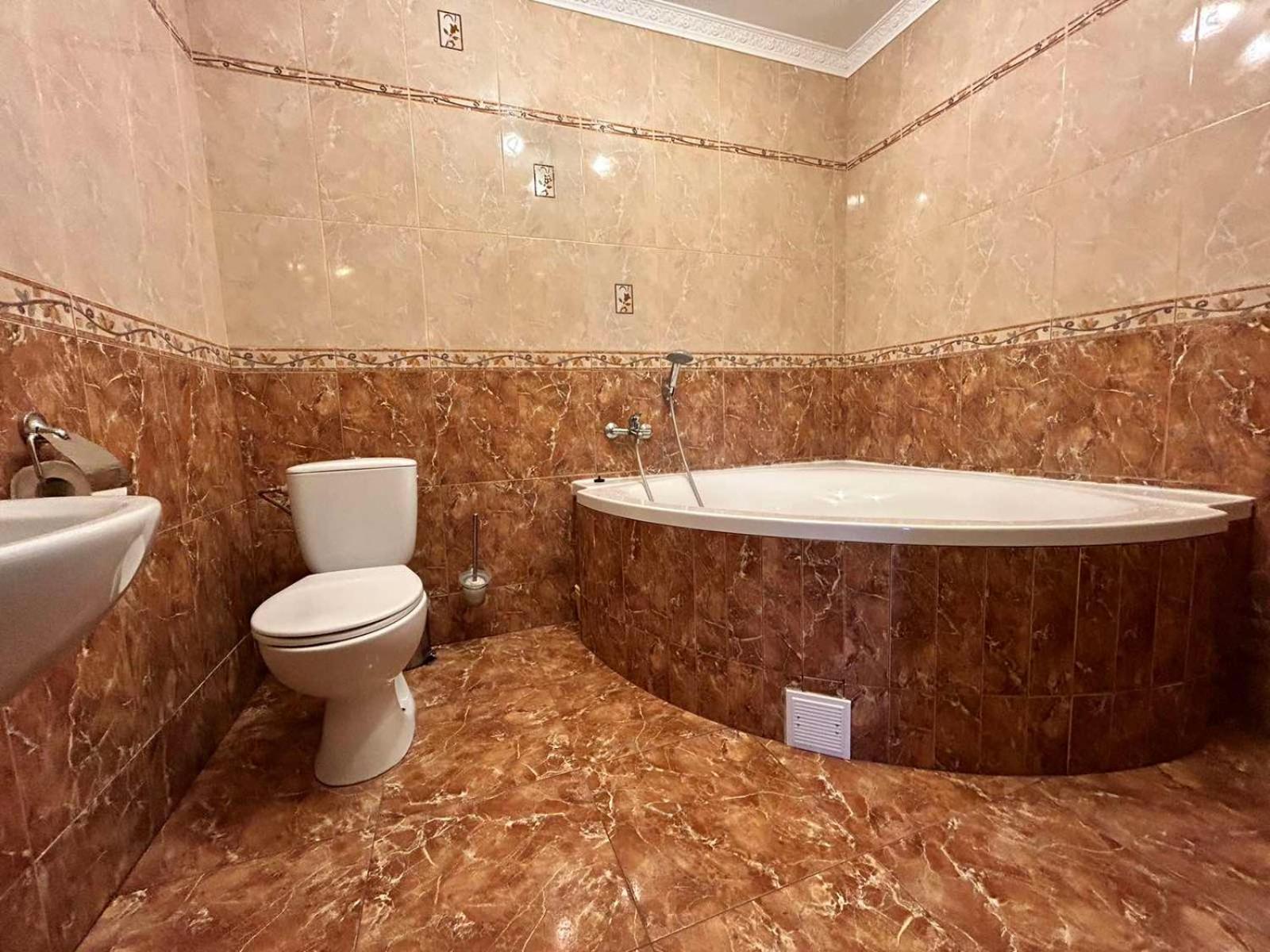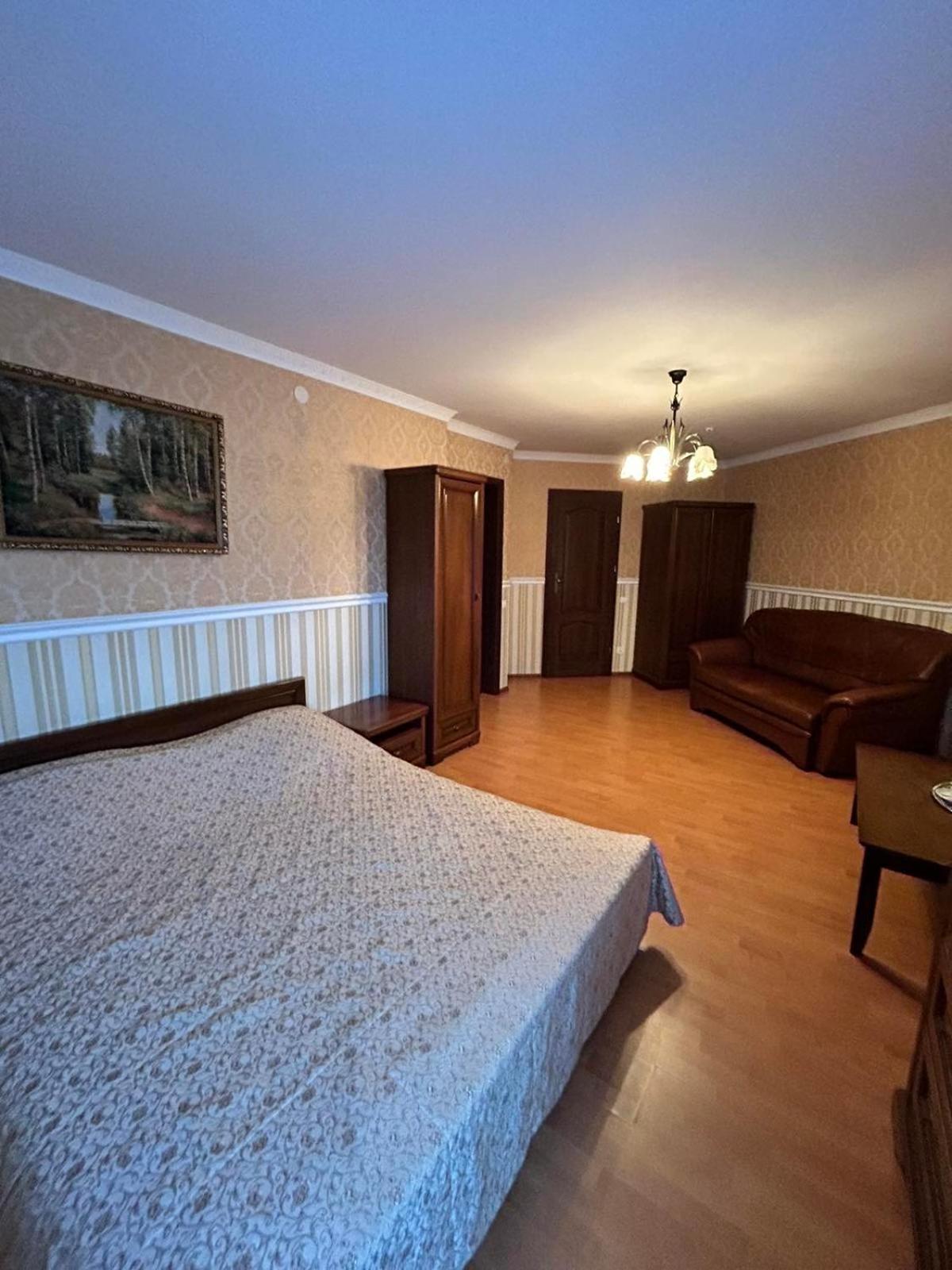 Простора ванна кімната, широке ліжко.