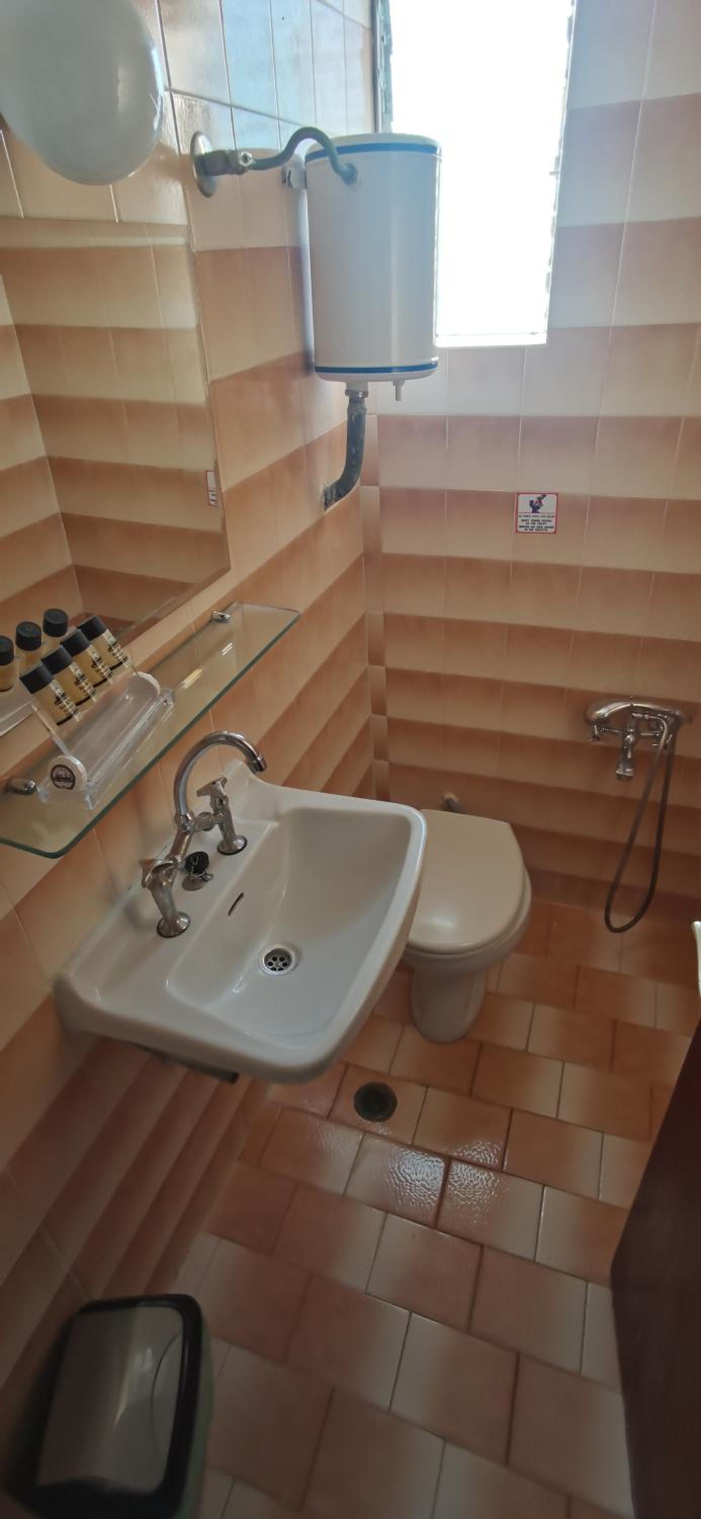 Bathroom is combined with toilet, but water stays on the floor after shower, better tiling could have fixed that. The bed is too short for tall people. Door handles are very old and do not work well.