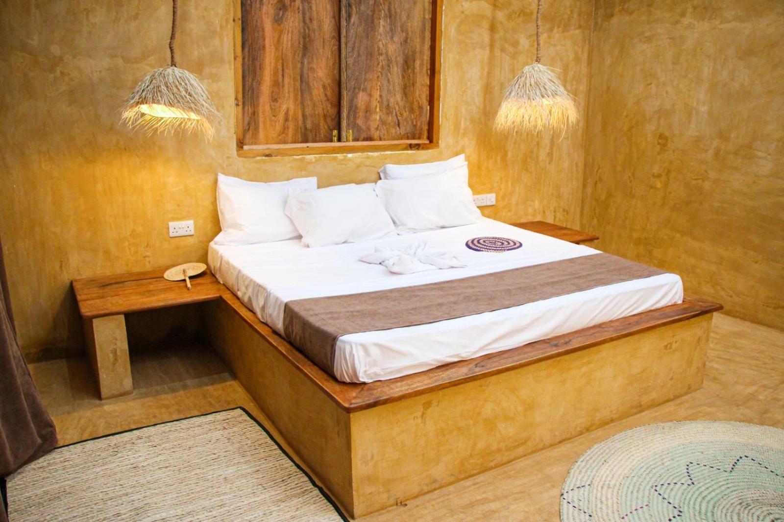 El hotel no tiene grandes lujos pero la habitación es amplia. Reservamos una de dos plazas y una cabaña. La cabaña es de adobe estilo masai sin baño, como experiencia de una noche puede servir, pero son más cómodas las habitaciones. Si buscas un sitio económico que te sirva de alojamiento (sin querer disfrutar de un resort o algo así) es un lugar perfecto, humilde pero limpio, espacioso y con todo lo necesario. Lo mejor para mi las chicas que lo llevan. El desayuno bien también, cantidad suficiente y te dan a elegir como quieres los huevos (fritos, revueltos…). La ubicación también está bien, al final de la playa de Nuwgi, alejado del mogollón de hoteles pero cerca de todo. Al lado de las tortugas. A 10 minutos andando por la playa está el mejor restaurante local, Fish Market. El mejor pescado al mejor precio. Nos encantó!!! Y si sales del Fish Market por la carretera hacia el pueblo, todo recto hasta llegar al mismo poblado, encontrarás una casa que vende bolsos de mimbre/ paja hechos por ellas mismas a un precio de 35.000 chelines tanzanos (unos 12 € al cambio) ideales!!!