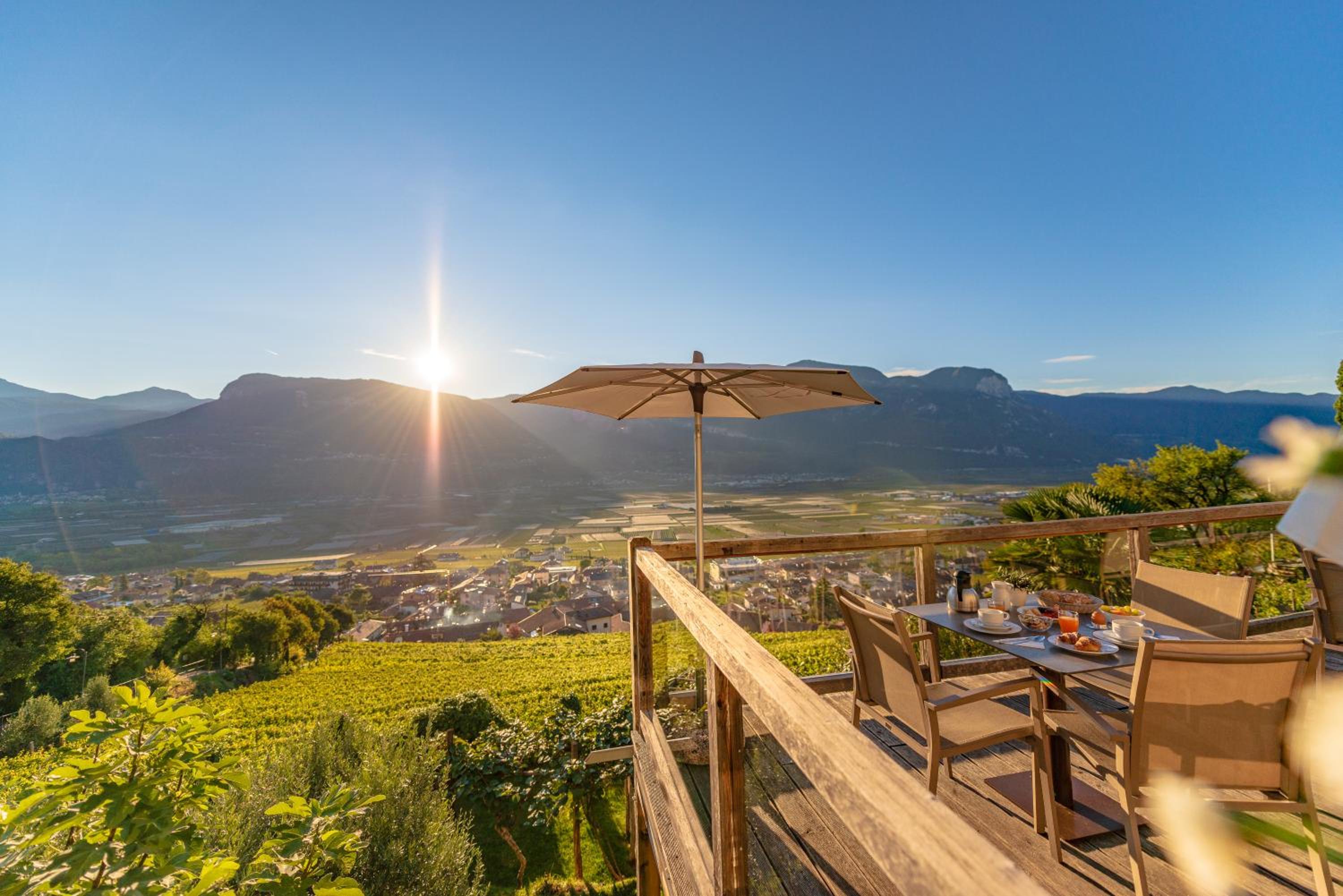 Hotel Panorama, a family-run gem in Termeno, offers stunning views of the Adige River valley. Guests can unwind in the swimming pool and Finnish sauna set in the expansive garden.