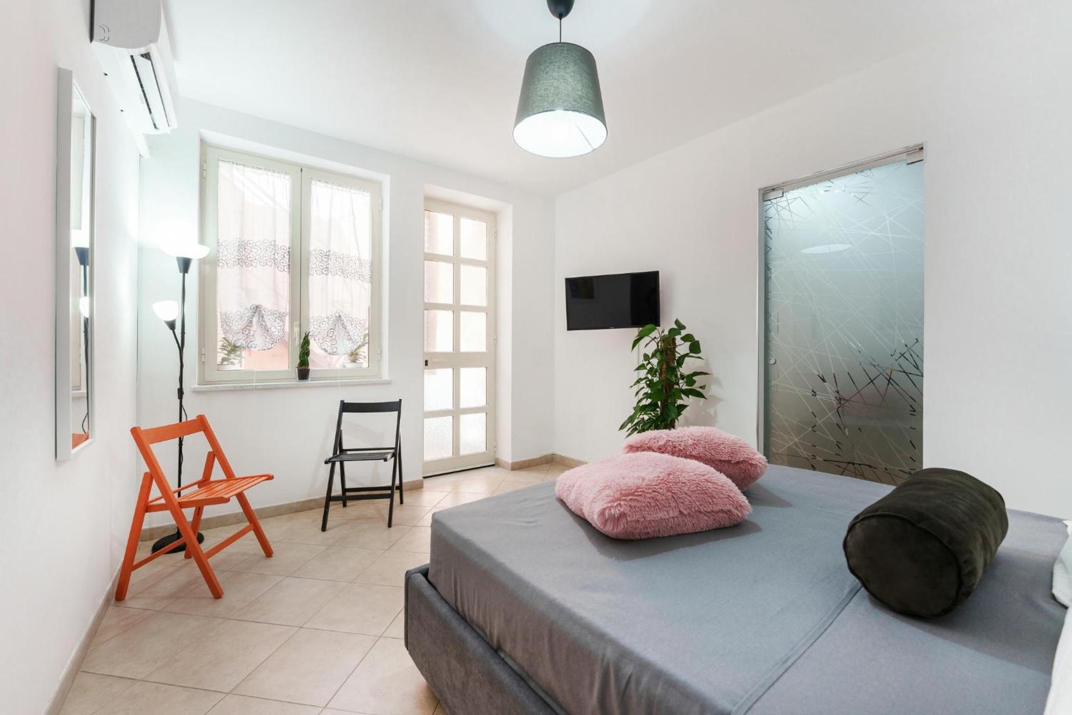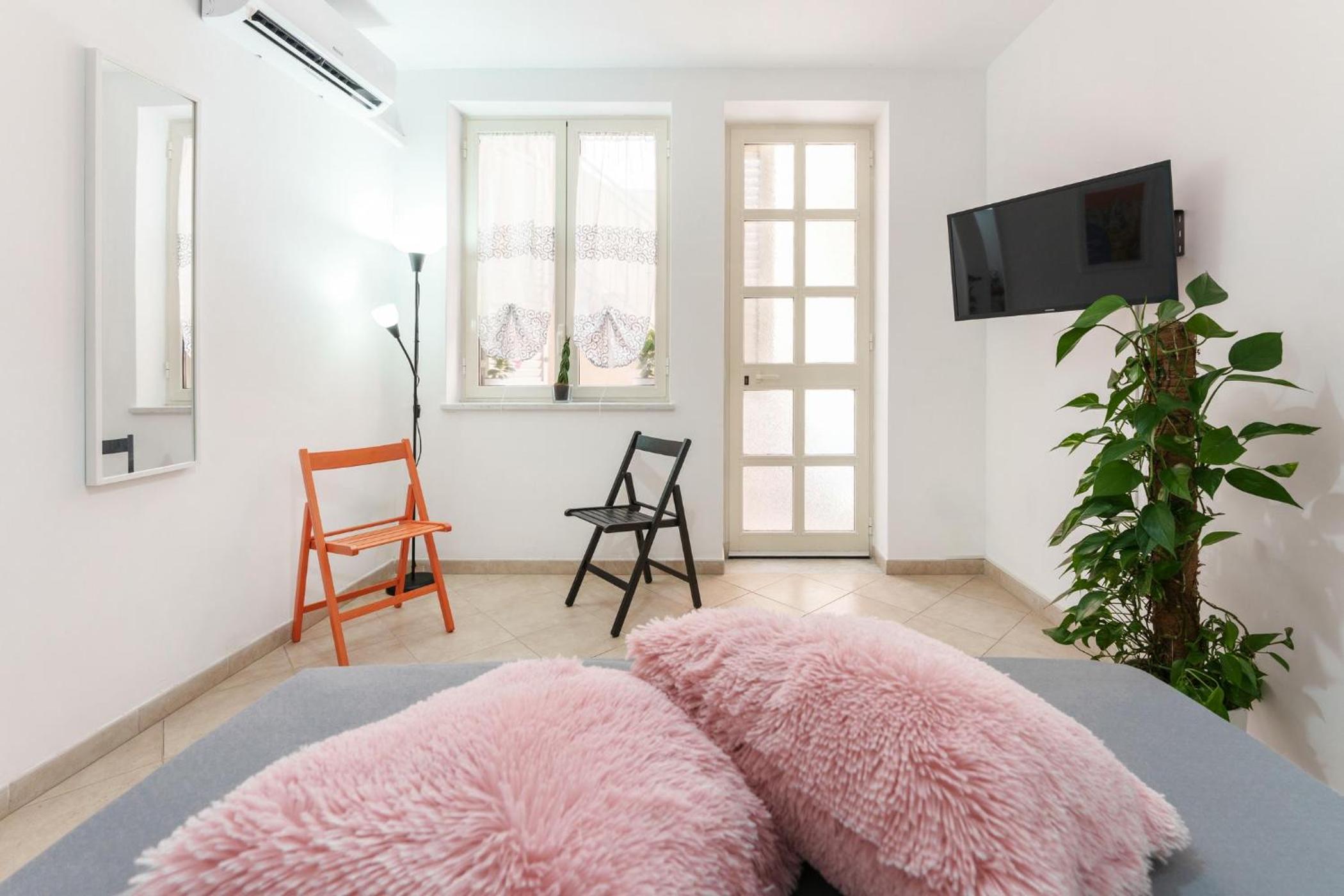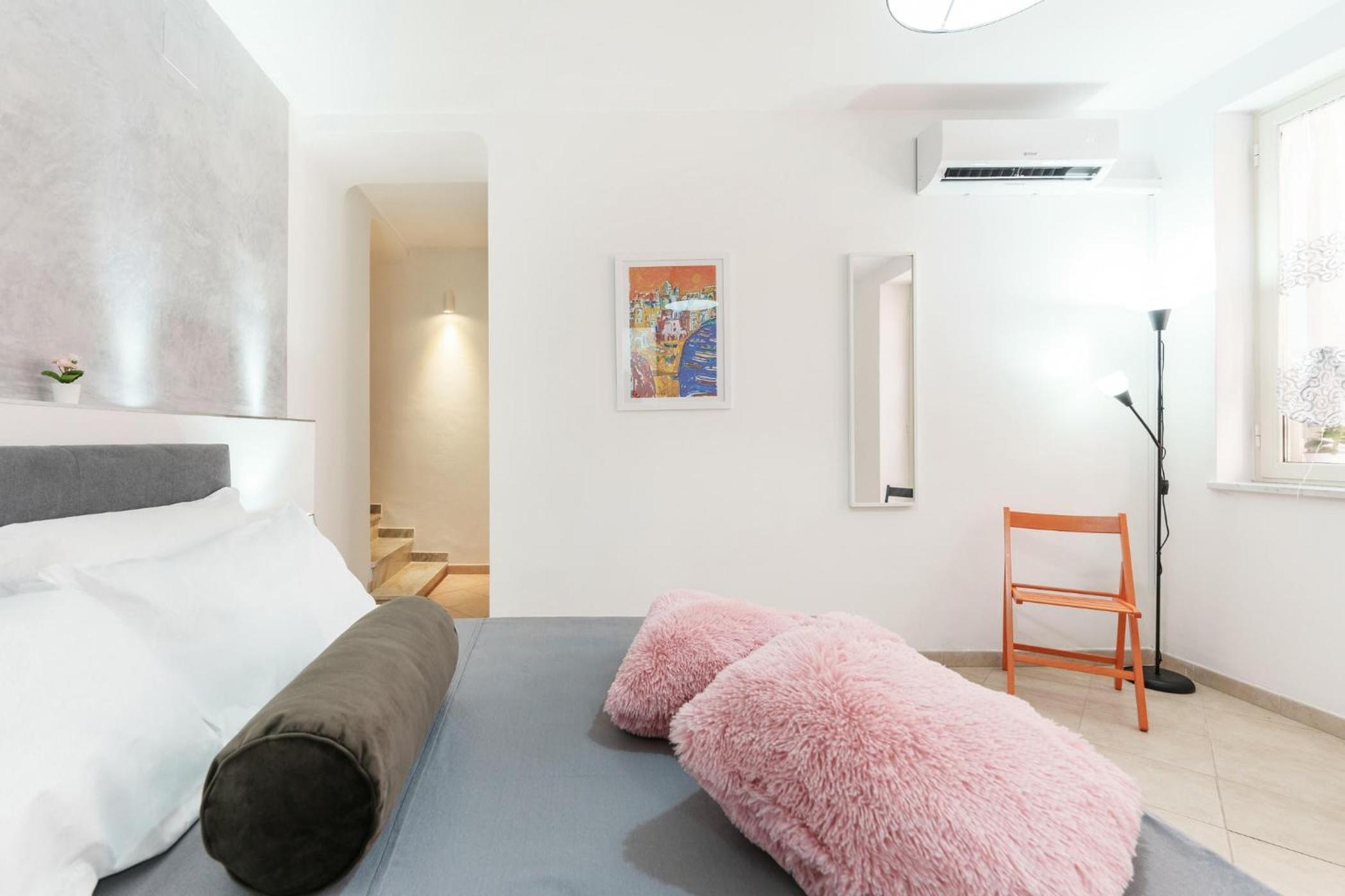 The room/flat is beautifully designed. Pretty, modern and very clean. Plus, it stays cool in the heat even without AC (but it does have AC).
