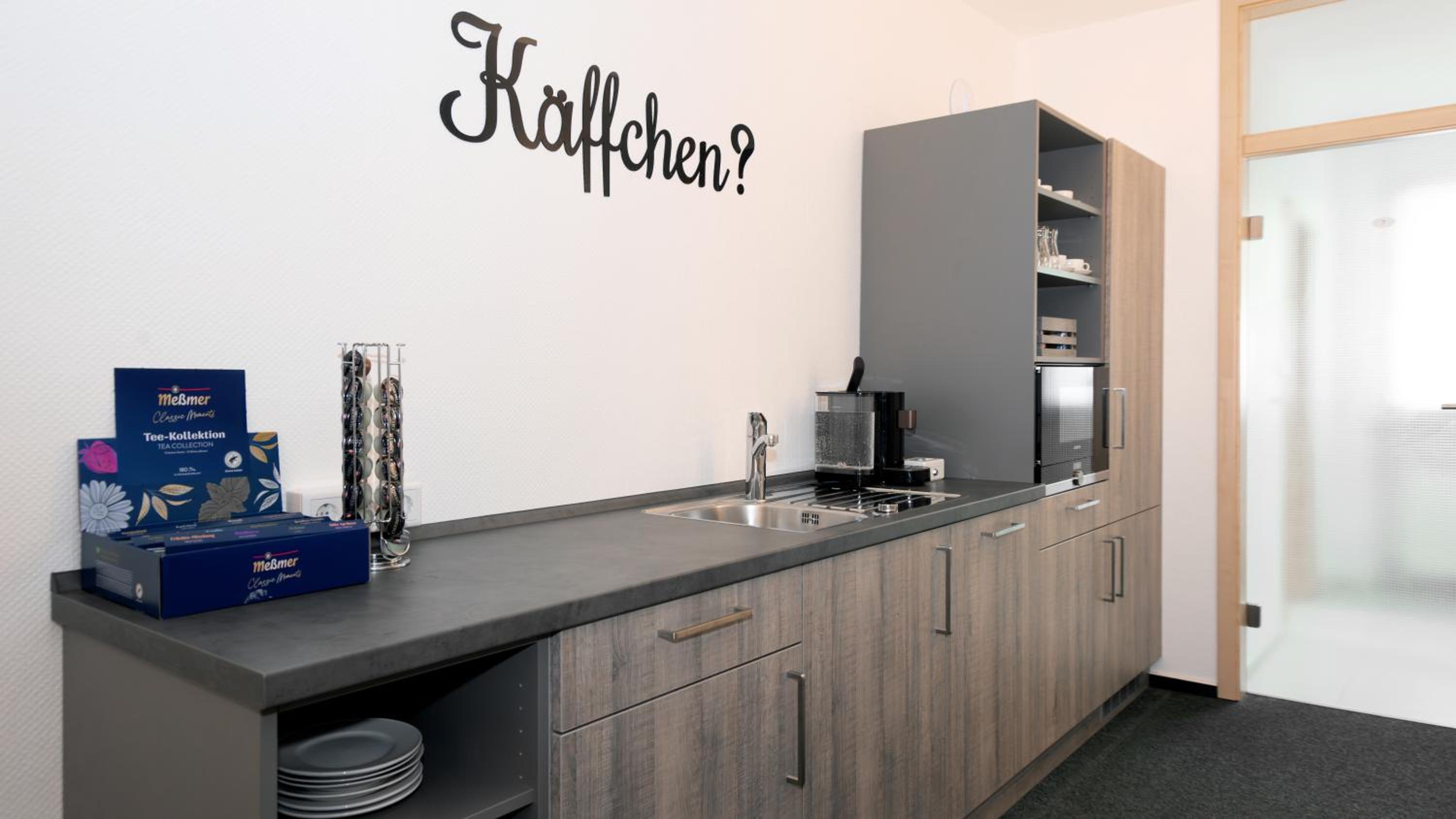 Vor der Tür. Wir sind mit Bus und Bahn gekommen, was auch gut ging. Ein toller Service ist die Tee-Kaffee-Bar. Die Küche zur Selbstversorgung ist gut ausgestattet. Persönlicher Tipp: Das nahe gelegene Restaurant Maas-Timpert.