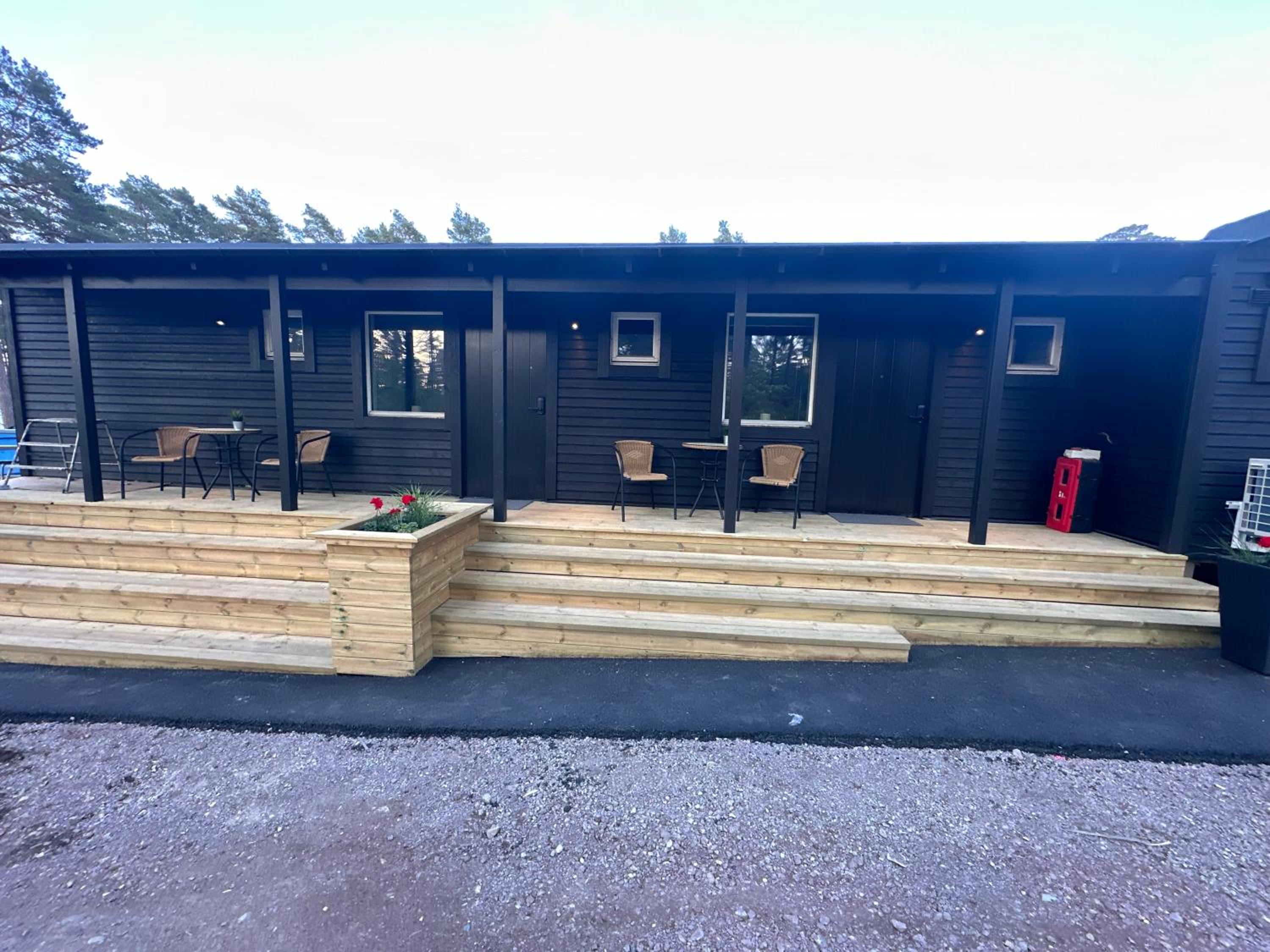 Very clean and new lodge in a quiet location although next to the road. Convenient free parking in front of the door. Big terrace facing west (sunny in the afternoon).