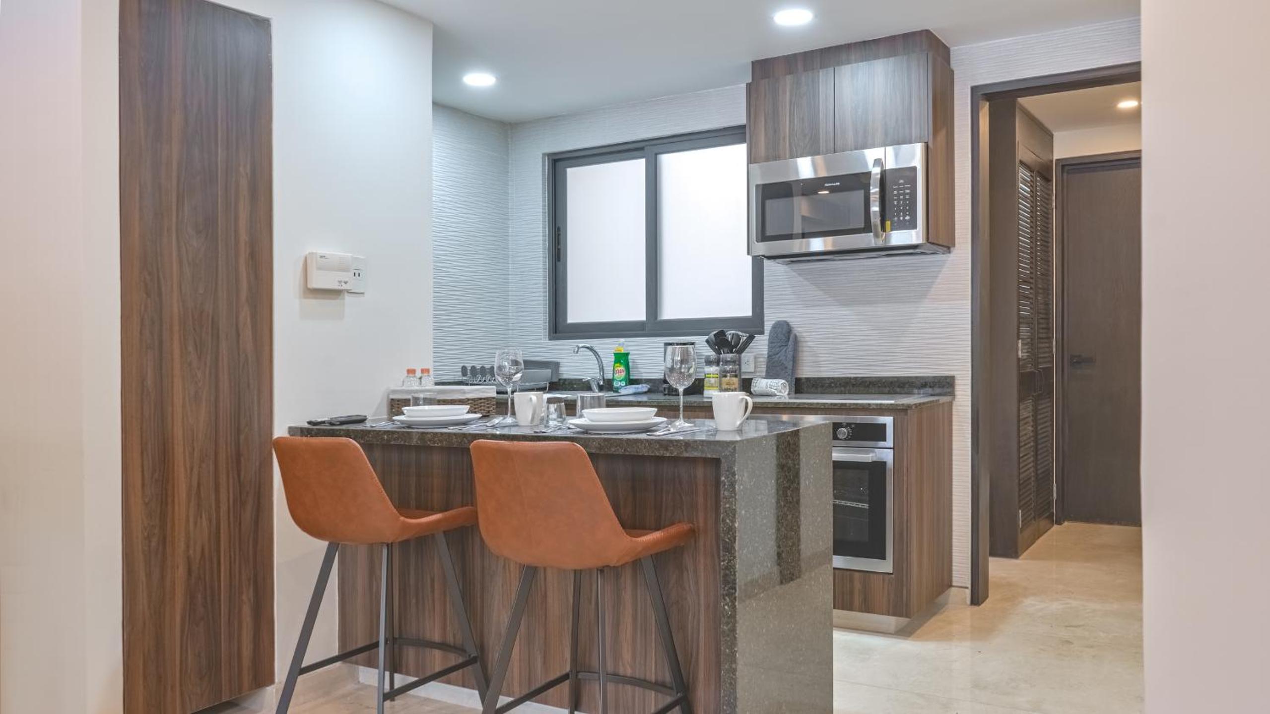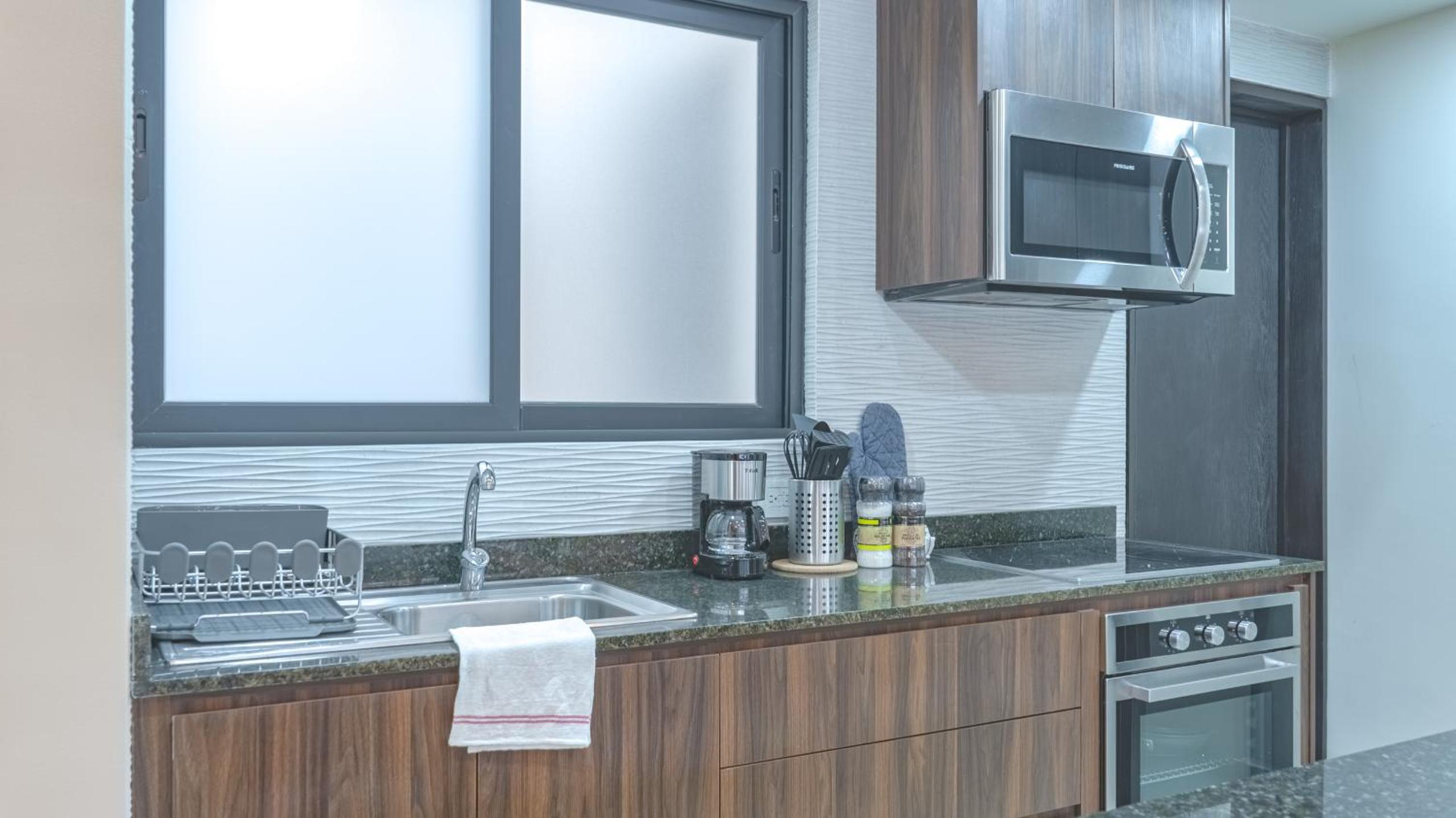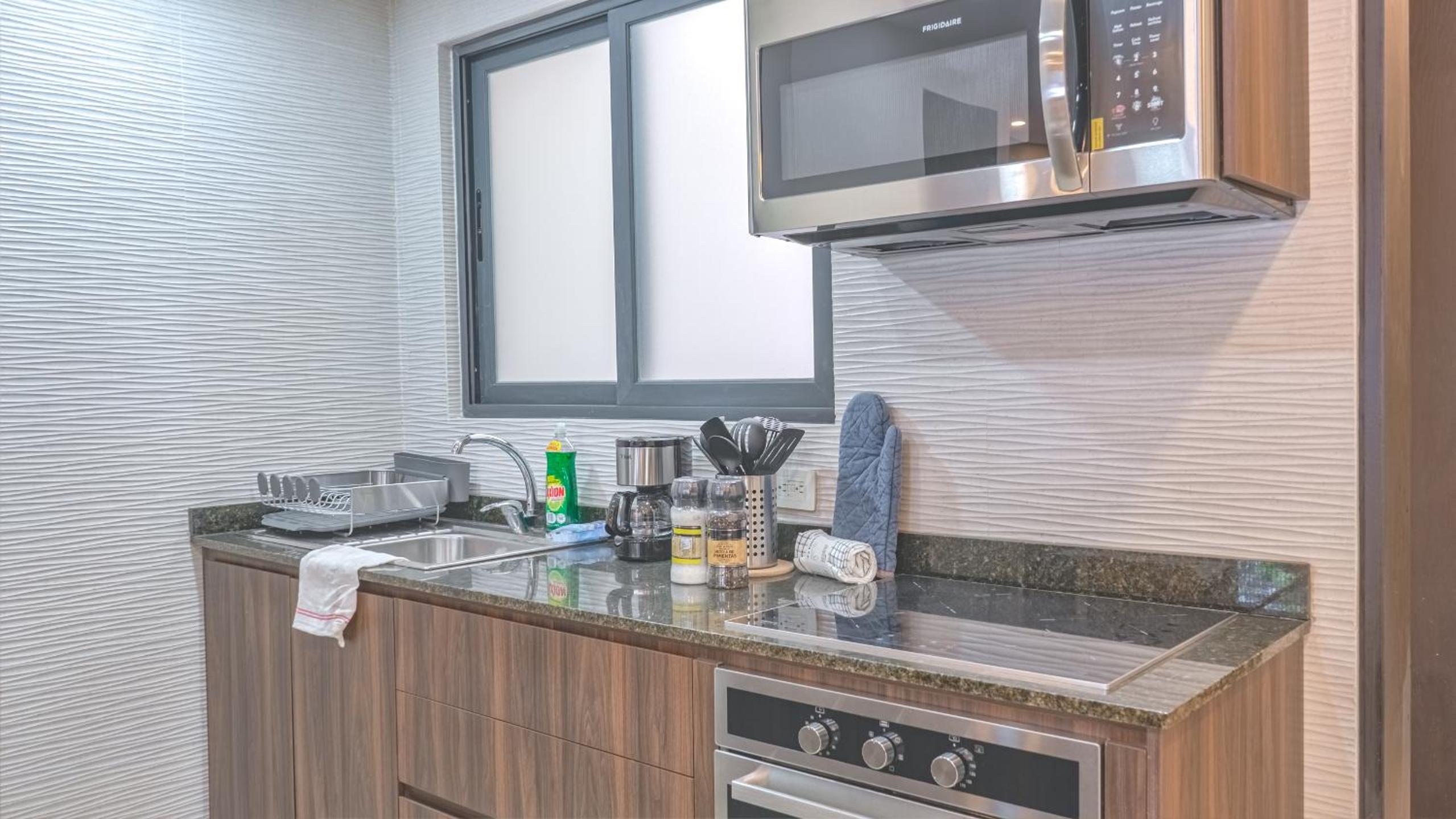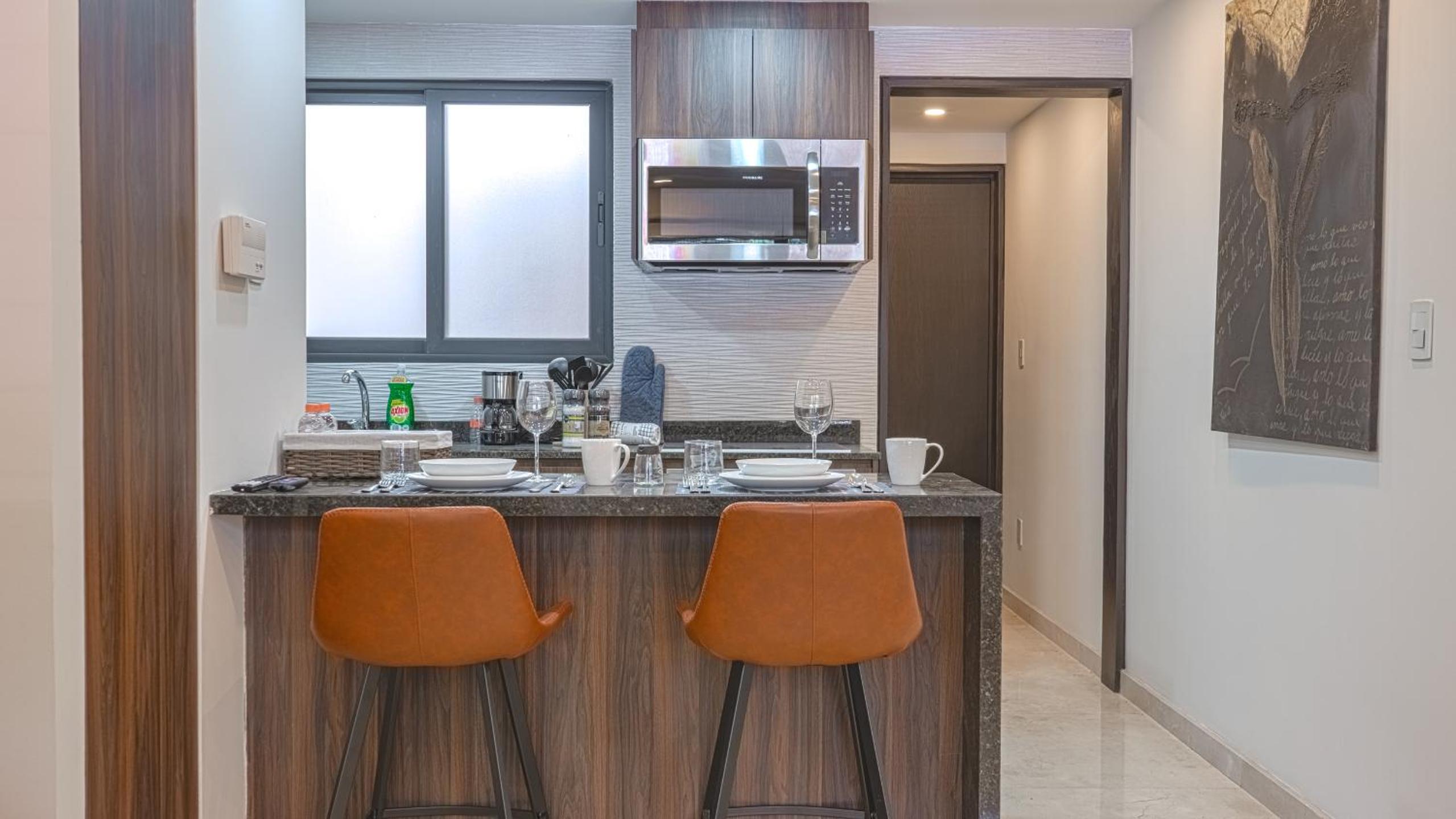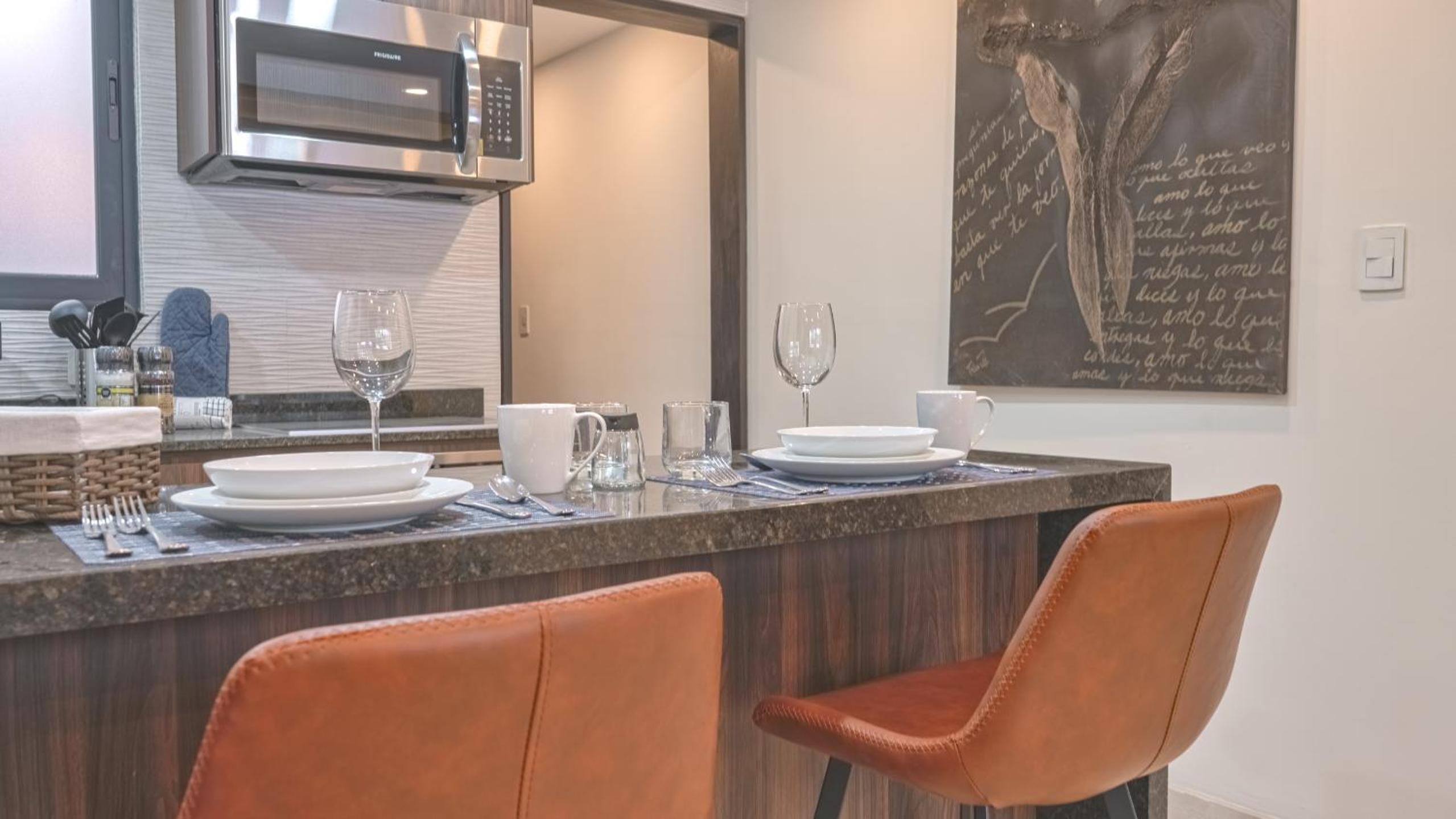Modern Amenities: Our aparthotel offers a comfortable stay with a flat-screen TV, kitchen with top-notch appliances, and free WiFi. Relax in the seating area or pamper yourself in the private bathroom with premium toiletries.