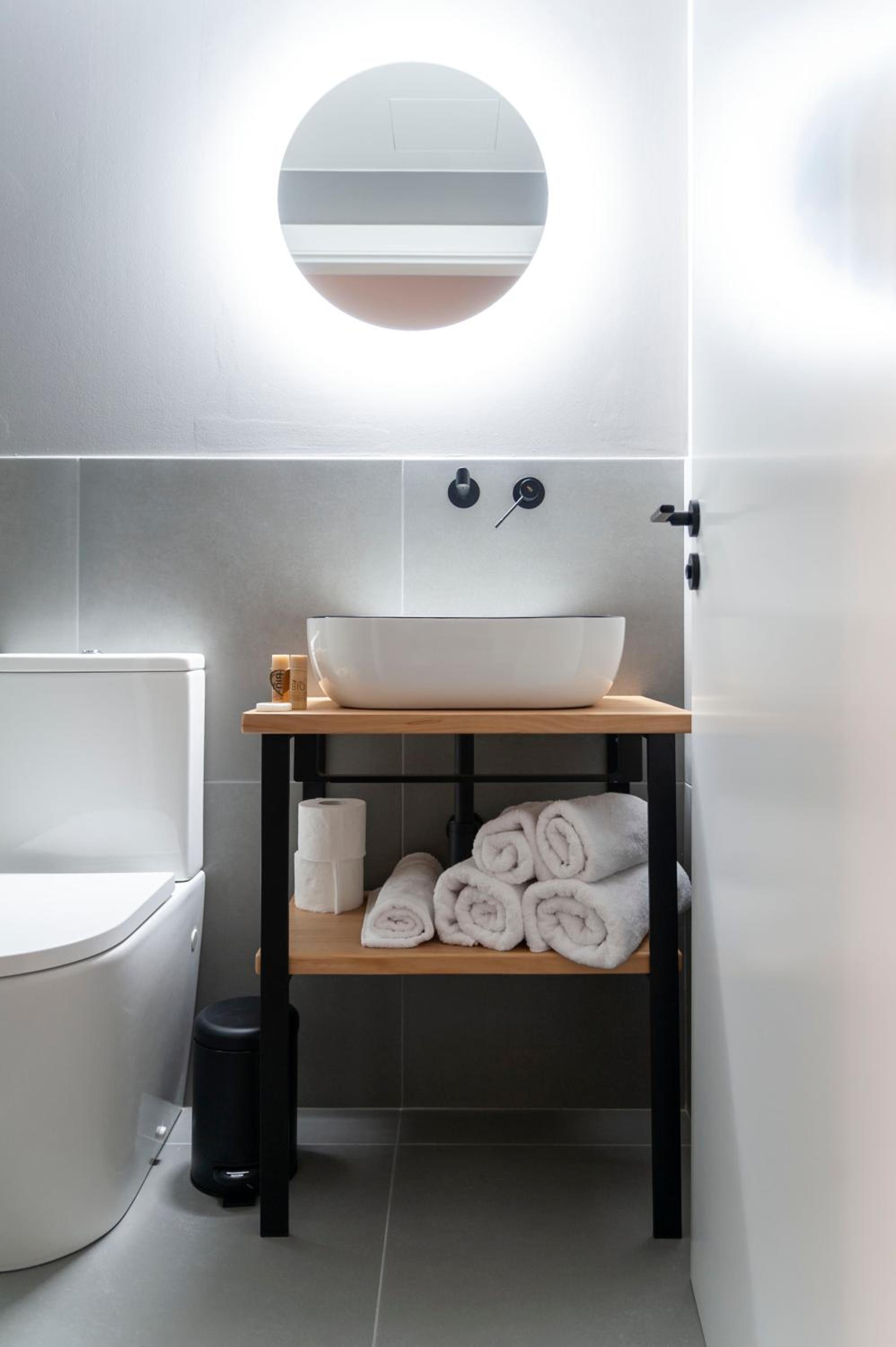 Modern immaculate apartment rooms. The bathroom was spacious with a fabulous big walk in shower. Bottles of water provided. We had breakfast which was lovely.