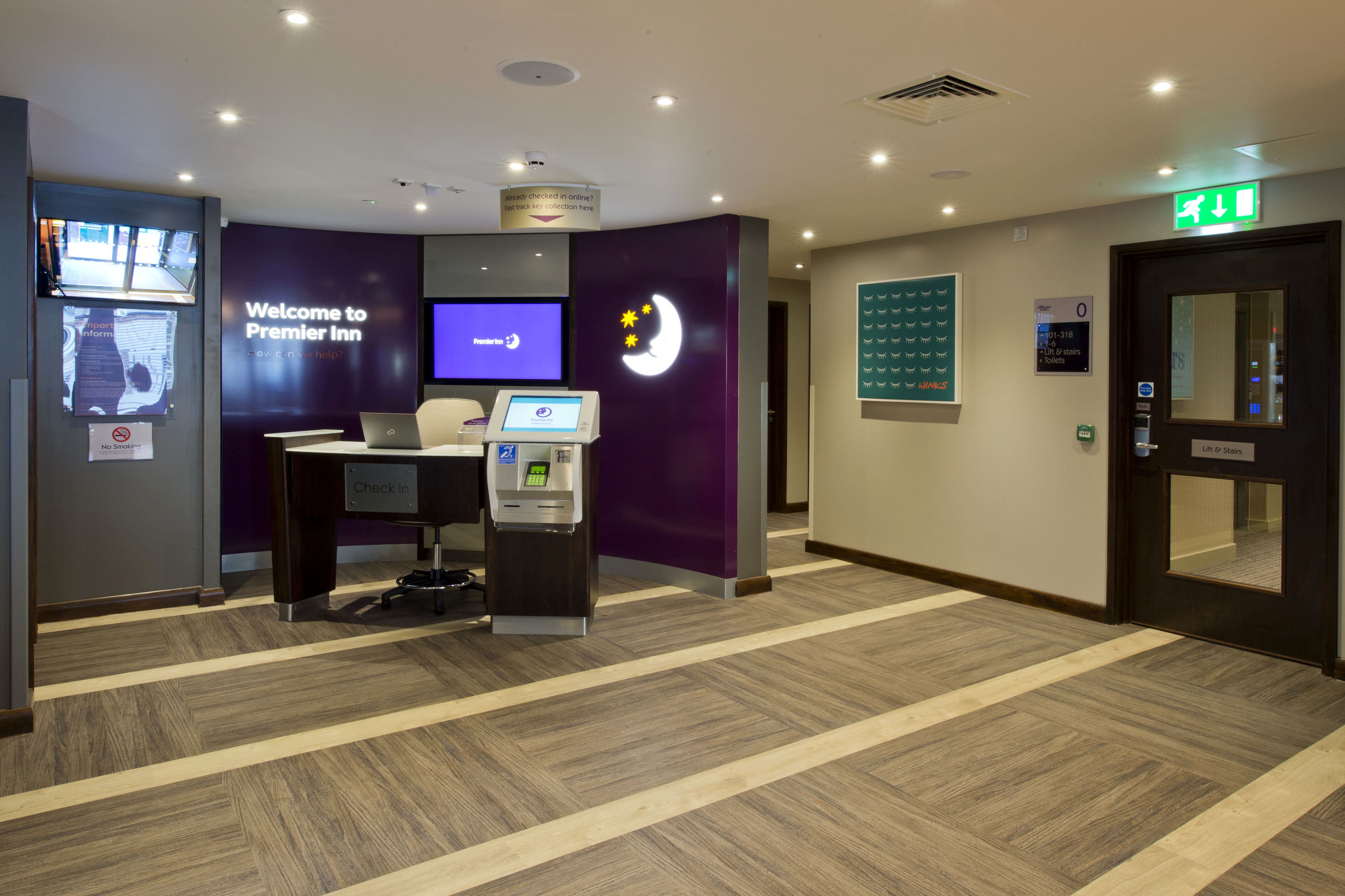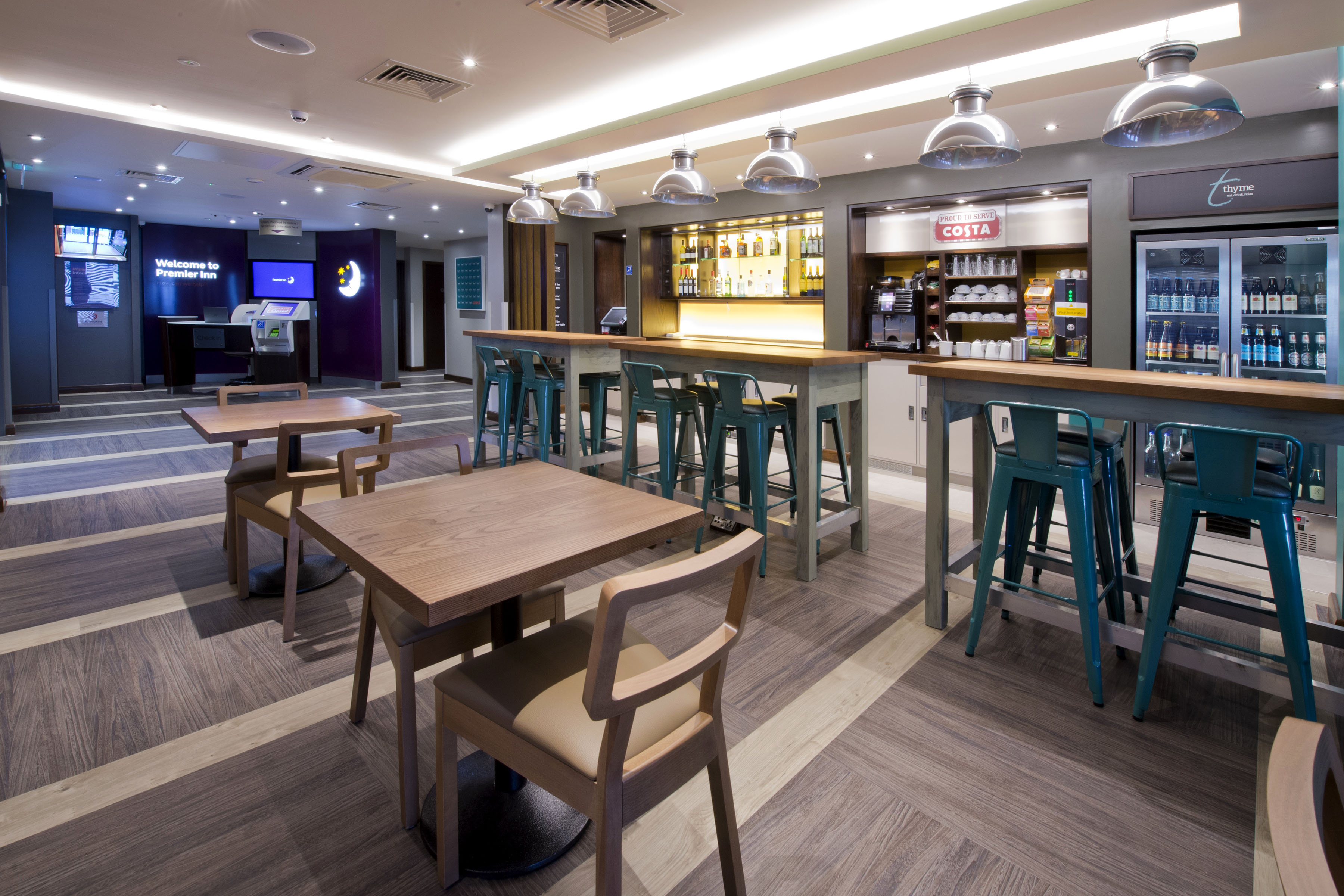 Reception looks downright shabby with broken check in equipment and keycard drop box sellotaped together. Nobody on reception, door to office wide open revealing disgusting state of room. Someone (friendly nevertheless) not in uniform checked us in after checking with an invisible person around the corner where to find our key. Room was clean, and quiet as requested. However it was looking a bit old and dowdy, as was the bathroom. Loud squeak on door, old fashioned shower curtain over a bathtub. No hangers. The pillow menu bag was soaking wet underneath - condensation? Perhaps housekeeping should be checking this. Also there was only one large and one small towel for two people. We would have reported this to staff if we had seen anyone on reception the whole time we stayed there. Luckily it didn’t really matter as we didn’t spend much time in the hotel. The cost was high in comparison to the standard we would normally expect from Premier Inn.