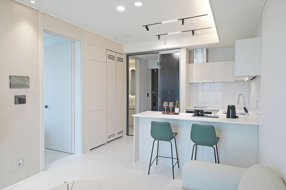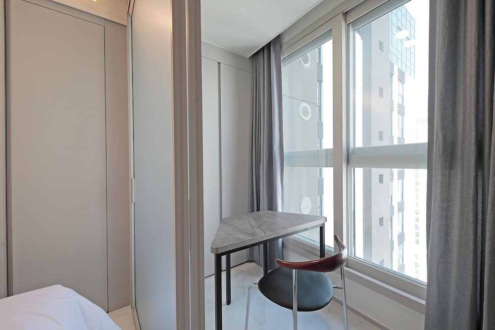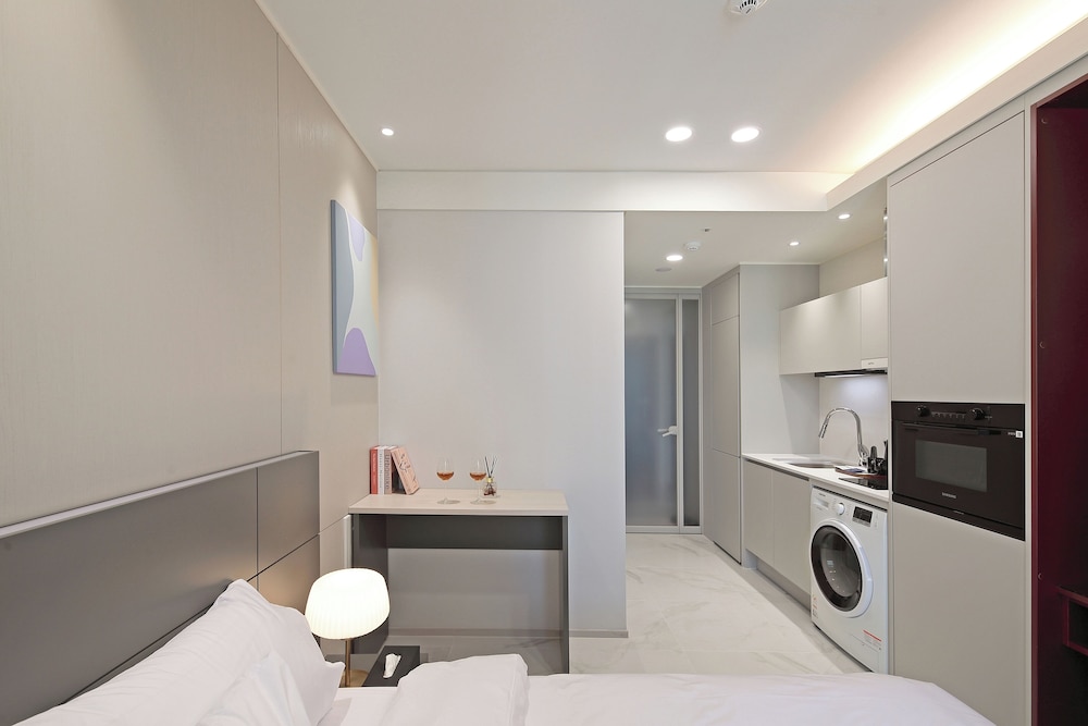 If management can fix their check in process and hire more staff, this can be a great property. They want to use a kiosk to check-in and you get a flimsy receipt paper with a QR code as your key. If it gets wet in the rain or wrinkles so the QR fades, you need a new one. Or, they force you to download some app in Korean- no one wants more apps on their phone just to check in and check out. Housekeeping is default none unless you request it in the app before 11pm. No breakfast (not a great one to begin with) on Monday. You cannot use the stove top and cook. There are no dishes or silverware if you want to eat any food leftovers or order in food either. Otherwise, new nicely built apartment hotel with lots of closet space, large refrigerator, and washing machine (500won for detergent). Reception desk is tiny. Breakfast needs more staff as this is a 30 story building and they only had one coffee machine and one person trying to refill everything and clean and fix the coffee machine.