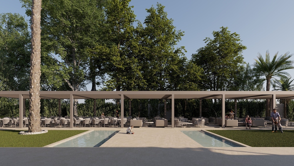 Der Außenbereich ist gepflegt, mit vielen Liegen und Lounge-Möbeln. Der Hauptpool ist oft überfüllt mit Kindern. Musik läuft abwechslungsreich.