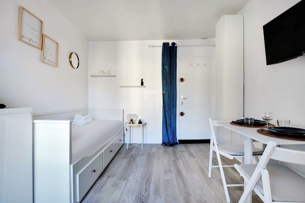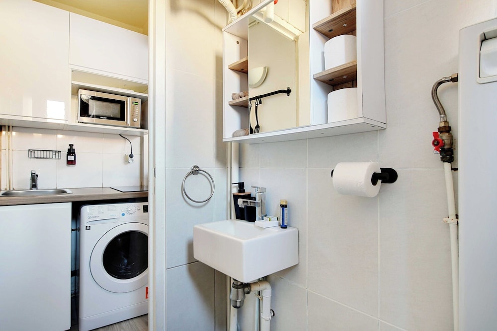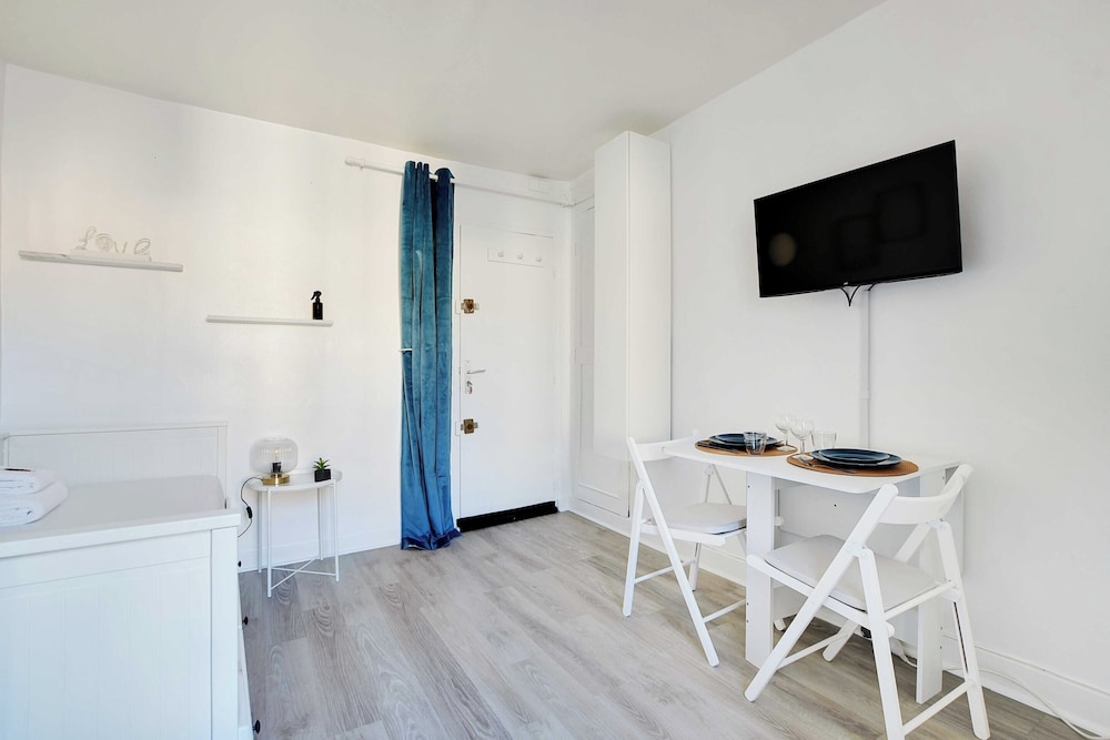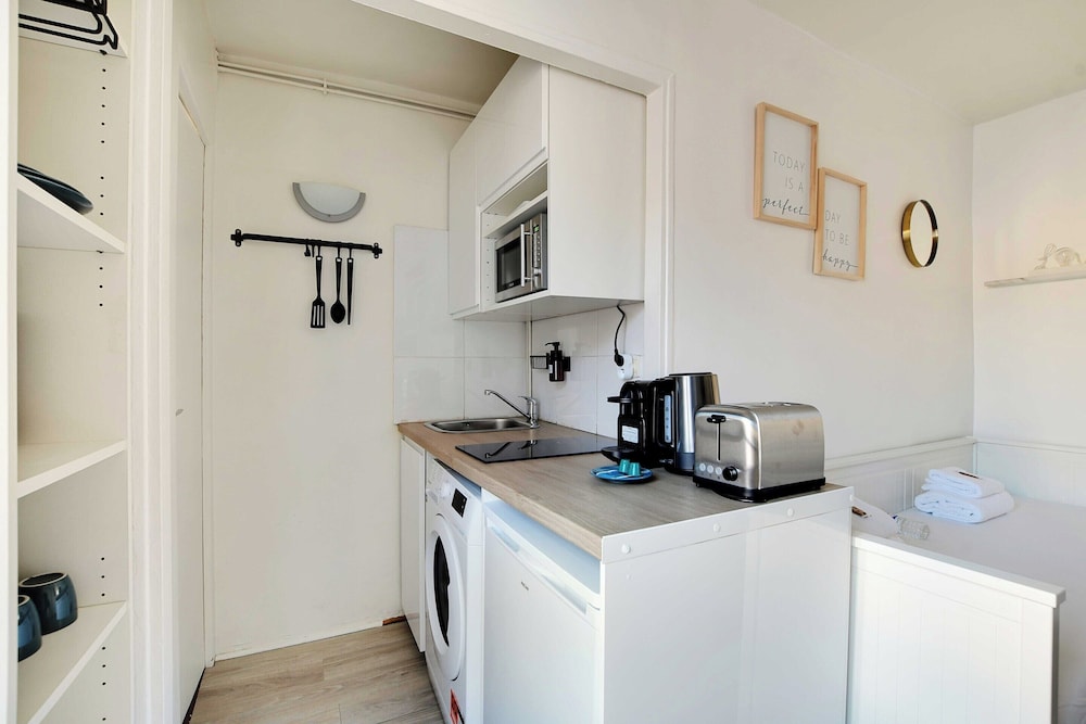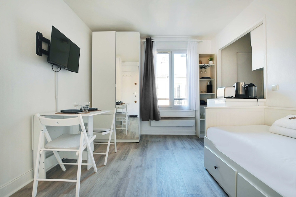 This was a great little apartment in the heart of Paris. The kitchen and washer were really helpful in our stay. Communication was good and access was easy. There are a couple grocery stores nearby, and close bakeries for a morning croissant or baguette. Also, easy access to the metro and buses. Be warned, it is on the 5th floor with 85 steps up. Yes, we counted. Also, there is no dryer, just a drying rack for clothes. It worked out, just plan ahead. The bed is a pull-out trundle that opens to make a queen-sized bed for two. No A/C so we kept the windows open. I would stay there again.