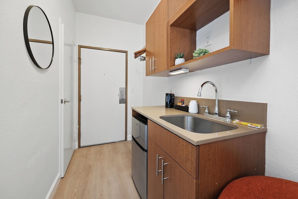 I only stayed one night, I reserved the full size bed studio. it was small, quiet, clean and staff was friendly and helpful. Traveling alone I would stay there again. didn’t get to spend any time around the area but plenty of places right outside to walk to, nice neighborhood