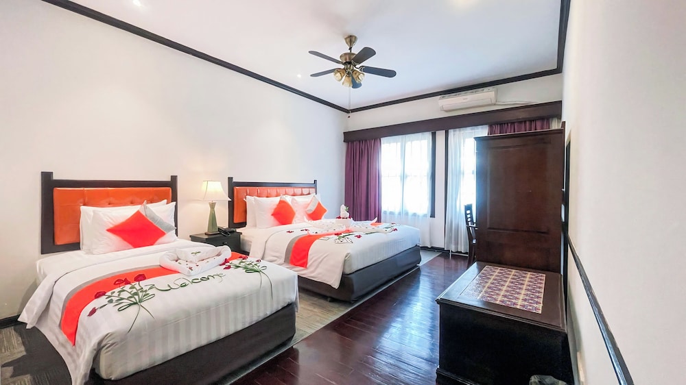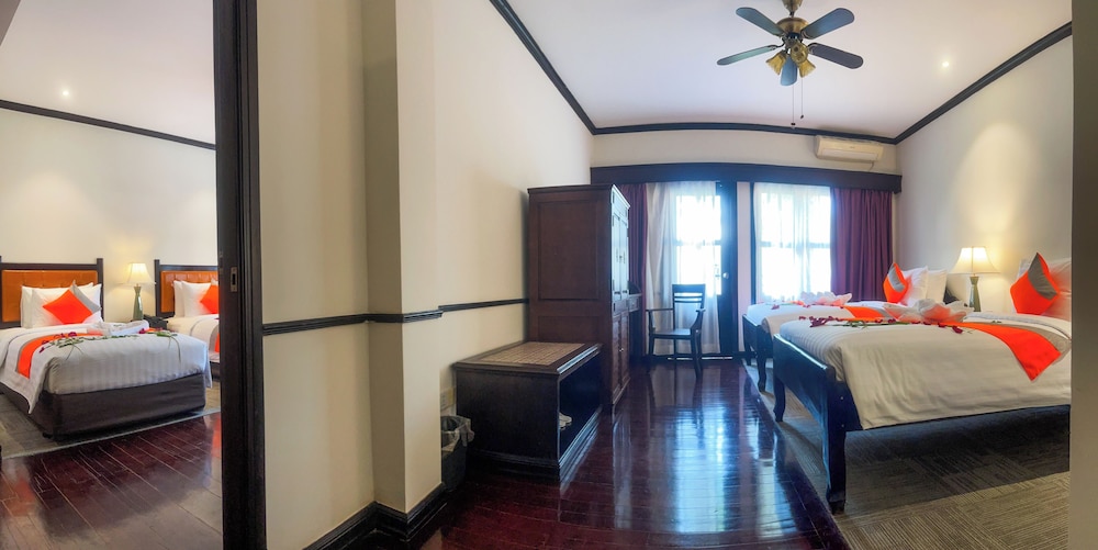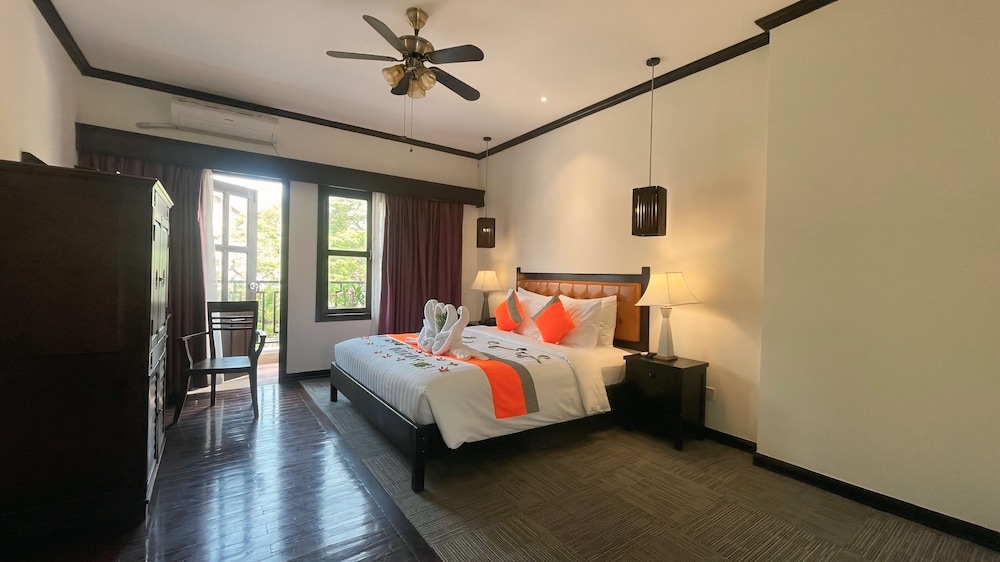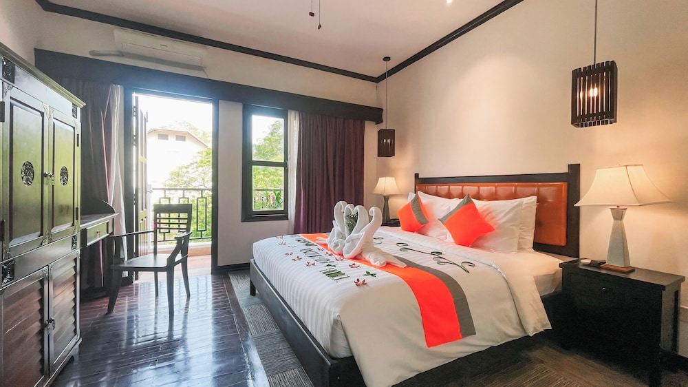 Wonderful and cozy five stars hotel, just under200m from the town center down a charming path. A short 5-7 minute walk or a cheap tuk-tuk ride for $1. Friendly staff, fantastic rooms with a nice touch of an older style, and balcony bathtubs for a relaxing soak. Enjoyed the breakfast on the rooftop balcony and free high-speed Wi-Fi. Overall, exceptional value for a memorable stay.