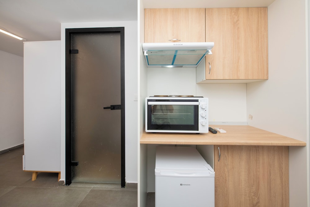 This is a very odd arrangement. The main hotel where you check in is wonderful, but the “studio” is .6 of a mile away and little more than a long, narrow hallway lined with windowless closet-like dorms. They do have private bathrooms which is nice. But there isn’t really a nothing to walk to and the taxi service is 30 euro to Mykonos town. The nearby bus stop is much more economical. I stayed for one night which was more than enough. Friendly staff though!