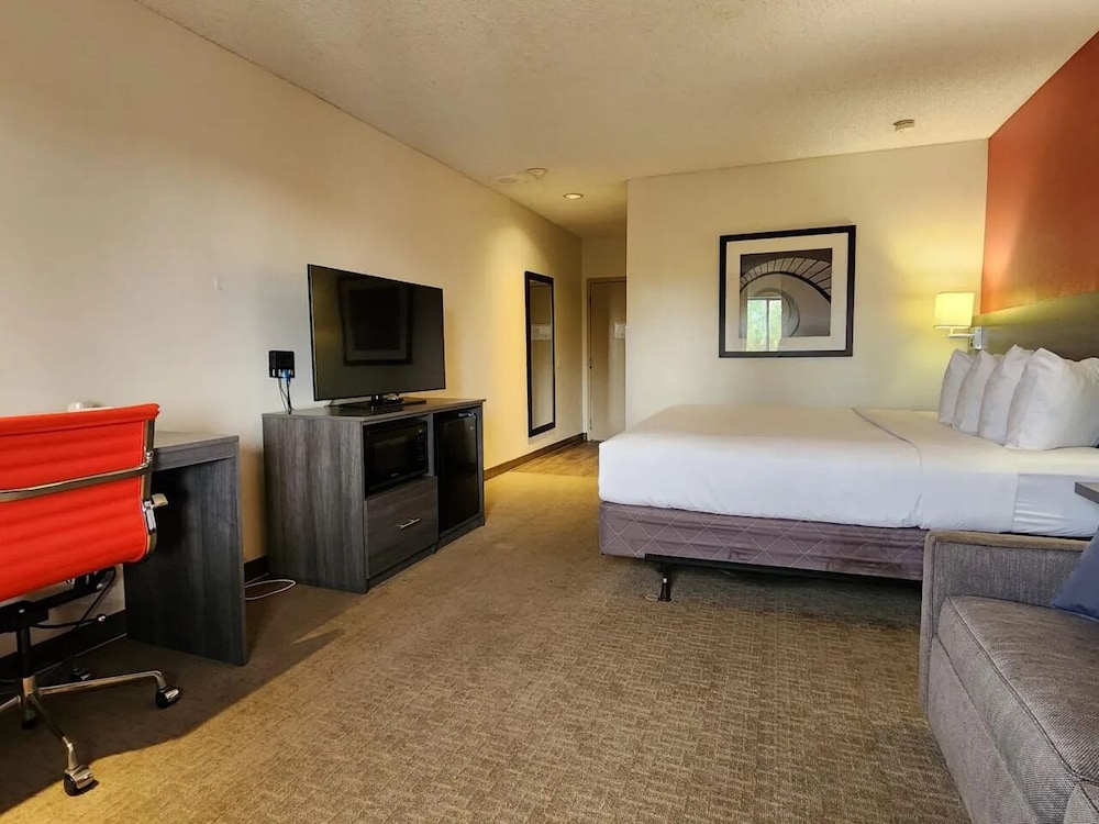 This is a former Ramada Inn. It wasn’t fancy, but it served my needs. My room had a full size fridge and microwave. The property was clean and the staff was very friendly.