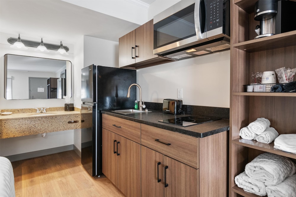 The location was nice. There is a place to see a show and get dinner that’s walkable. Although there are no elevators it’s only a small walk up to the second floor. The suite has a burner top stove which was great except there are no pots or pans to utilize them. We brought food but had no way to cook it unless we used the microwave. The bed was comfy, everything was clean. The water pressure in the shower was fabulous. We did ask to have maintenance come because our phone didn’t work. They did not come. There is a way to check out from your room by dialing a certain number but I called the lobby on my cell and they were able to do it. Overall I’d give them 4 1/2 stars and would stay again.