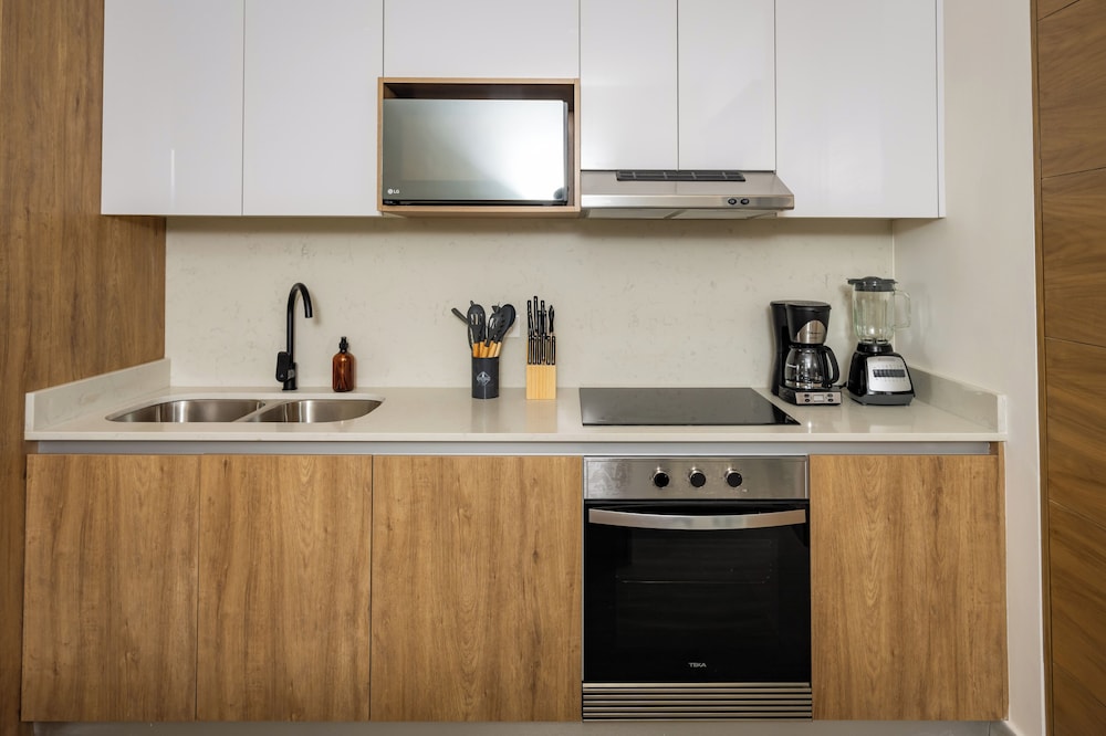 Very nice, new apartment with a good location between the airport and beaches. There is a restaurant and convenience store (not shown on Google Maps) just a block away on a street with very little traffic. The beds are very comfortable and the showers have excellent water pressure and temperature control. The rooftop pool has a great view of the sunset. The 24 front desk people are very nice and welcoming.