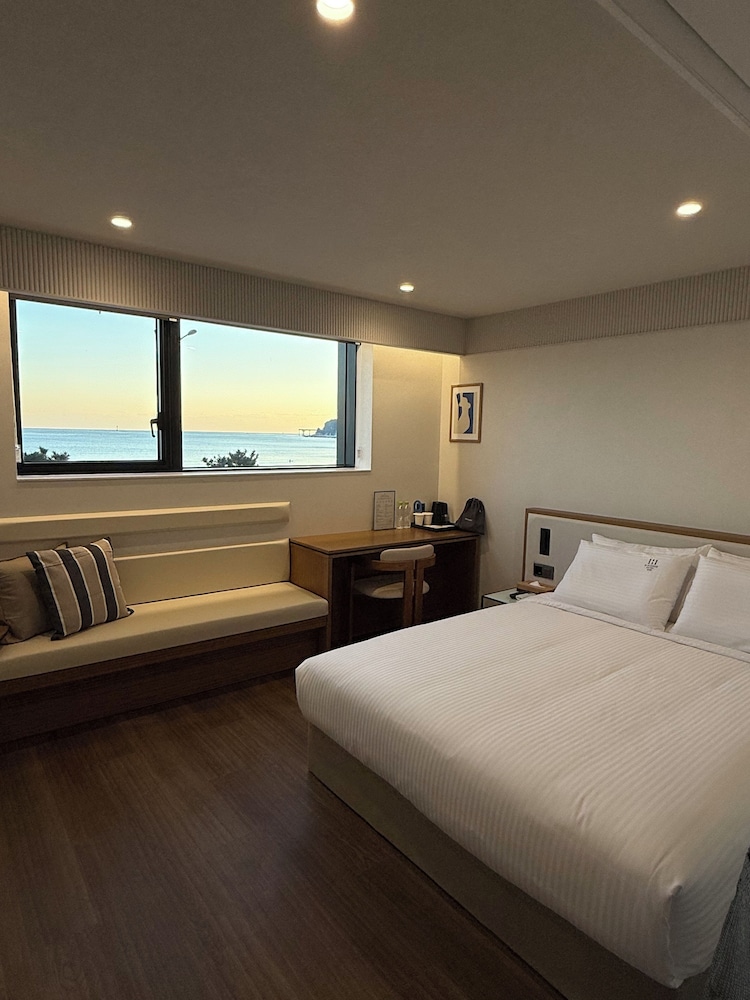 제일 맘에 들었던 건 창밖으로 바로 모래사장과 바다가 보인다는 것이구요. 해운대 광안리와 달리 밤에도 시끌거리지 않게 조용한 편이었구요. 호텔 입구에서부터 내부까지 깔끔하고 정돈이 잘 되어 있어서 좋았어요. 들어가자마자 맨발로 다니는데 마루형 바닥에 발바닥에 걸리적 거리는 자잘한게 없어서 굳이 실내슬리퍼를 신지 않아도 되었어요. 큰 사이즈의 tv가 방과 거실에 각 1대씩 있었구요.스타일러도 있구요. 넓은 크기의 넉넉한 욕조와 잘 청소되어 있는 디테일도 만족했구요. 퀸사이즈 침대 두개라 아주 넉넉하게 잘 수 있었어요. 카누 커피캡슐도 있어서 잘 마셨고, 밤 늦게 그리고 아침 일찍 산책을 나갔는데 밤에는 순찰도 자주 다니시고 아침엔 청소하시는 분들과 조깅하시는 분들도 많으시더라구요. 근처에 작은 동산에는 짧지만 산책길도 있고 운동기구도 있고 정자도 있고 동네 어르신들이 운동하시는게 보기 좋았어요. 해변에 서핑 보드가 많더라구요. 문토스트가 그렇게 가까이 있는줄 몰랐다가 산책 나가며 봤네요.ㅋ바로 뒤에 송정 블루라인파큼 바다열차 역이 있어서 걸어서 1분컷이었구요.침대에 누워 보이는 하늘이 좋은 날씨 덕에 너무 예뻤습니다. 전기 콘센트는 침대 옆에 하나 소파 옆에 하나 있었는데 다른 곳에도 있었는데 제가 못 찾은 걸수도 있어요.