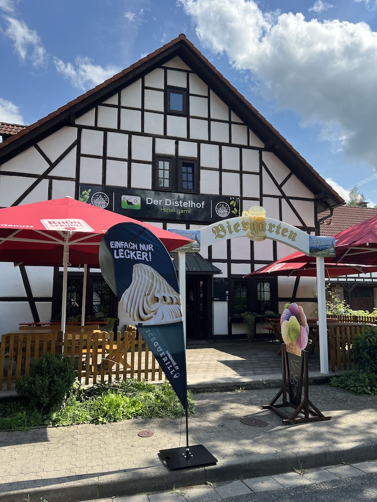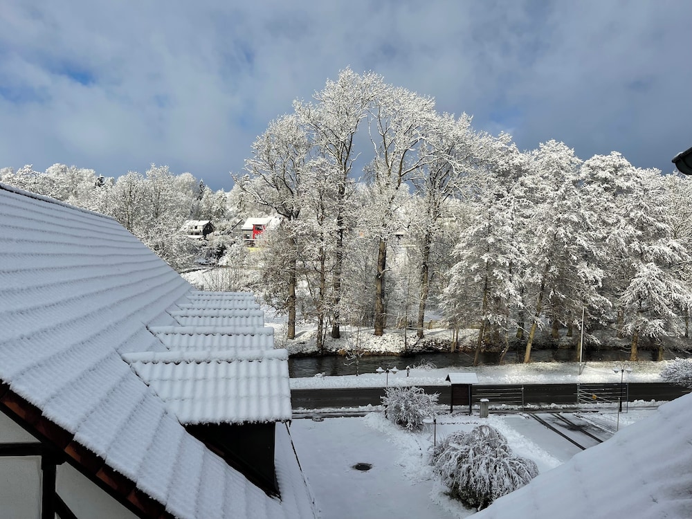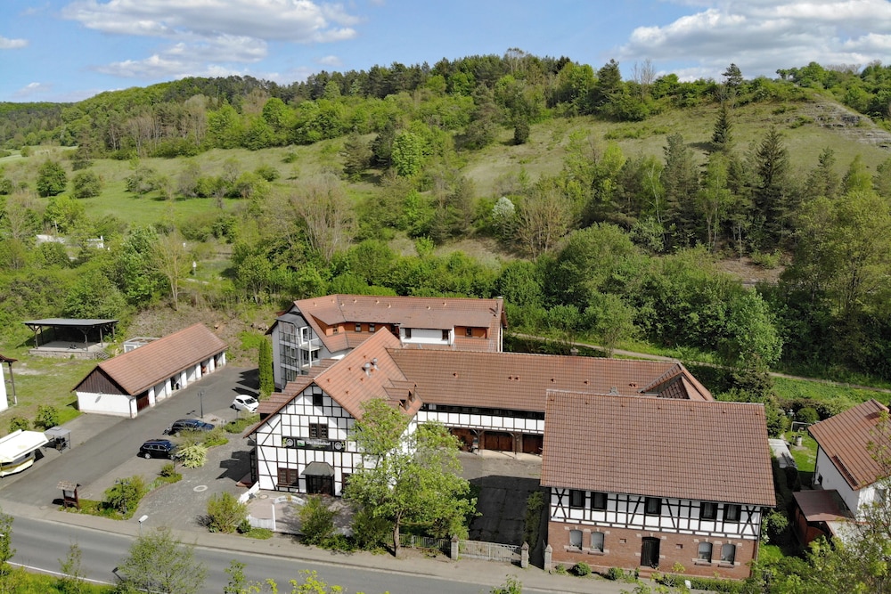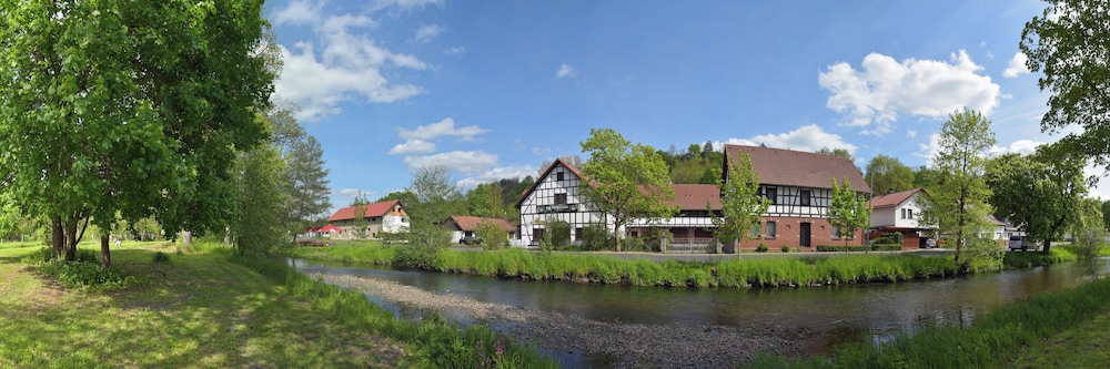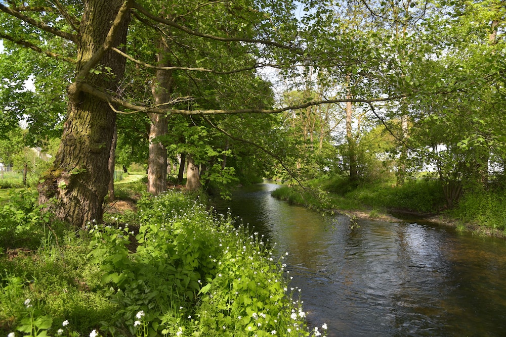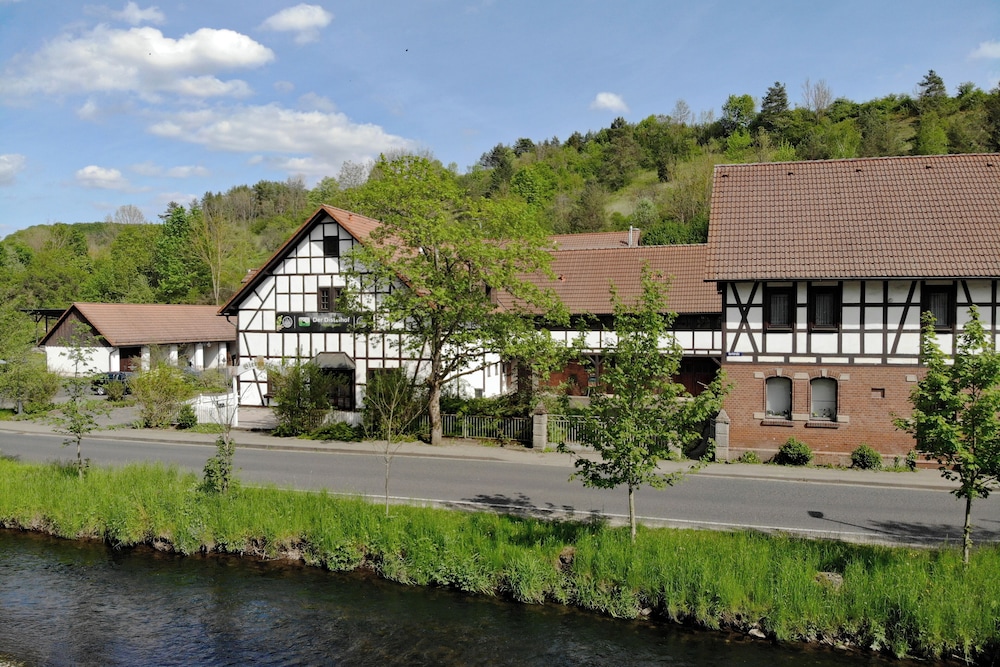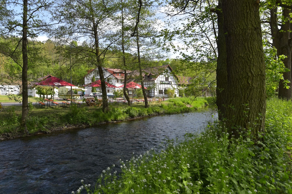 Discover serene elegance at Landhotel Der Distelhof mit Scheunencafé, your perfect getaway nestled along a picturesque river.