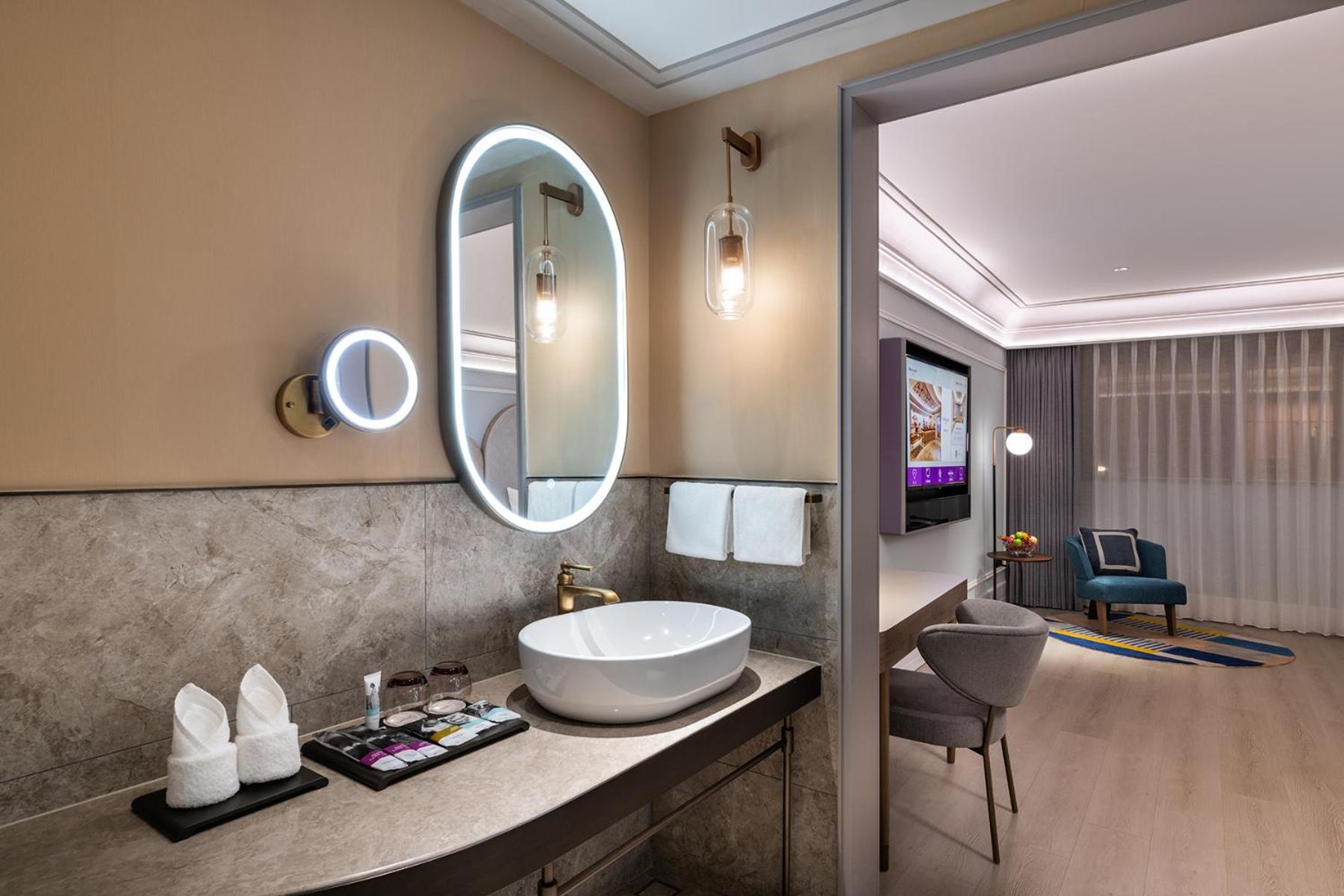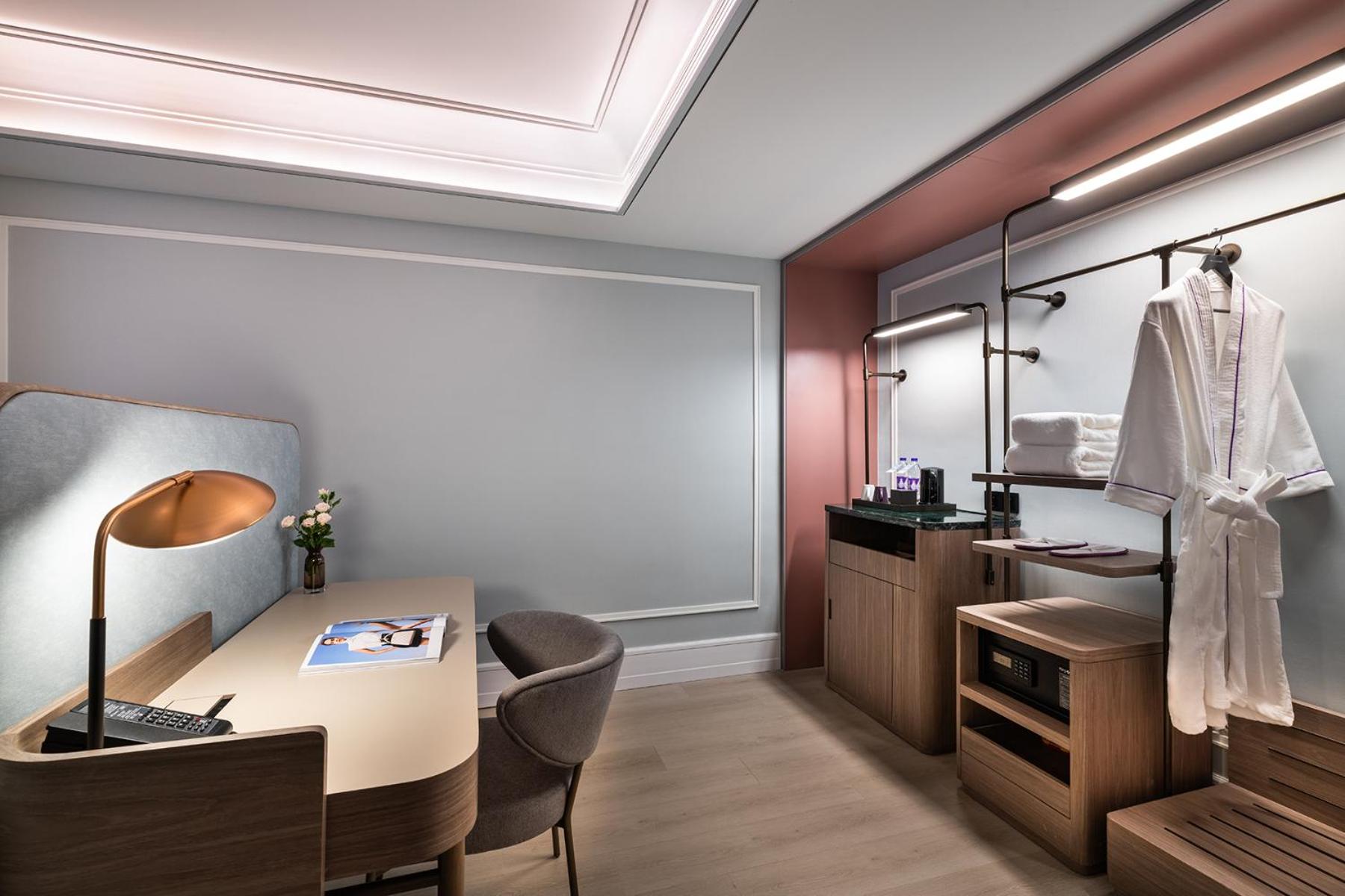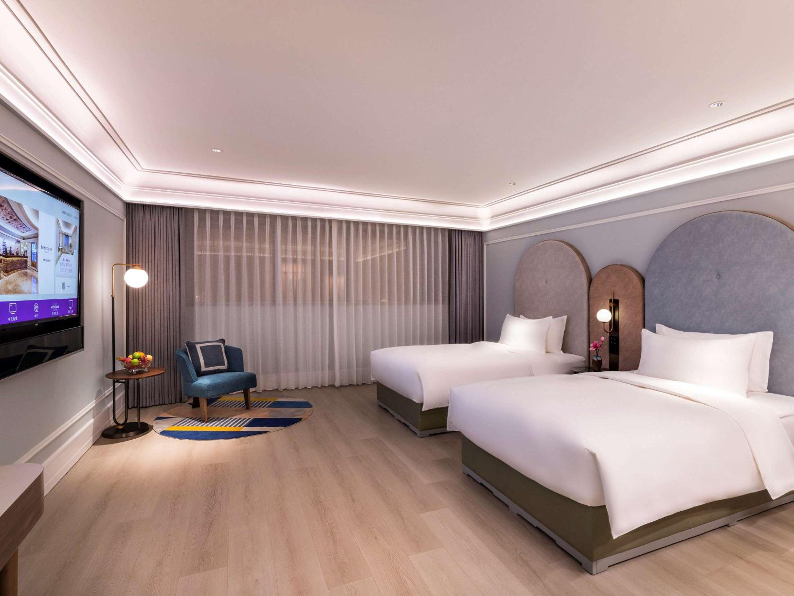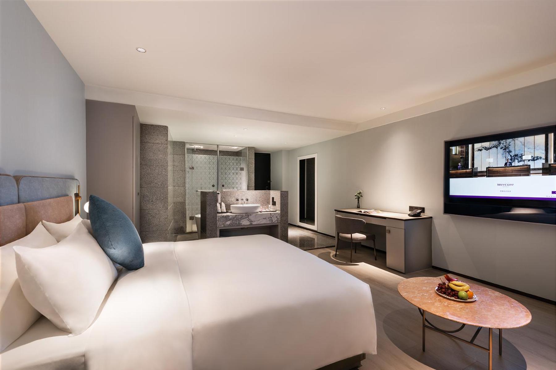 Relax in air-conditioned rooms featuring modern amenities such as a TV with satellite channels, kettle, and stylish work desk at Mercure Fuzhou Downtown.
