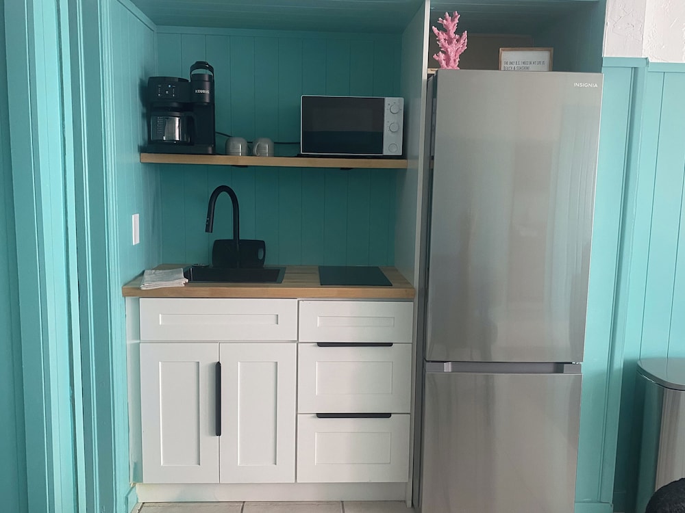 Place is a hidden gem. Cute rooms, updated with huge tvs, stainless steel appliances, cute decor, very quiet, laundry, bbq grill, staff is extremely friendly and helpful. Angie, the manager is amazing, and extremely prompt and helpful. Pool was clean, comfy bed and furniture, walk right across the street and you are at the beach. Free parking. Maintenance guys were even very helpful when i asked them to help me lift the top back on my jeep. I will definitely be returning. Not soon enough! Great place to vacation.