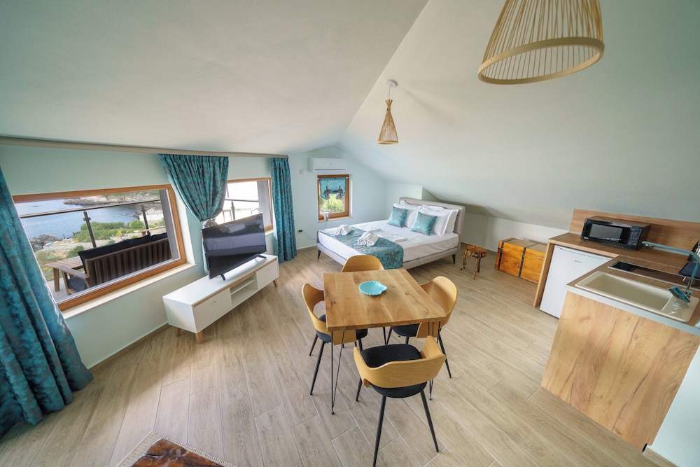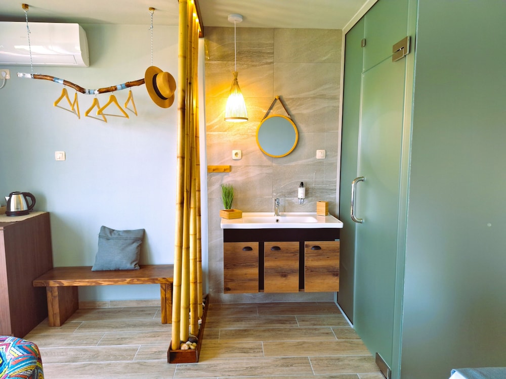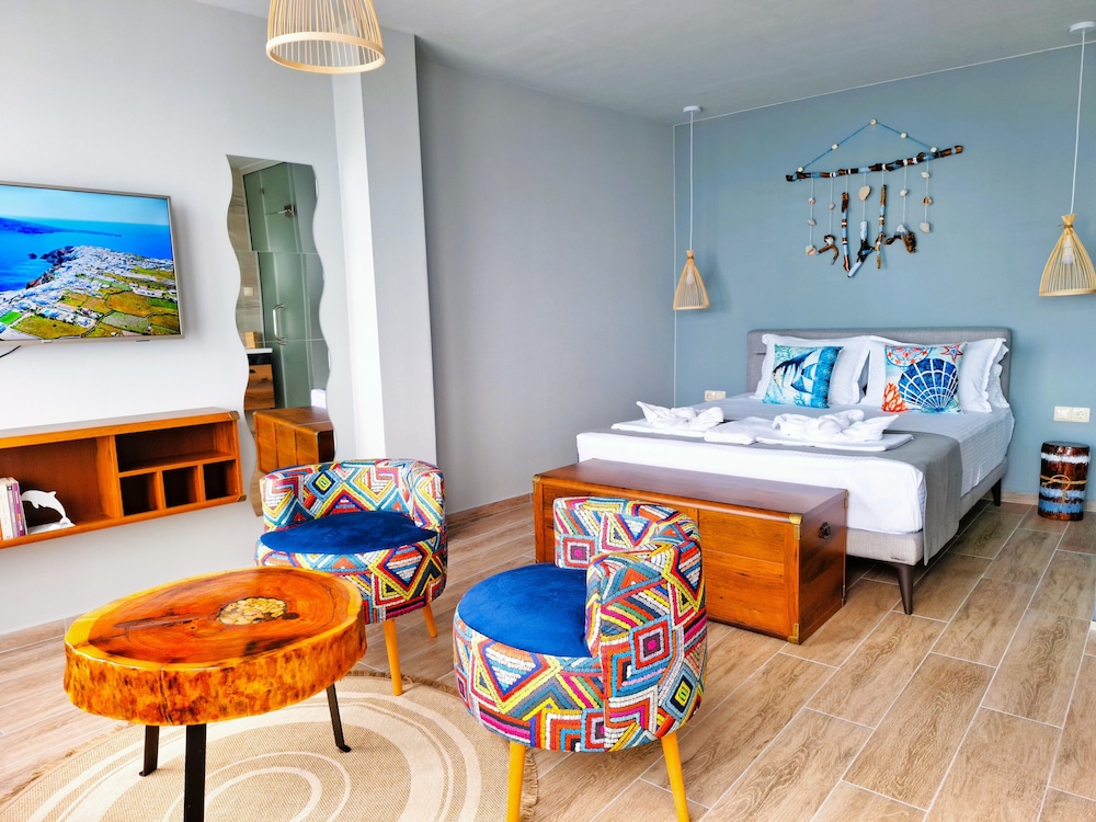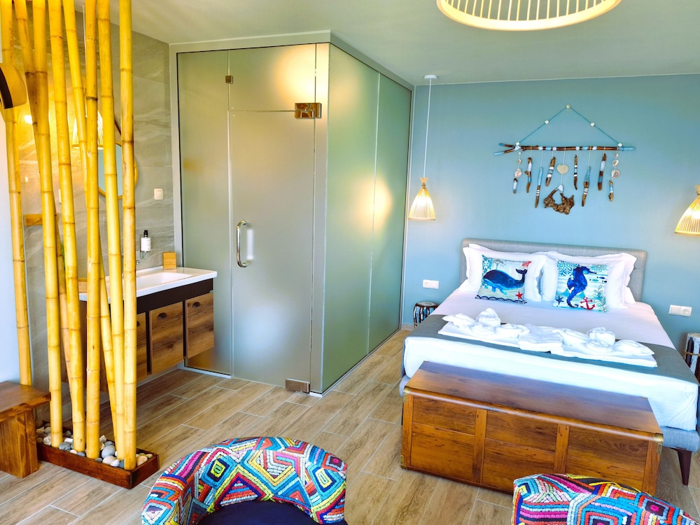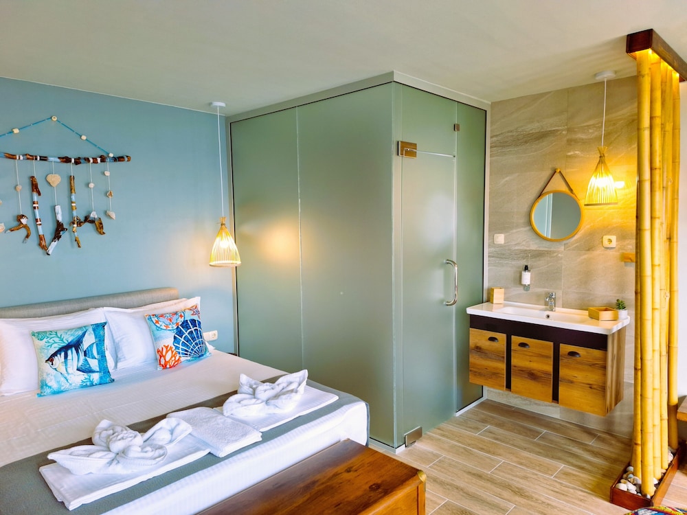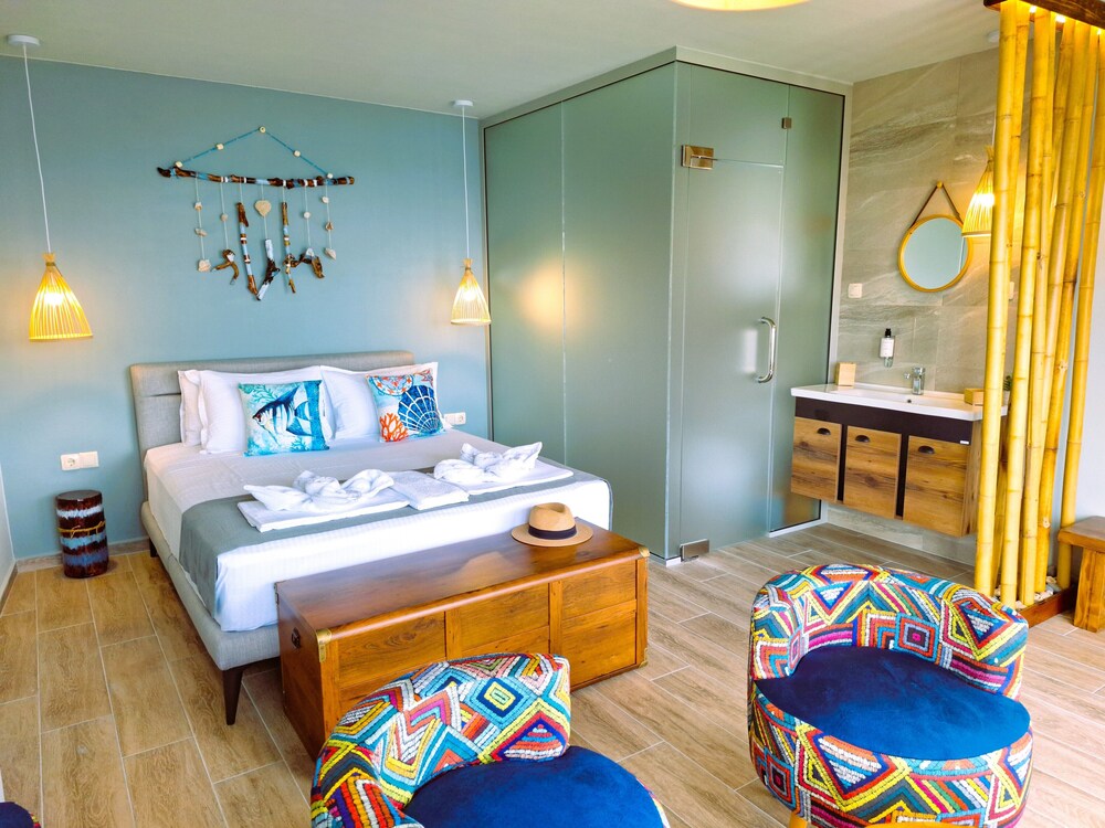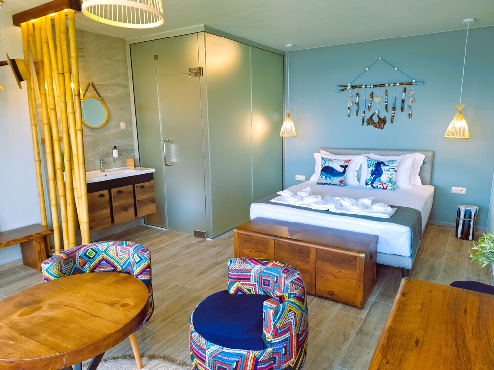 Enjoy the sun at our seasonal outdoor pool, unwind with a refreshing drink from one of our two beach bars, or explore the nearby Harmani Beach, just steps away.