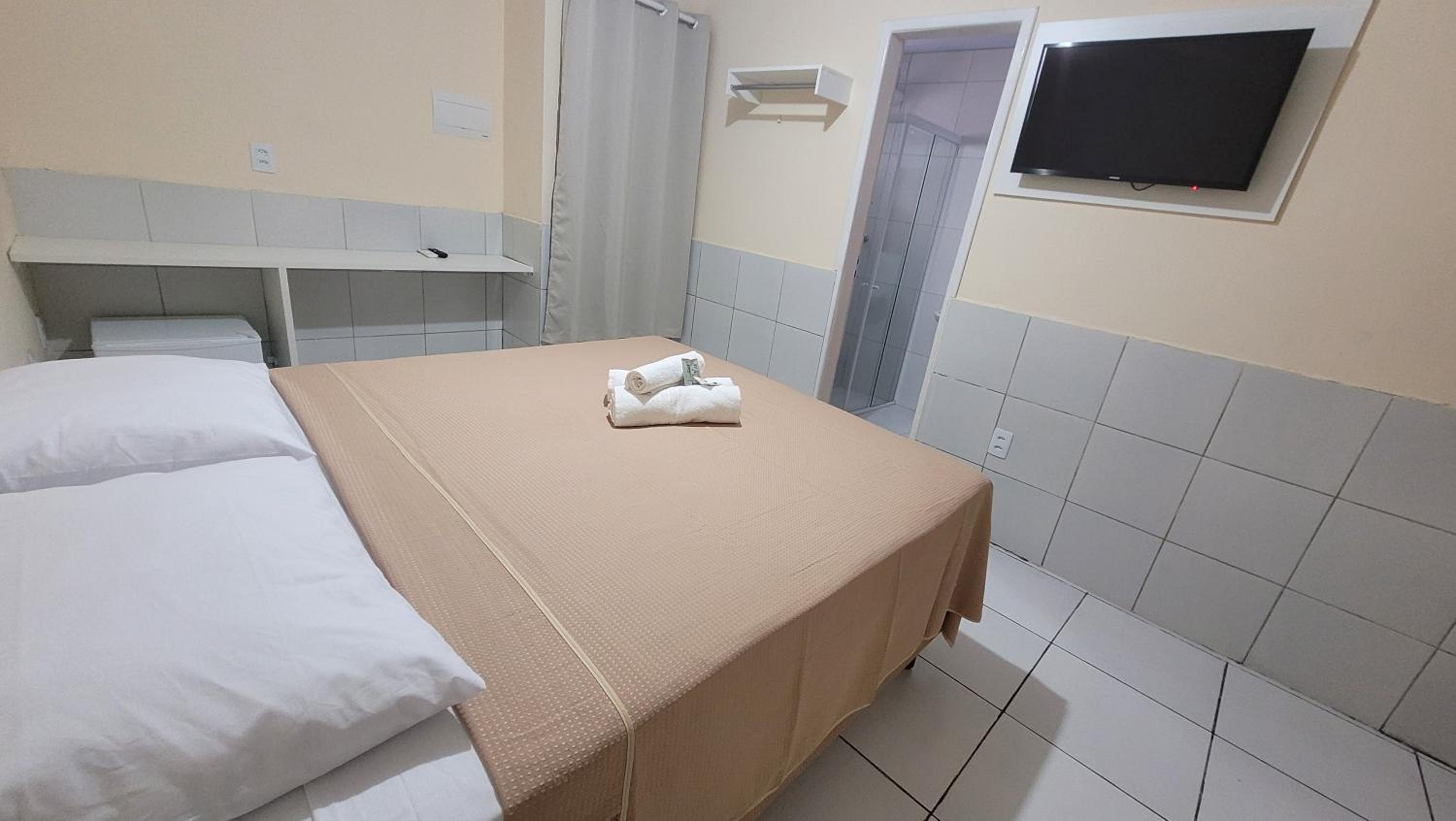 Banheiro muito apertado, velho e com cheiro de cloro muito forte. Piso de qualidade inferior e com algumas avarias. Toalhas de péssima qualidade e velhas. Rua à noite tem pouco movimento em direção à praia e é mal iluminada e com obras, gerando um certo receio na locomoção a pé.