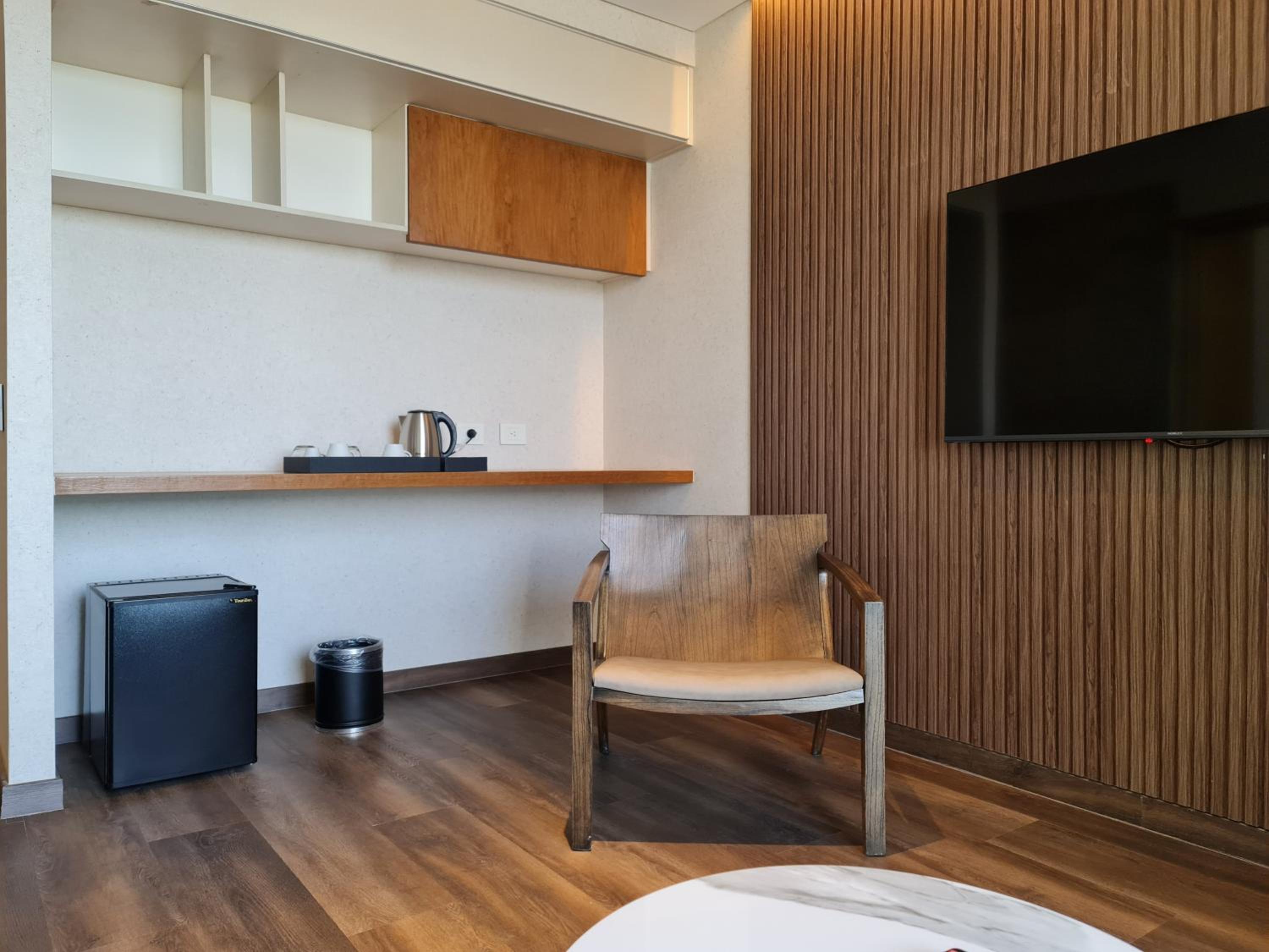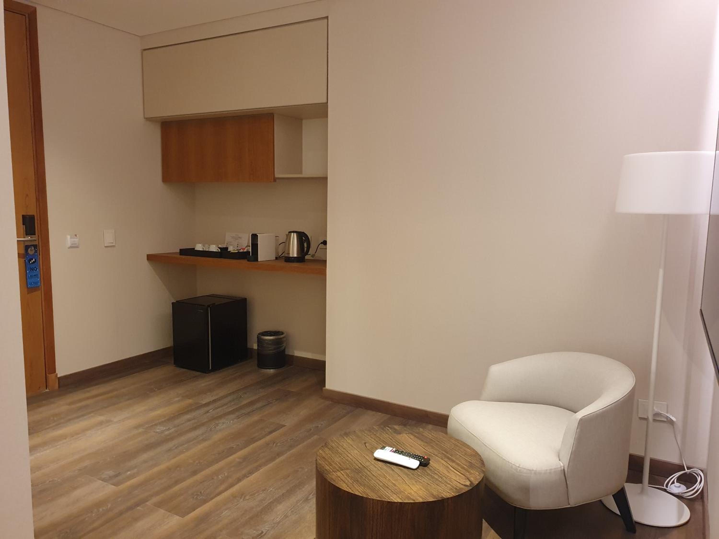 Servirse uno la infusión y hacer fila porque había una sola cafetera para el desayuno. No fuimos avisados que lo del frigobar era de cortesía ( me enterés en el check out). Me sorprendió que no nos acompañaran a mostrar la habitación y subir las valijas.