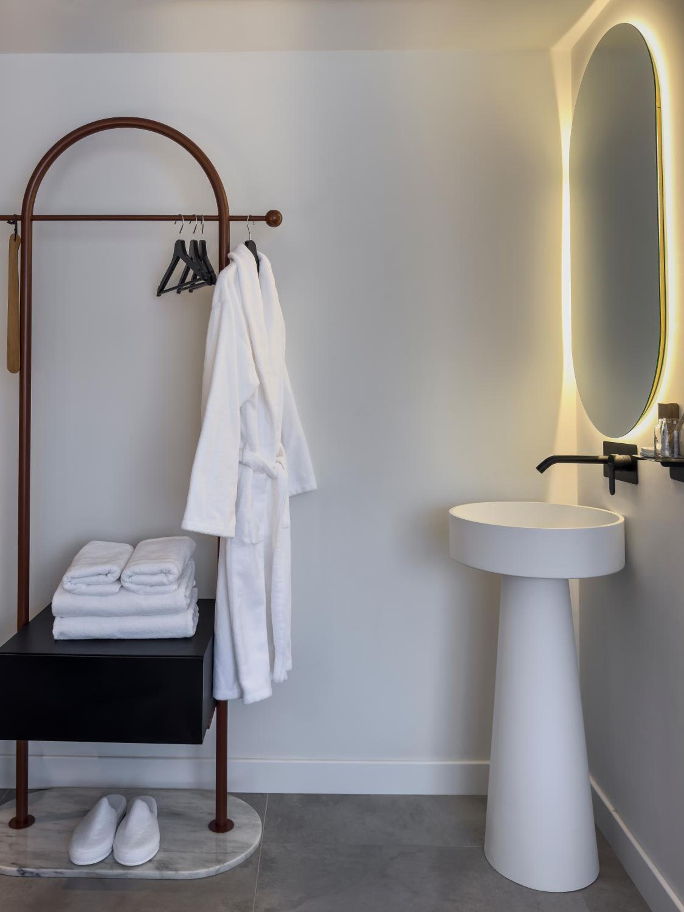 L’évier de la salle de bain en pleins dans la chambre c’est dommage également