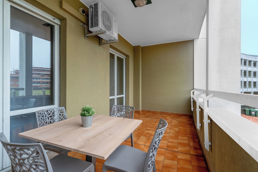 El apartamento está alejado del centro, pero bien comunicado, con un súper muy grande a unos pasos y bastantes bares y pizzerias. Nuestro aparatamento era doble con vistas al jardín. Era moderno, amplio y bastante nuevo, pero necesita un mantenimiento que parece no tener. Algunos enchufes no funcionaban, el botón del microondas saltaba cuando paraba, la campana extractora estaba sucia y en malas condiciones, el suelo mal barrido...eso sí, los sanitarios estaban limpios, la ropa de cama también y las camas son cómodas. No tienen el típico kit de fregar ni tampoco una escoba. La cocina tiene microondas y cafetera, pero no horno, tampoco en la cocina común. El personal era amable. El precio que tiene es muy ajustado, hay que asumir por qué y decidir si vale o no la pena. Nosotros no hemos estado mal.