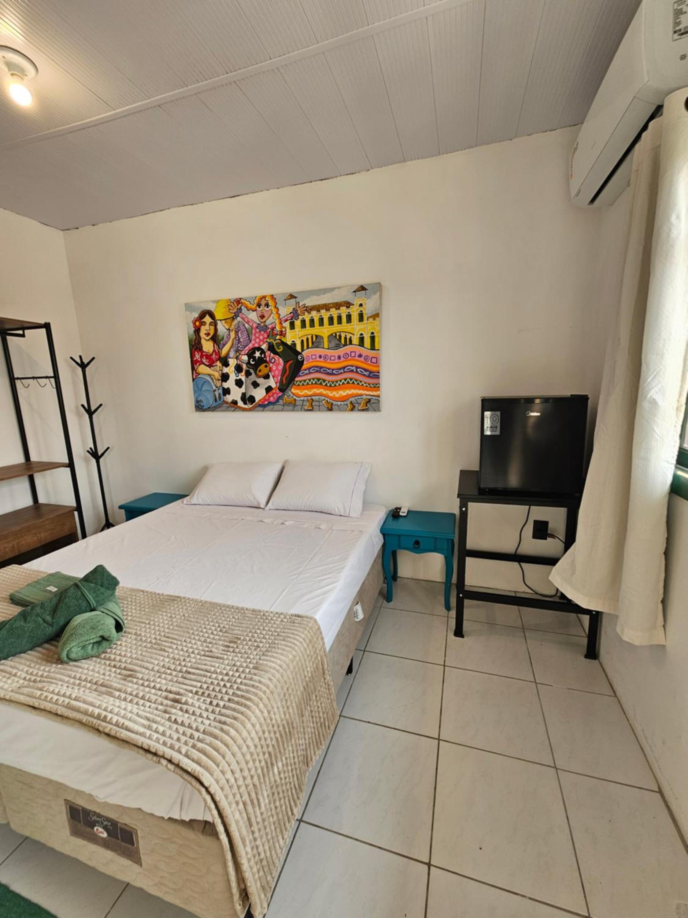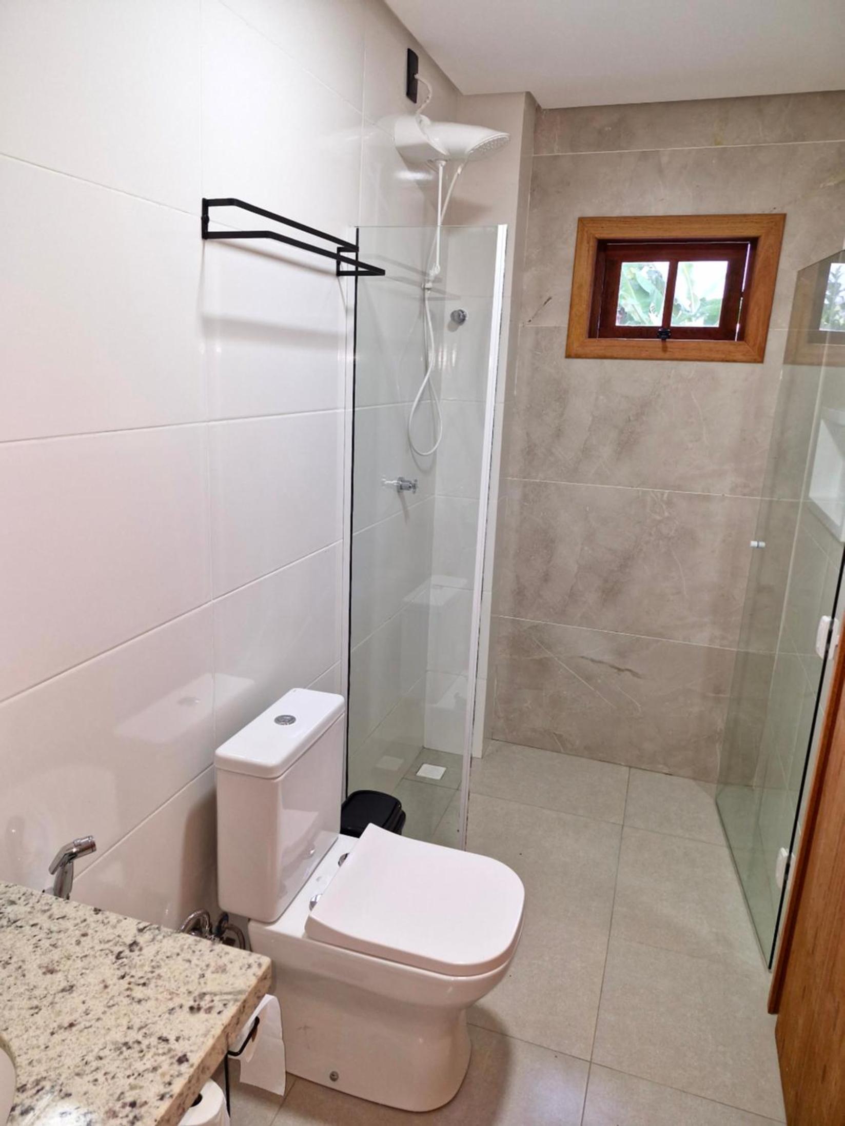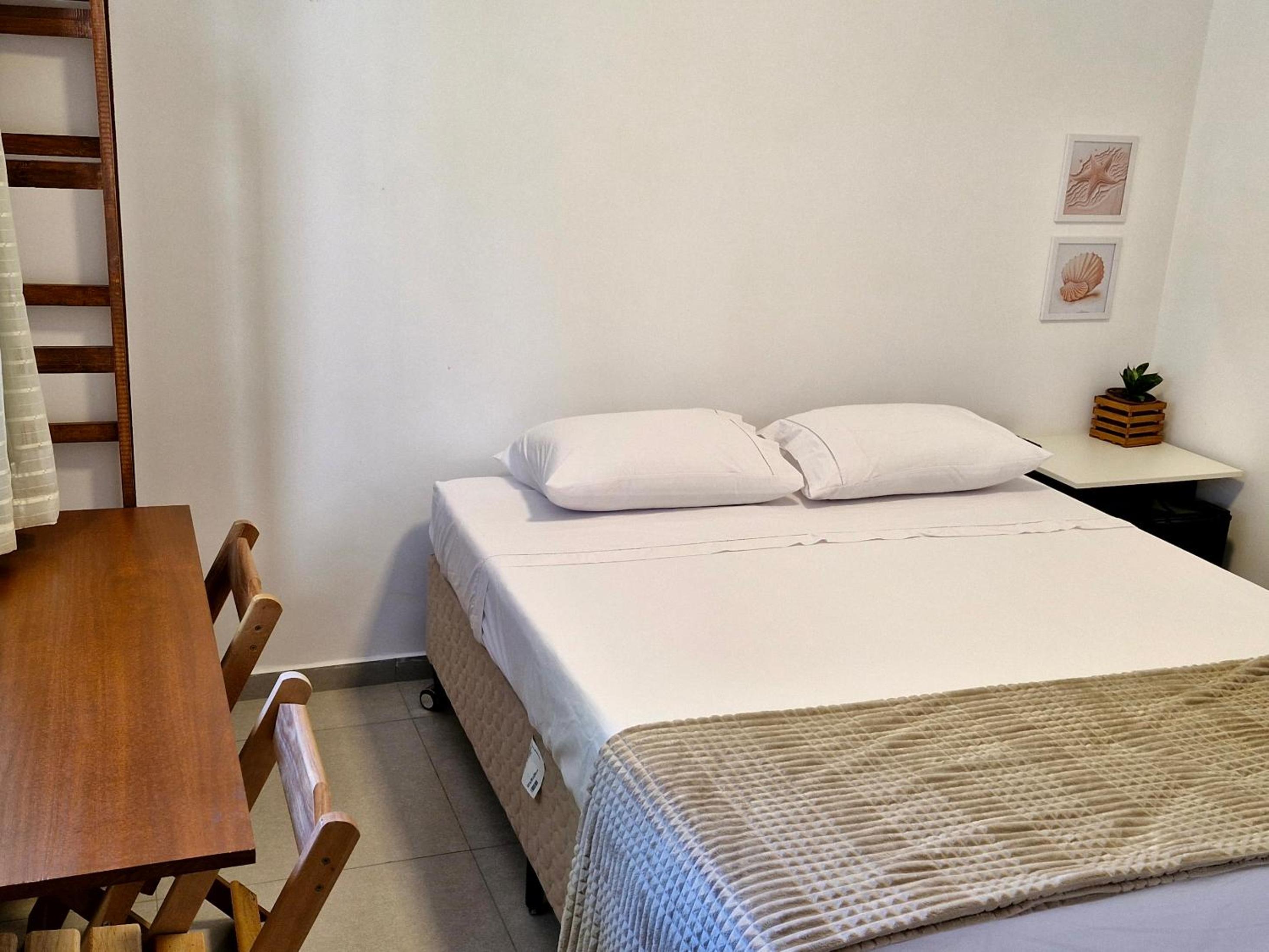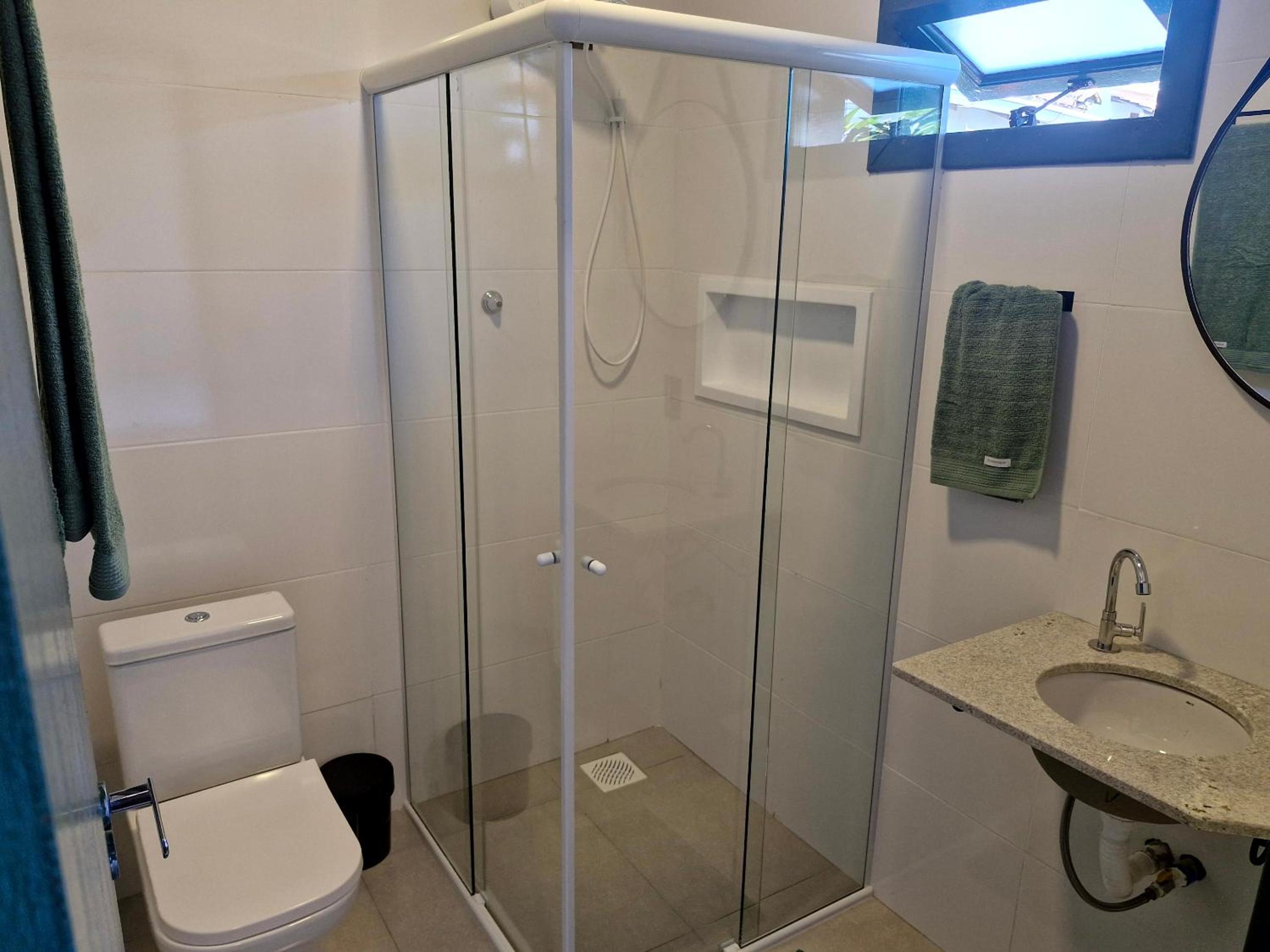 O chuveiro é bom e a cama casal confortável.