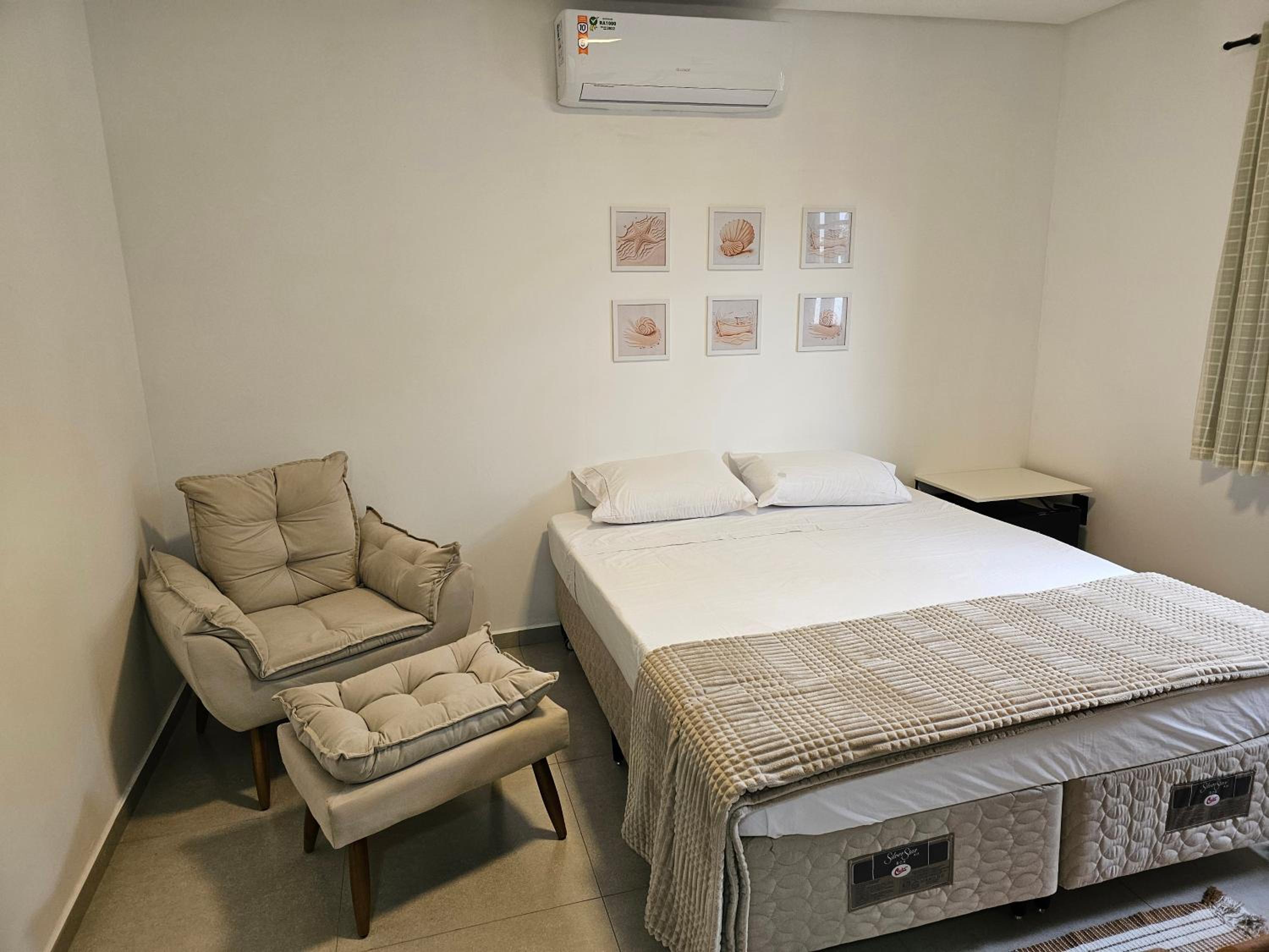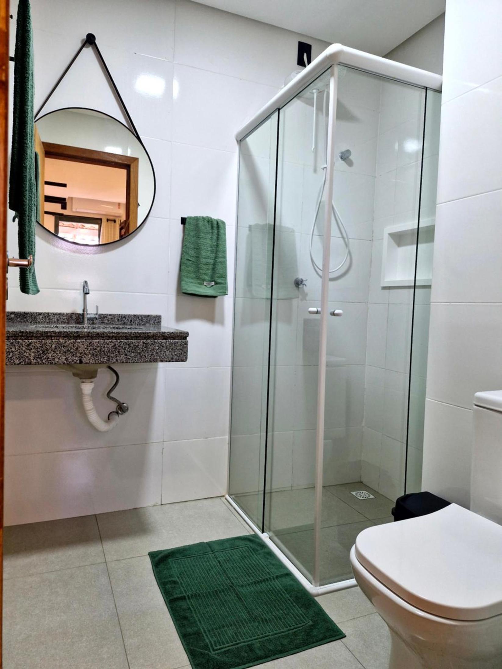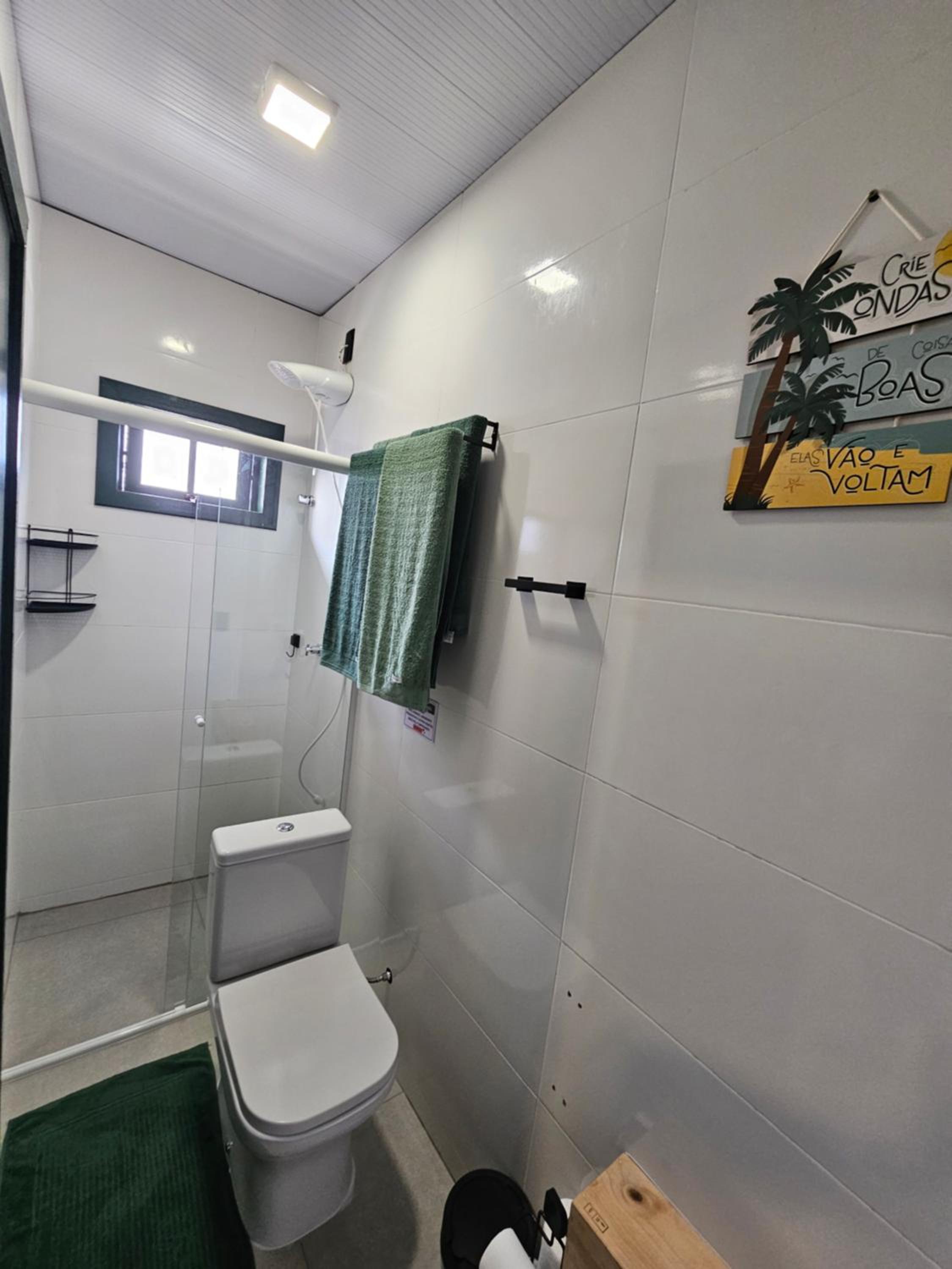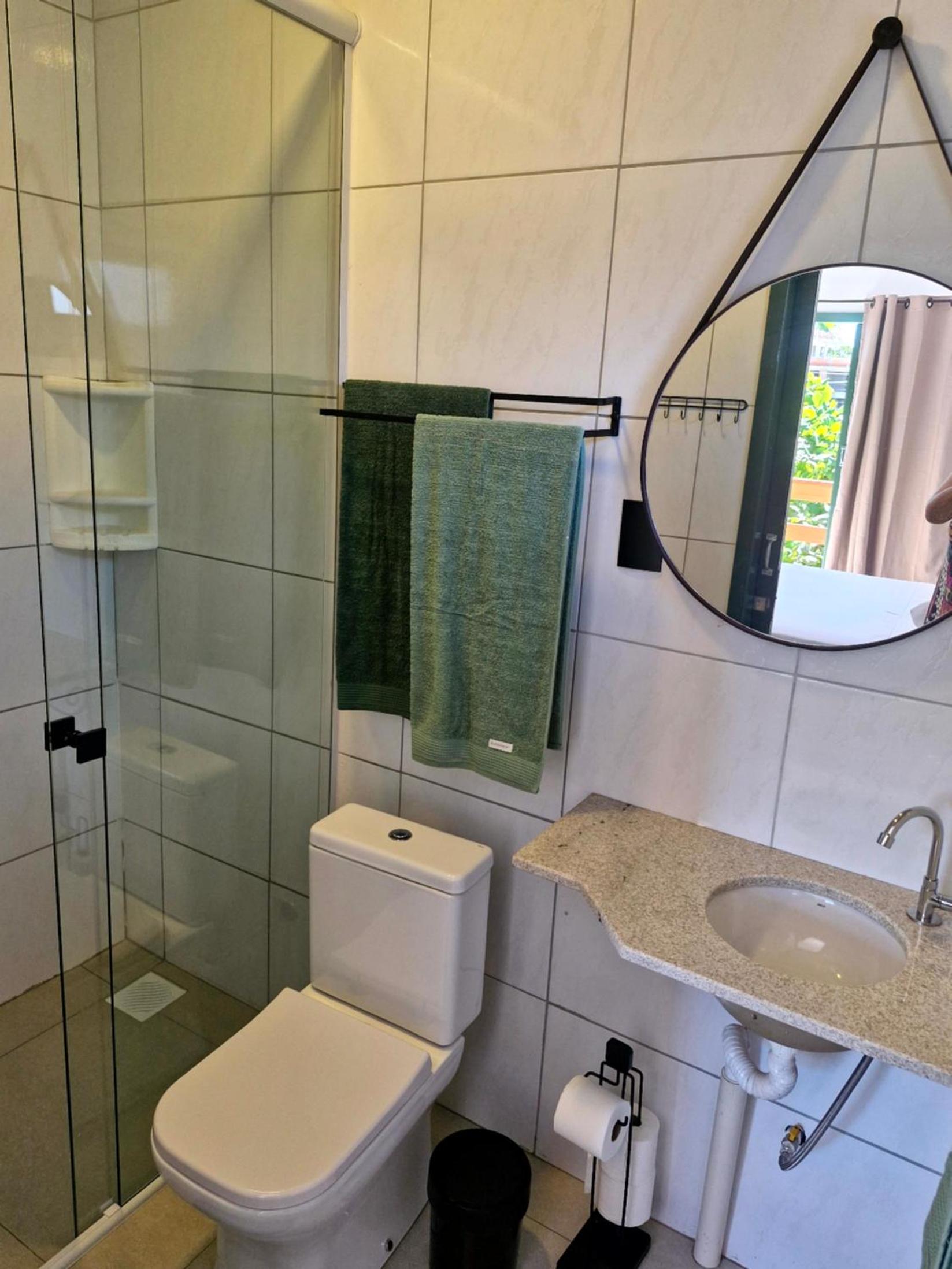 O chuveiro é bom e a cama casal confortável.