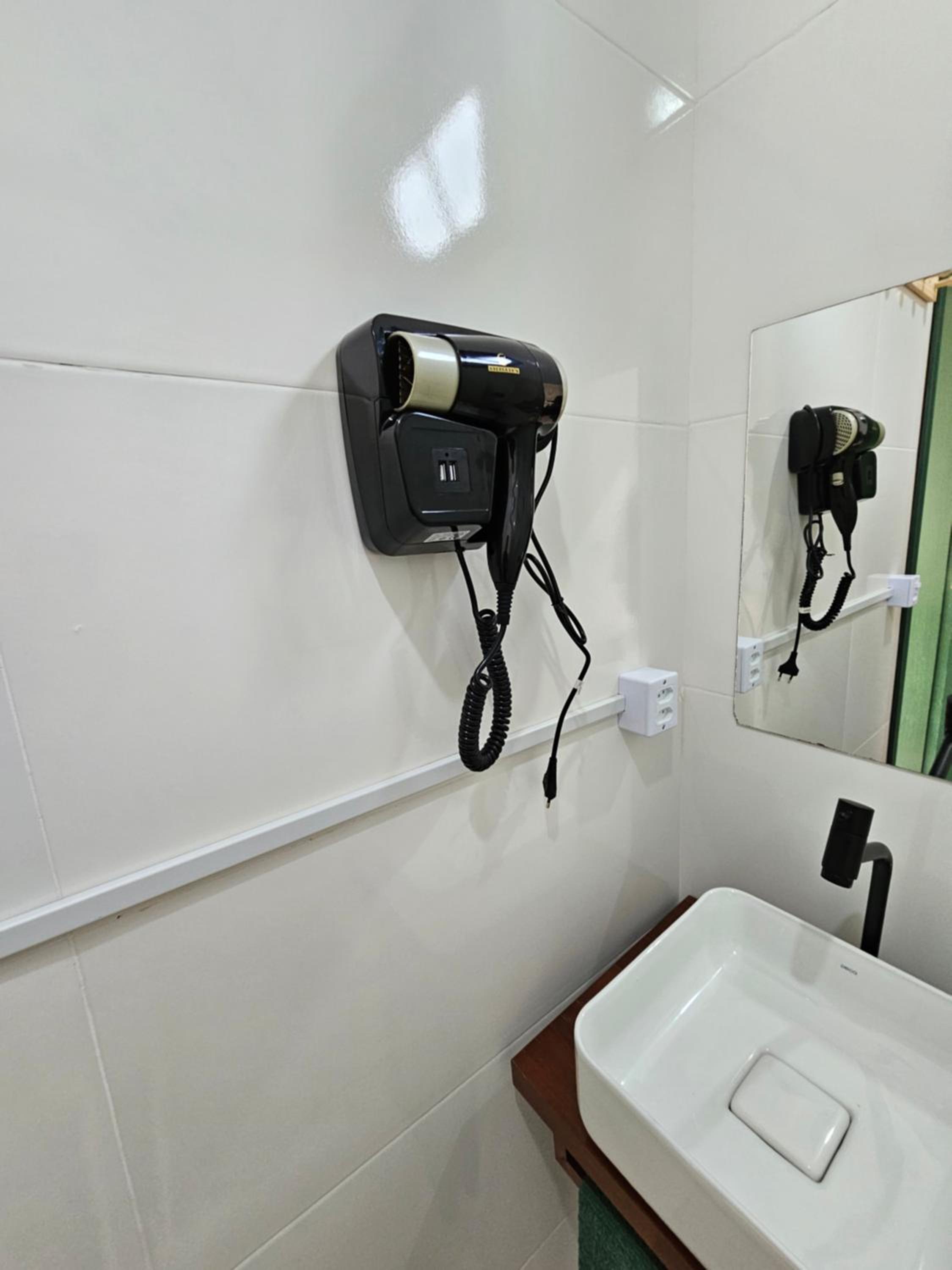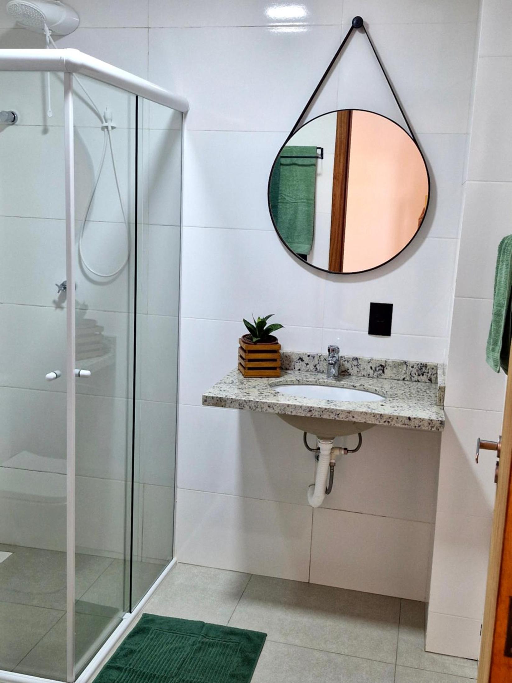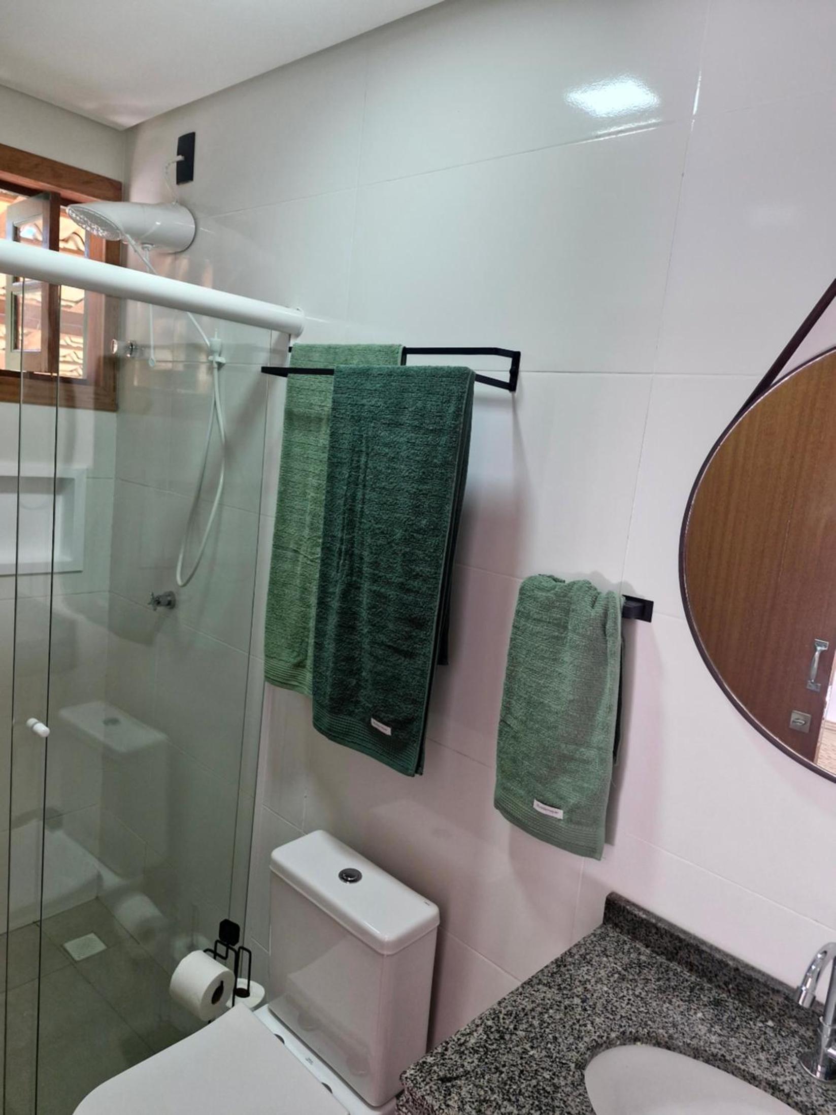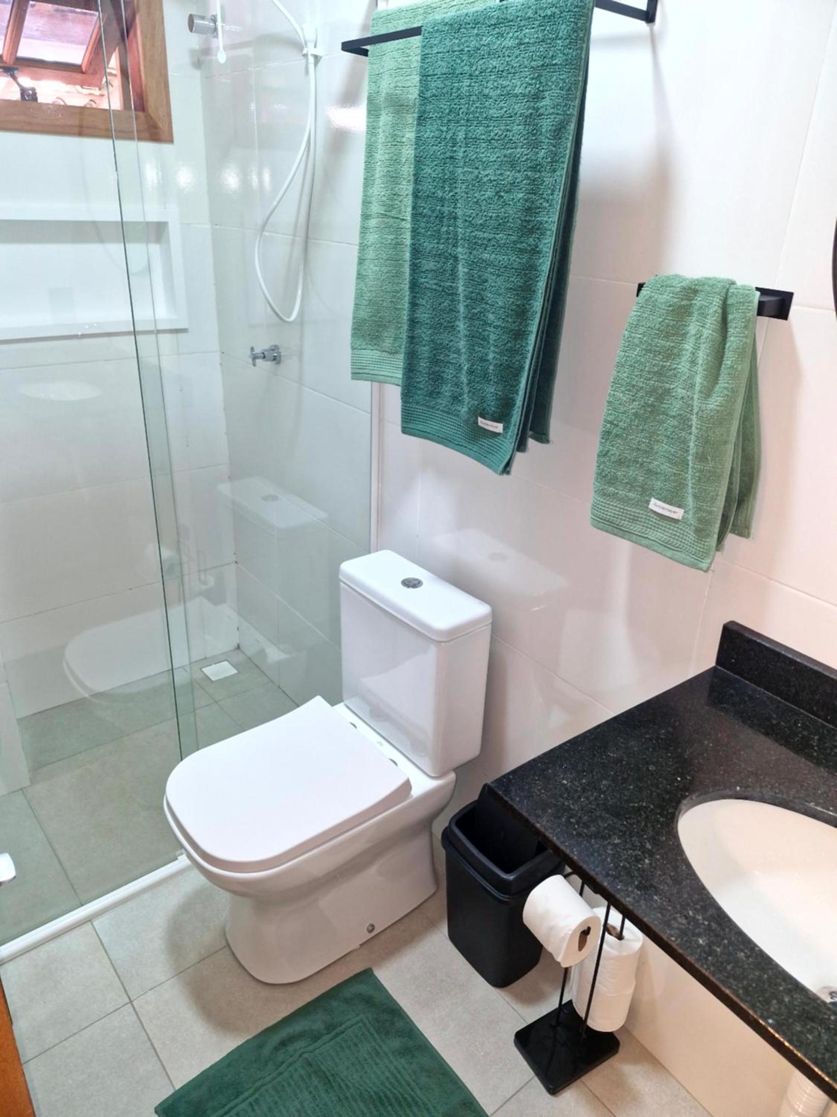 O chuveiro é bom e a cama casal confortável.