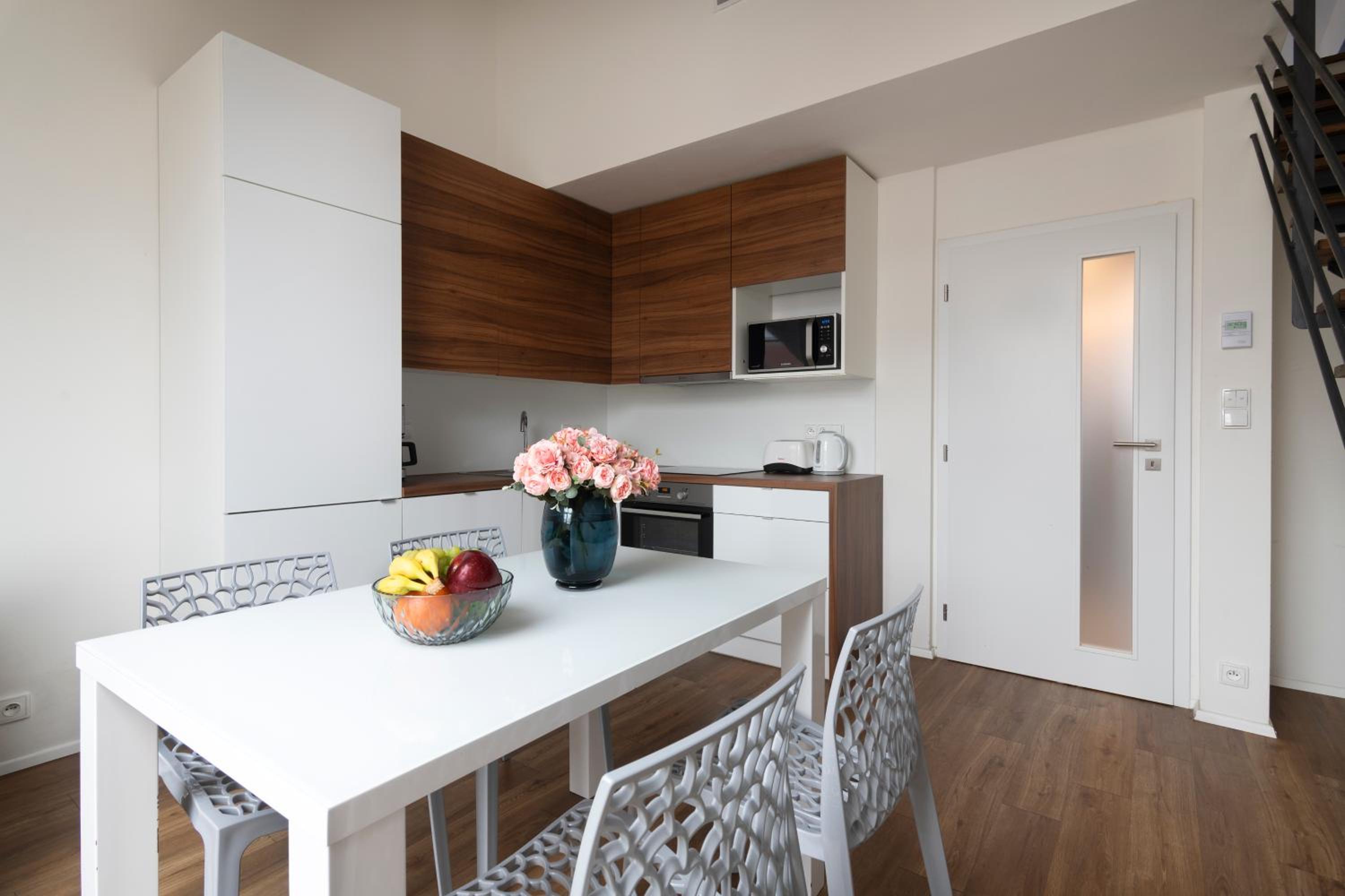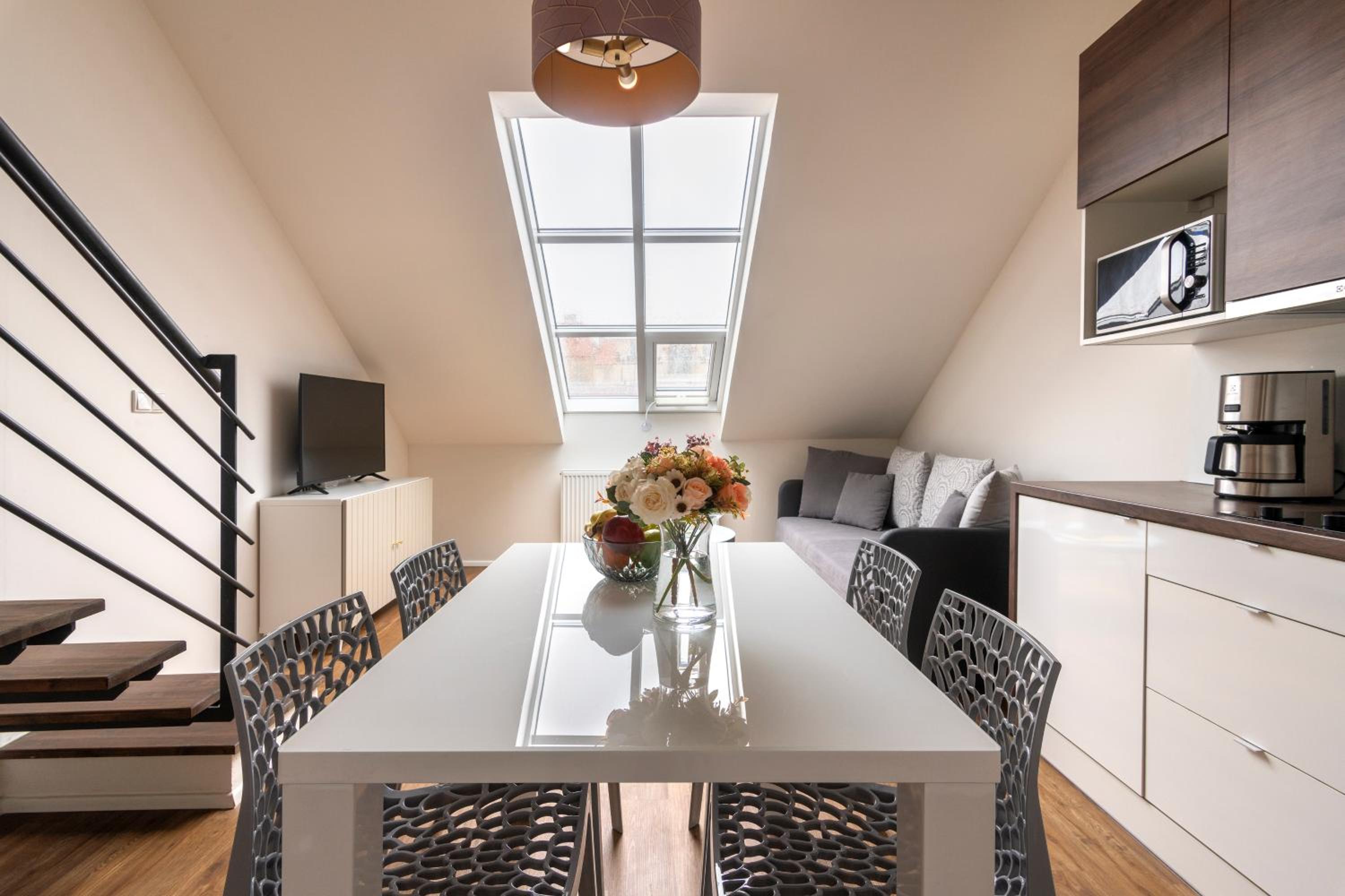 Experience a sustainable 4-star stay at Prague Tales Boutique Residence. Indulge in modern amenities including a flat-screen TV, fully equipped kitchen, and comfortable bedding.