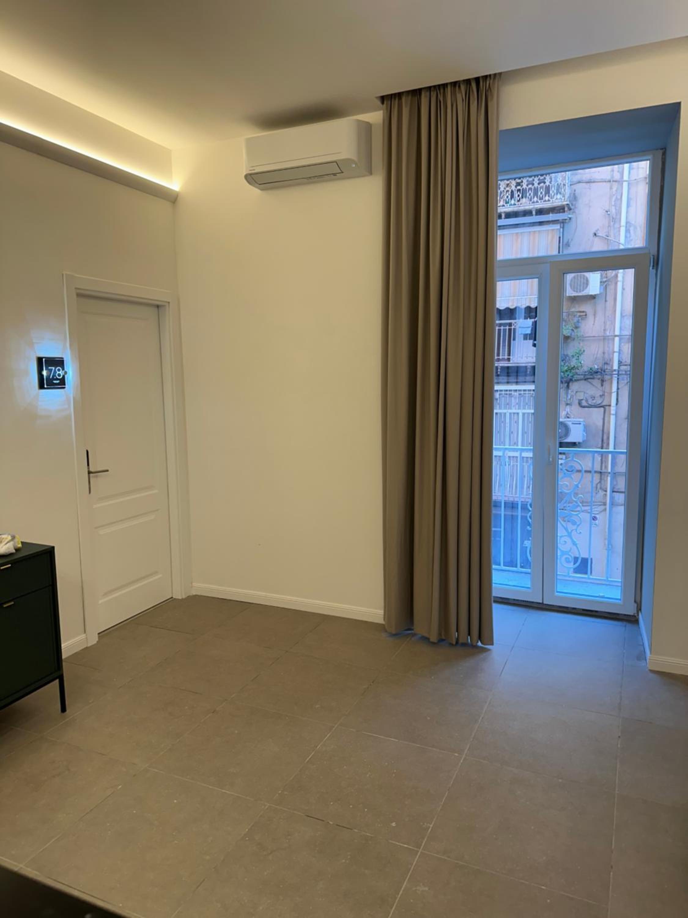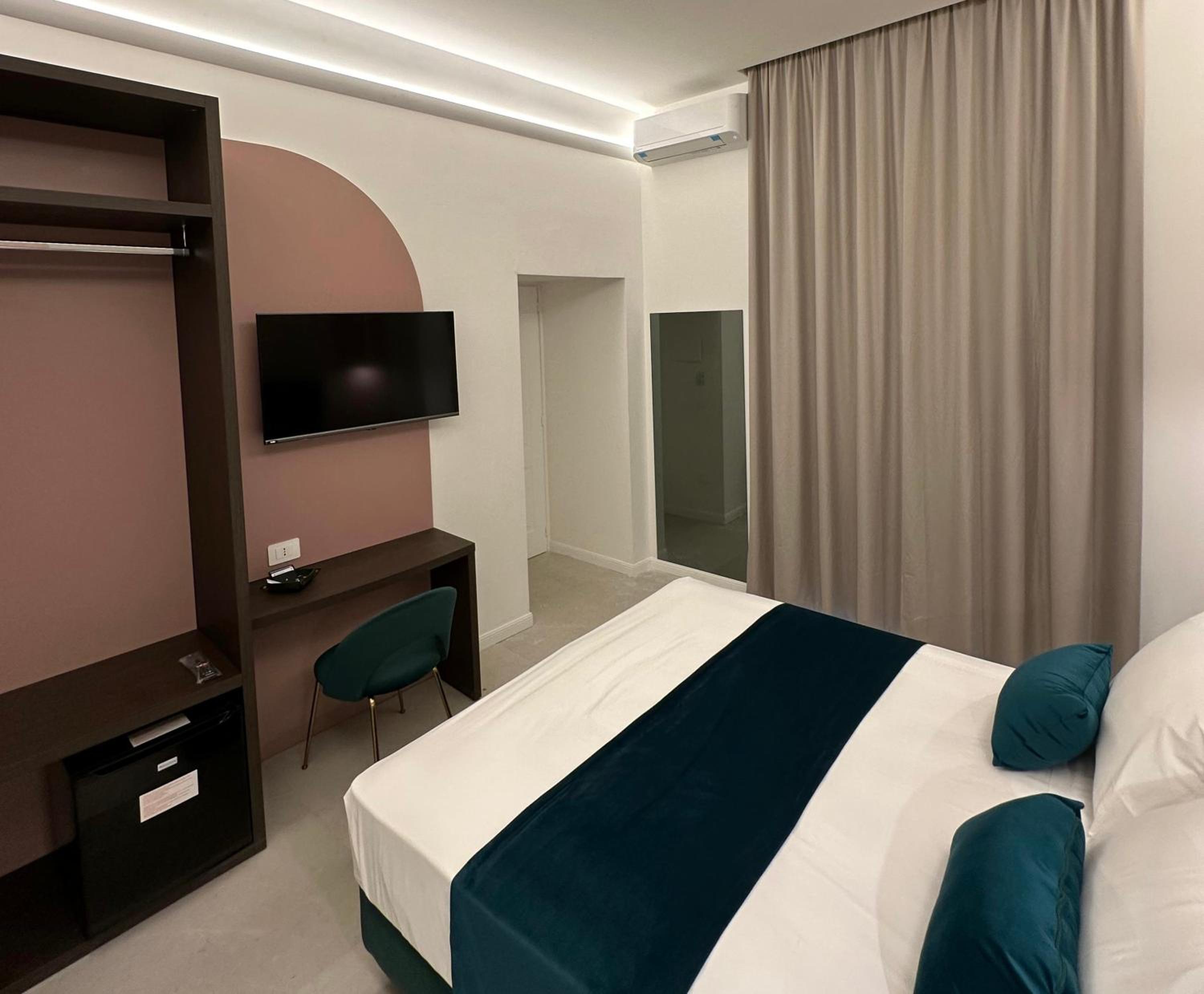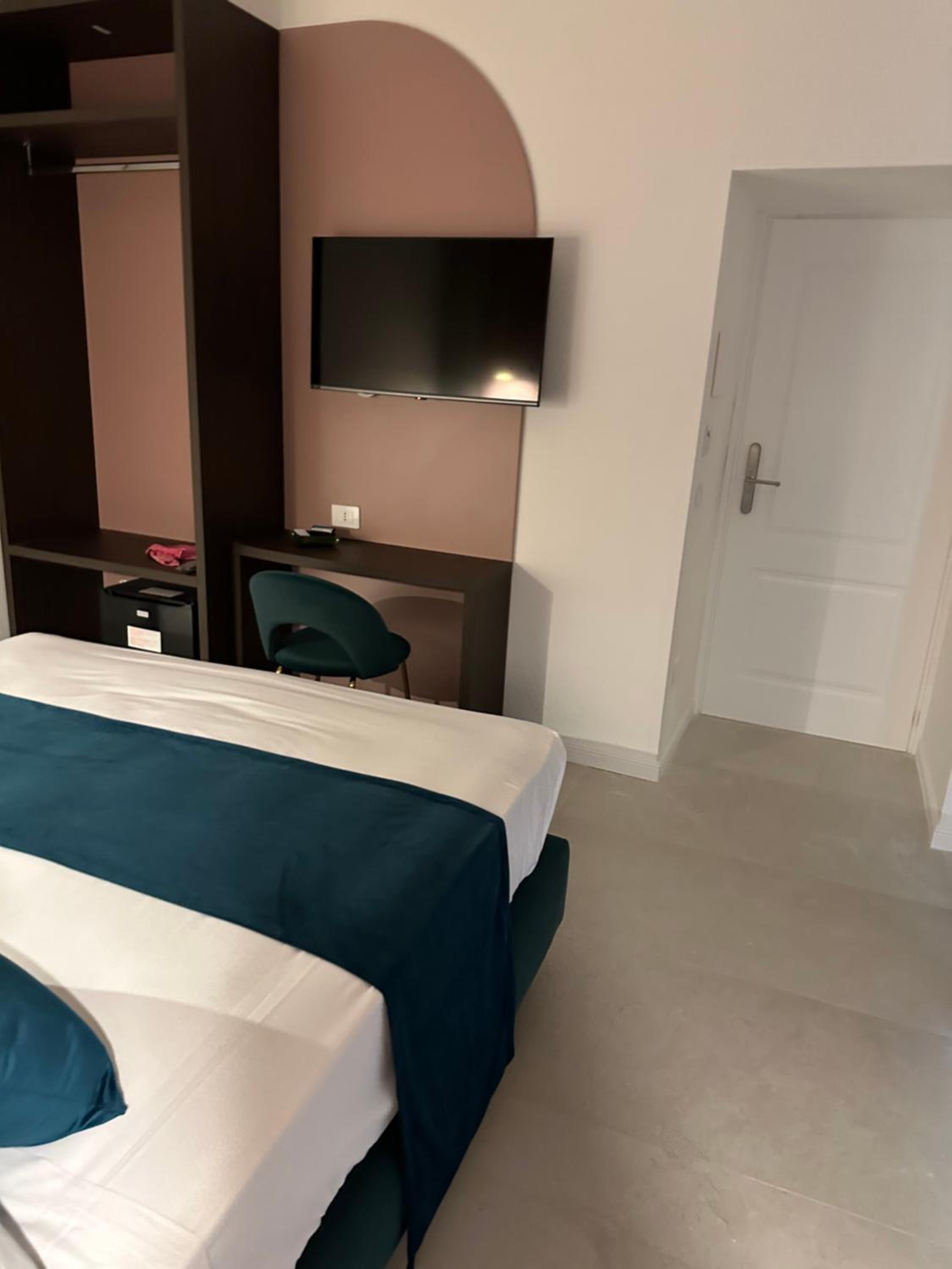 The room was in a historic building but was completely updated and modern. There was a queensize bed, a good size bathroom that was completely updated with a large shower and great water pressure. Plenty of hot water too. The room was beautifully decorated and it had a balcony overlooking the street. There was a main room with tables where breakfast was served in the morning. The staff was great, they were very helpful and friendly. Mariarca gave us some great suggestions for pastry shops, churches and places to see. She was wonderful. The location was perfect. Just around the corner from shops and restaurants. Close to Centro Storico and the Archeological Museum. It's just a block from the metro station as well. We enjoyed our stay! Thank you for our welcome package as well, it was a nice touch!