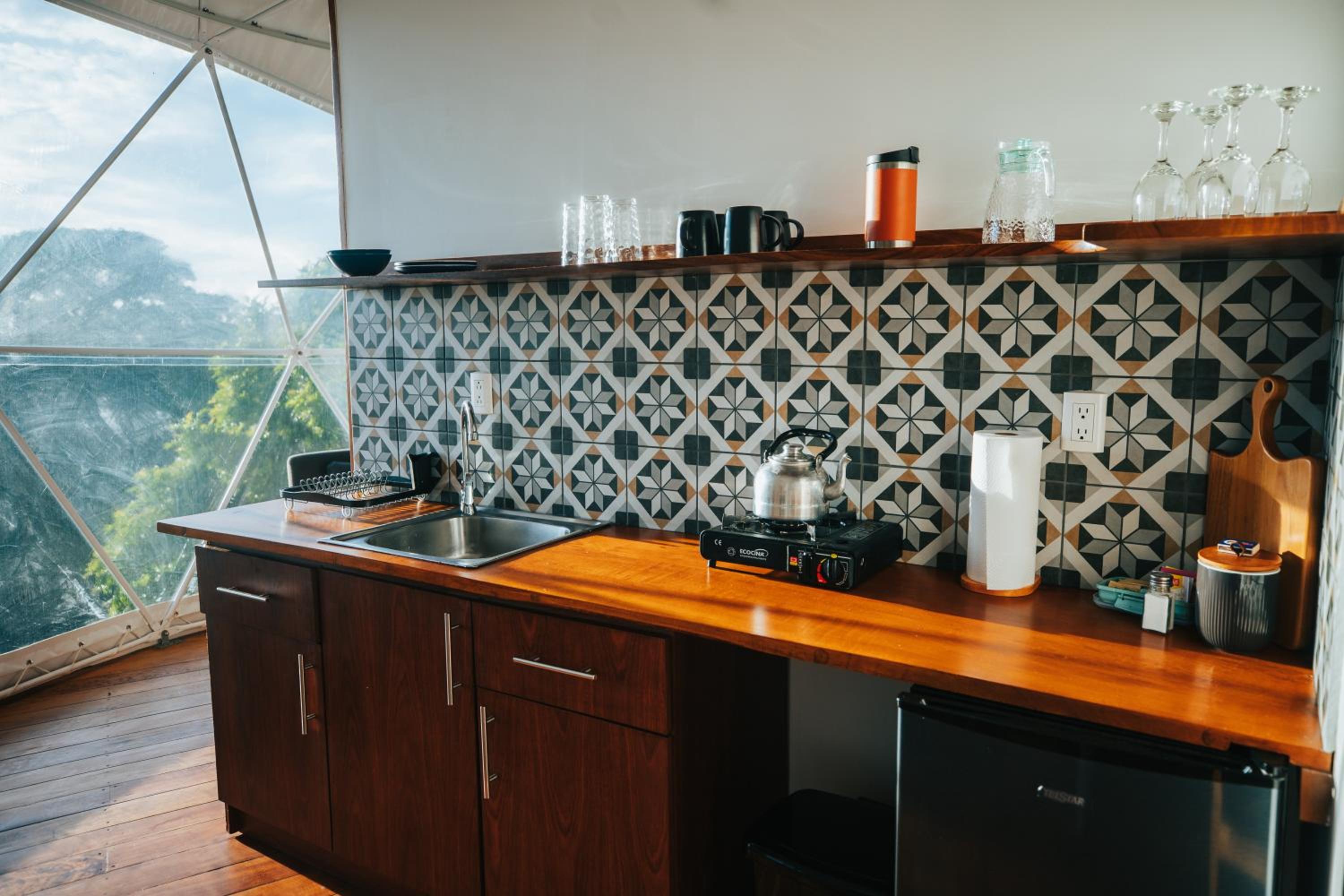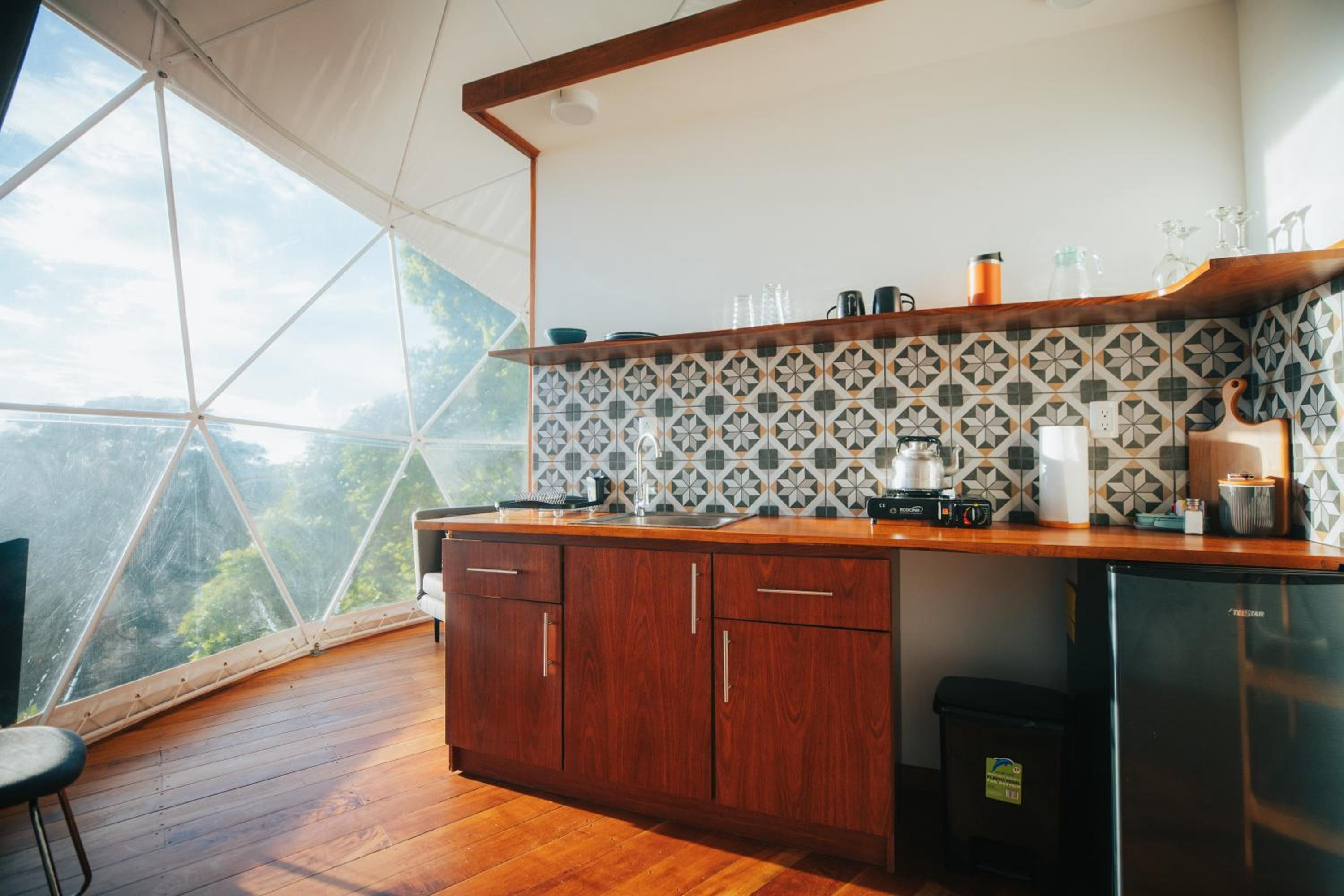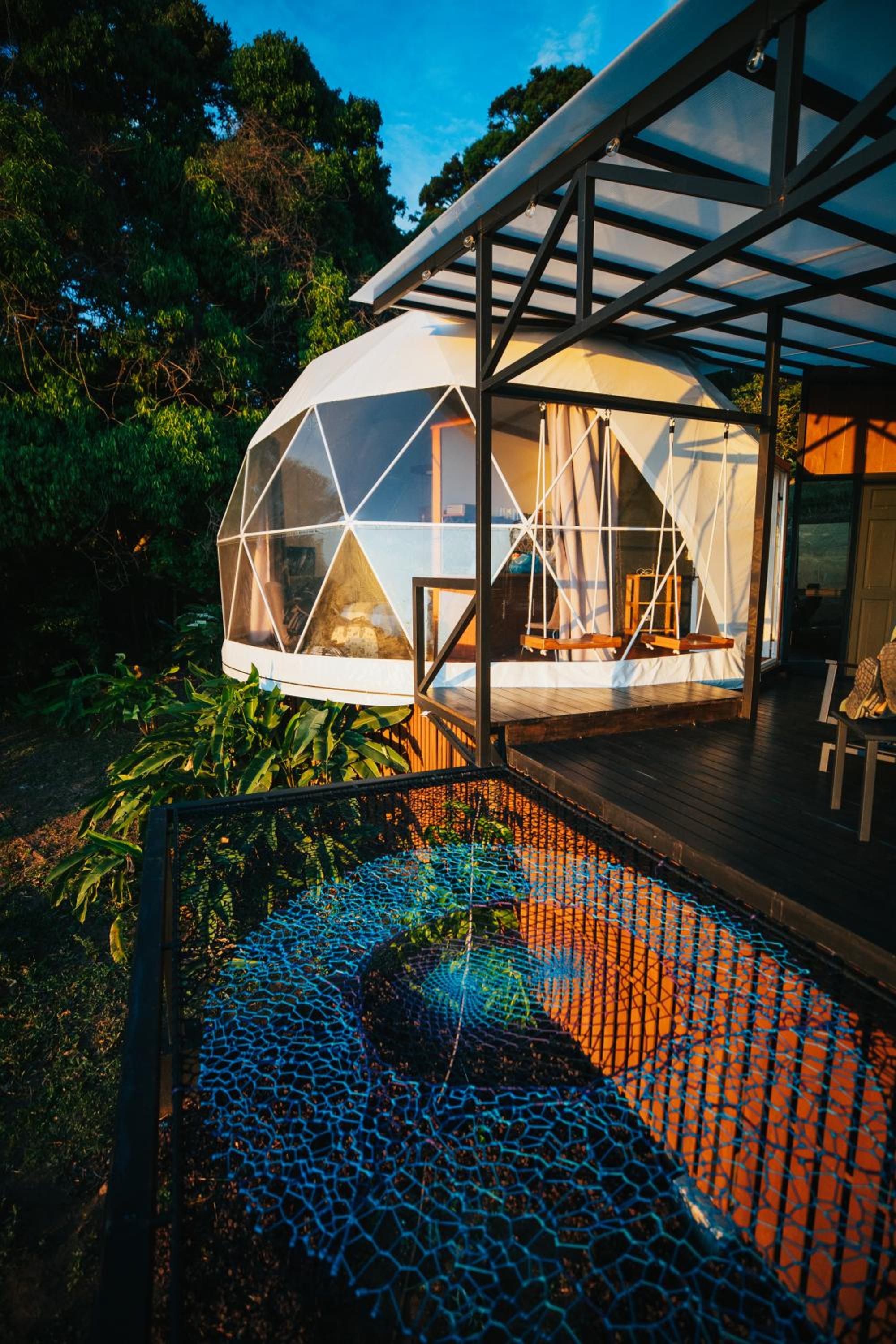 The domed itself is nicely appointed with a decent kitchenette, plates, cutlery and hot plate, and a cool outdoor trampoline. But the domed structure does not appear to be air-tight, and the interior had dozens of insects and mosquitoes when we came indoors after trying the jacuzzi. The door to the dome didnt latch properly, which probably did not help the insect situation.