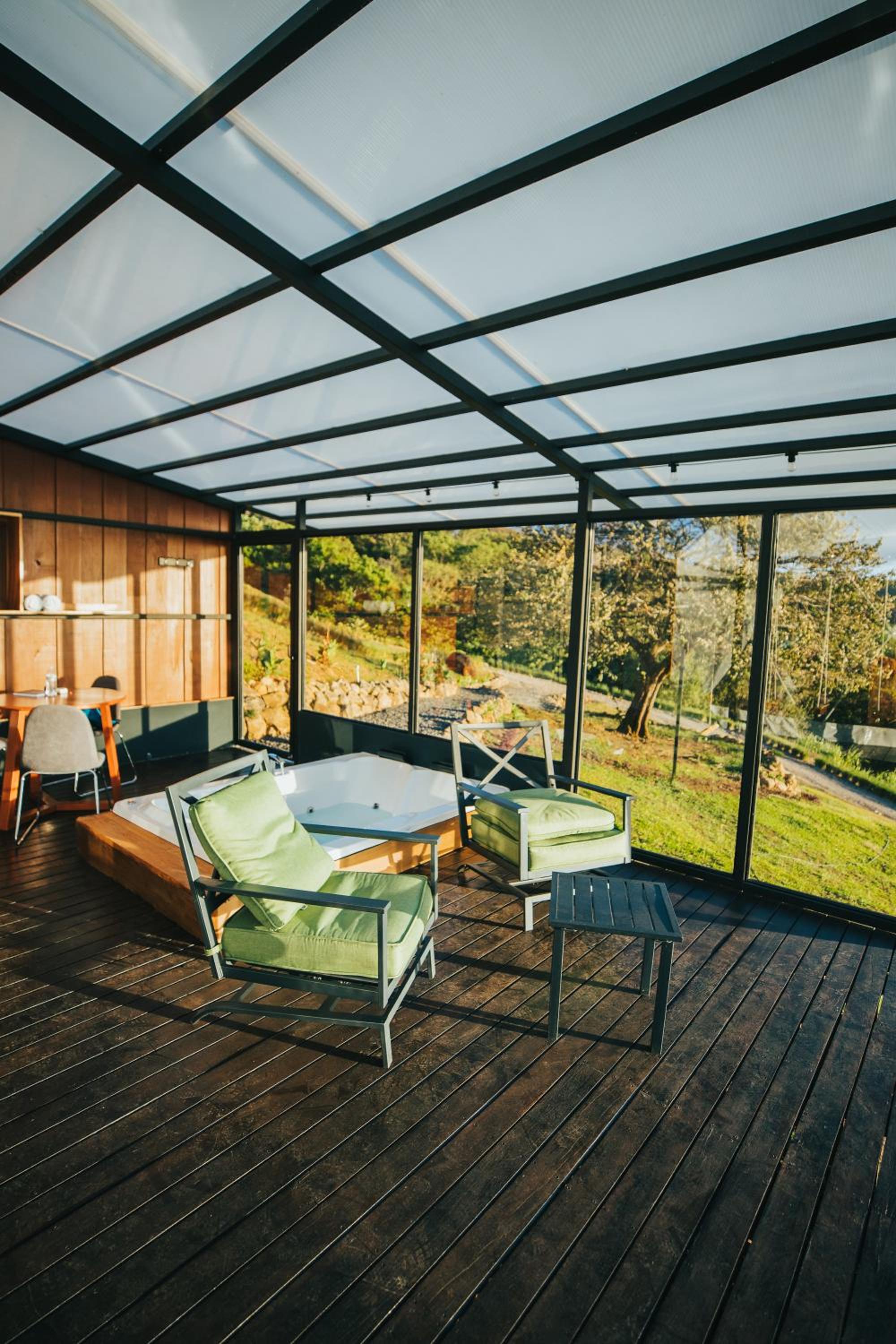 The hot tub is basically non functional. We were surprised to see such a large tub (4 person), which took a long time to fill. The water was luke warm, which was not fun. Looking at the eco-friendly solar thermal hot water system, its obvious that it cannot provide anywhere near enough hot water for such a large tub.