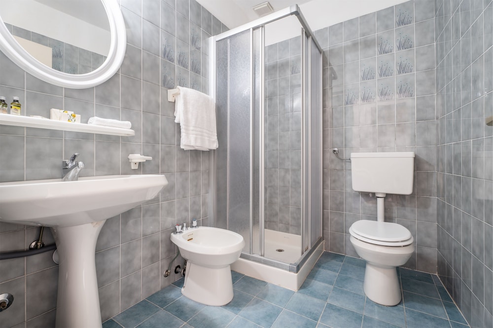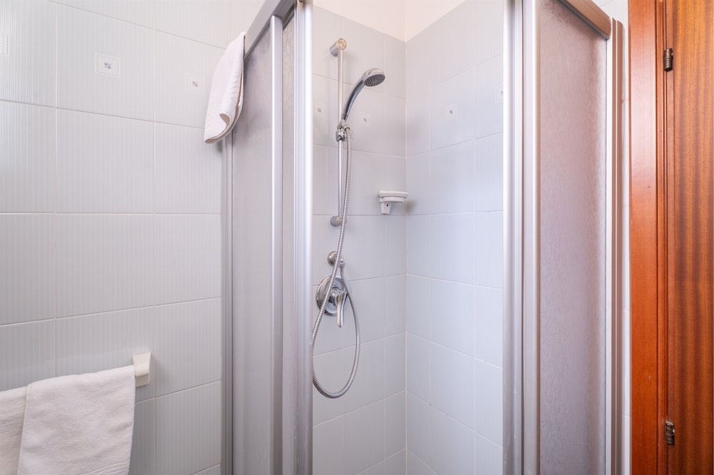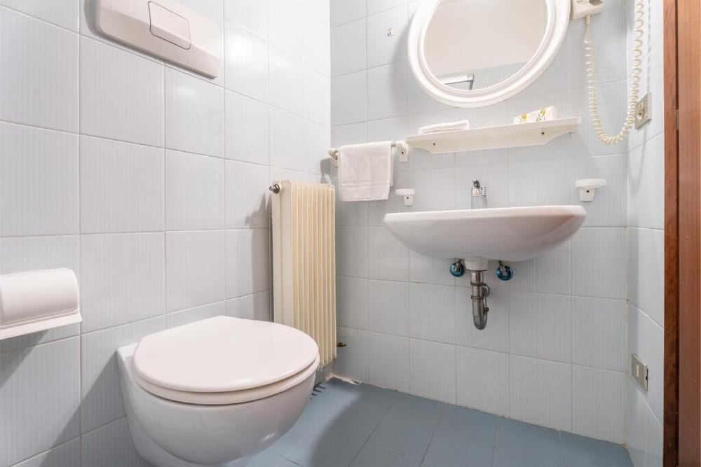 Solo due plafoniere con luci a neon (tra l'altro l'interruttore vicino al letto comanda la lampada più lontana e in prossimità dell'ingresso), porte e maniglie elementari, sanitari ed accessori bagno datati, scalinata all'ingresso che rende inaccessibile l'hotel ai disabili, nessun minibar in stanza.