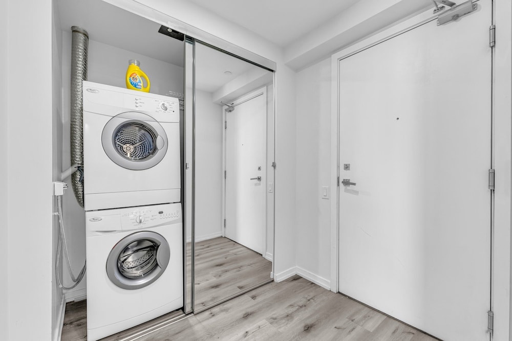 We ended up arriving 1 day too early and the hosts were super accommodating and made arrangements for us for the extra day within minutes! Finding the tiny entrance to the building next to Starbucks was confusing as a newbie to the area, but that's where the struggles ended. The entrance is secure with a guard at a desk. For extra $$, there's parking in the building (a hidden garage behind the building that the owners will give a key fob to). The place was absolutely gorgeous! A corner 2-bedroom property with beautiful views. Very clean with fresh linen provided. They charged a security deposit which was returned promptly after we left. The place is walking distance to everything (from the usual CN tower/aquarium area to shops and restaurants on the other side). There is a marketplace right next door to stock up on groceries very conveniently. We didn't get to cook much, but the place was fully equipped with cooking utensils and appliances. We will definitely stay here when visiting next time!