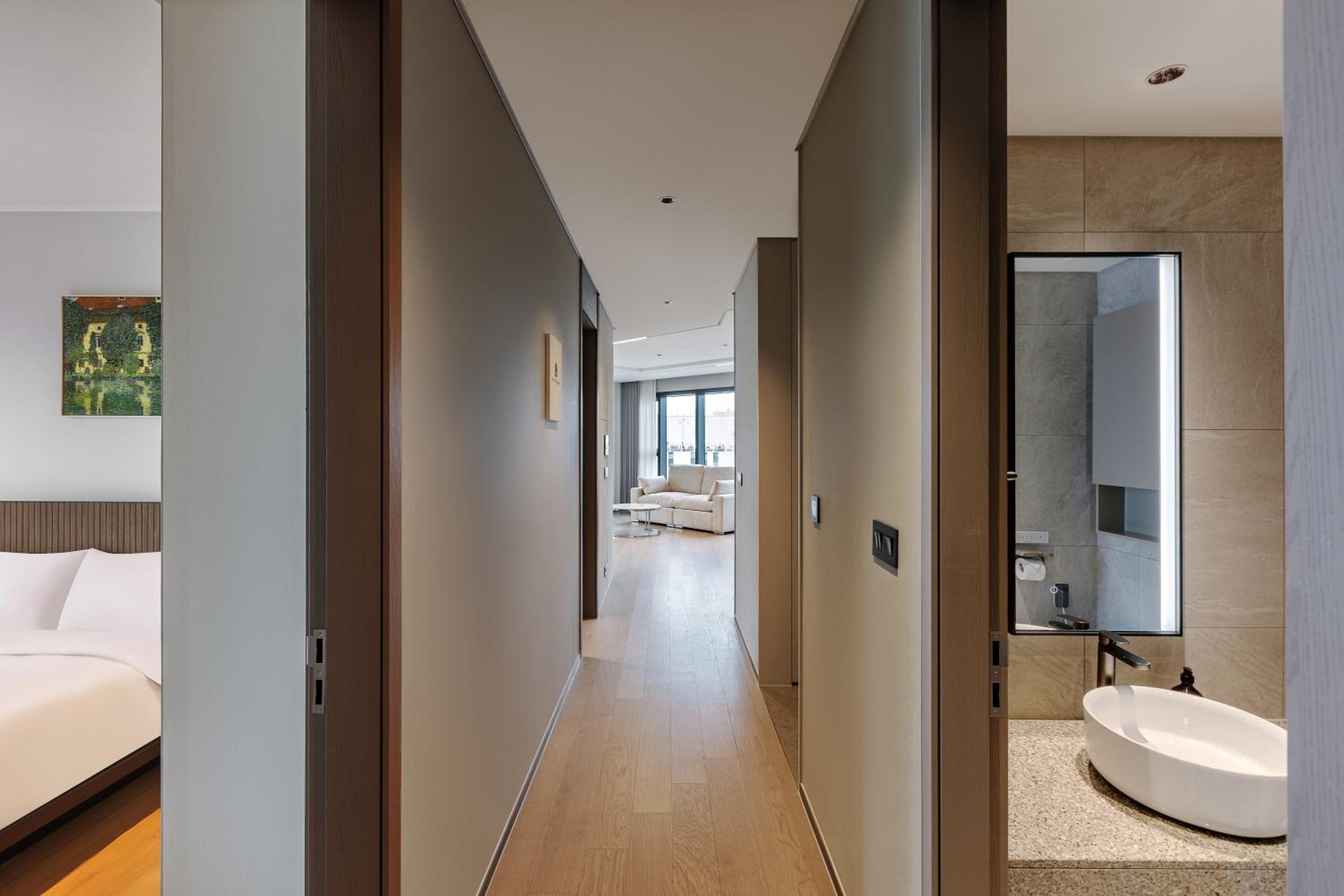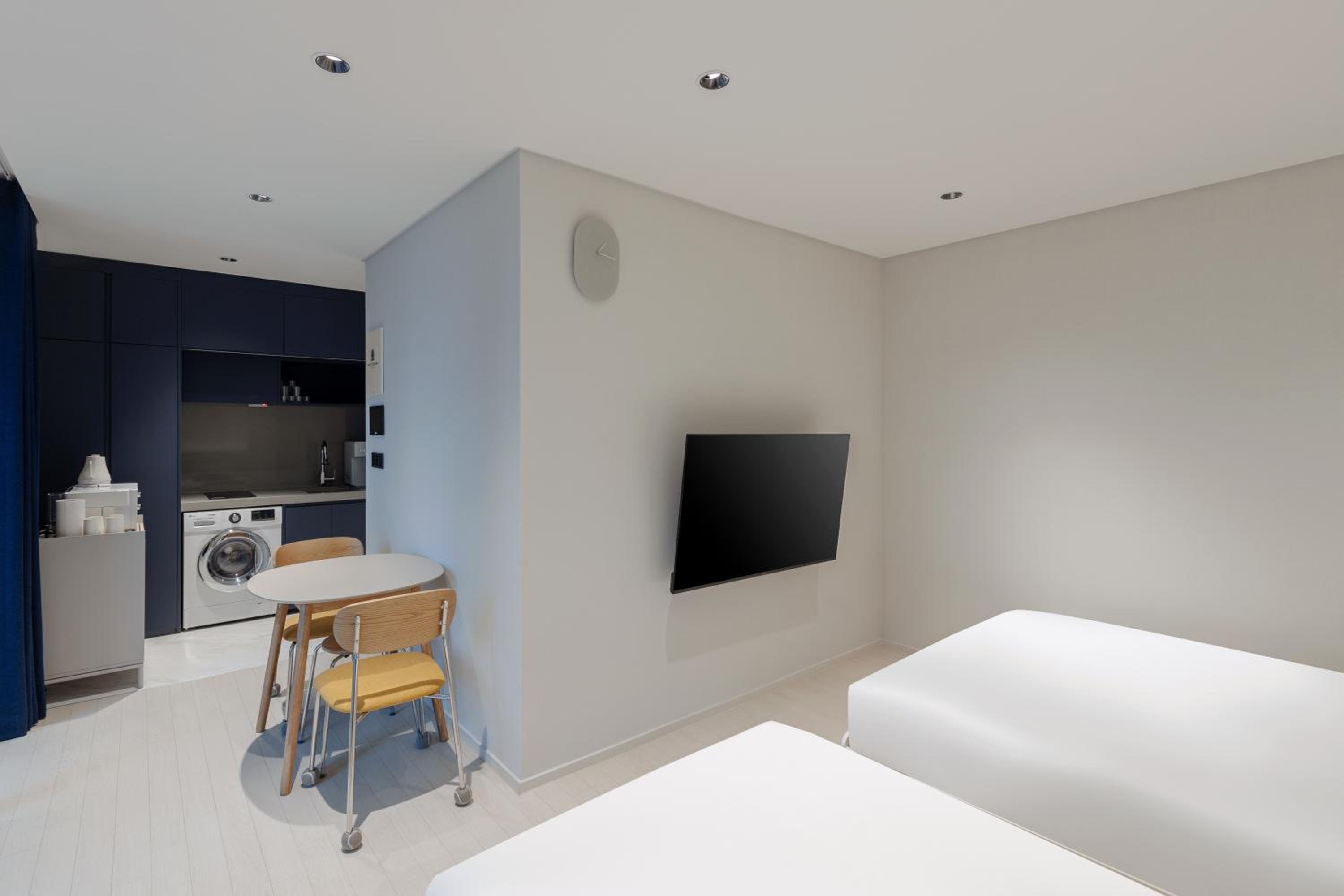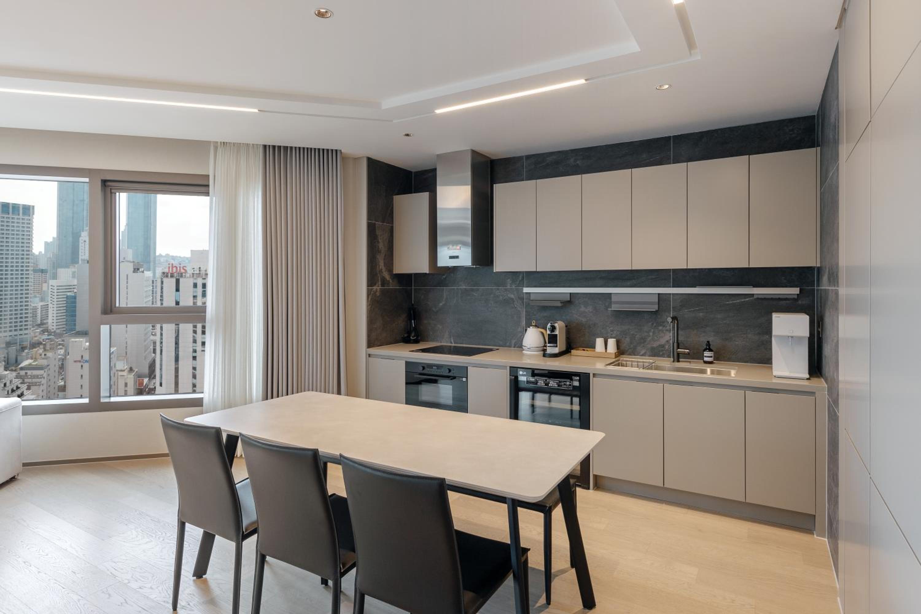 The 2 bedroom apartment is huge, location is great, about 7mins walk to the busy Haeundae shopping street. The kitchen has a water dispenser, which is really useful. There is a big bakery opposite the hotel, a few mins walk away and opens at 8am, highly recommended.