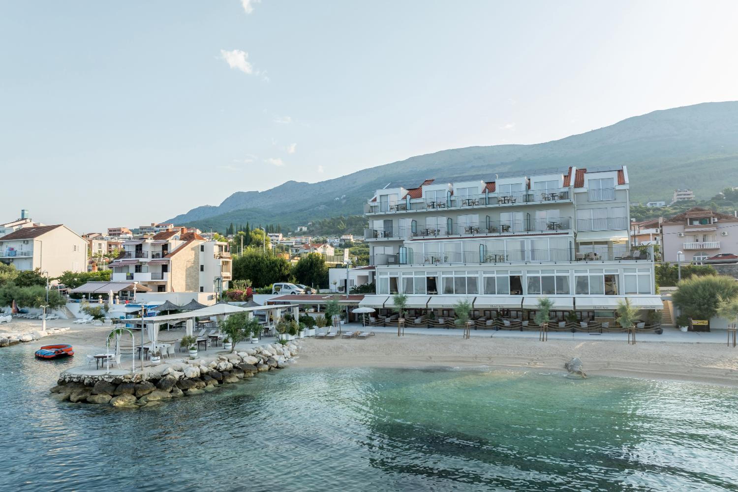 Hotel Aria boasts 4-star accommodation in Podstrana with stunning beachfront views, featuring a terrace, restaurant, and bar. Experience the ultimate coastal getaway with convenient access to Diocletian's Palace and Mladezi Park Stadium.