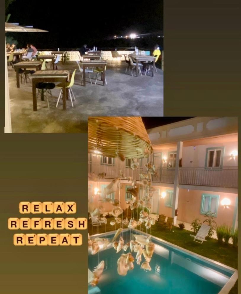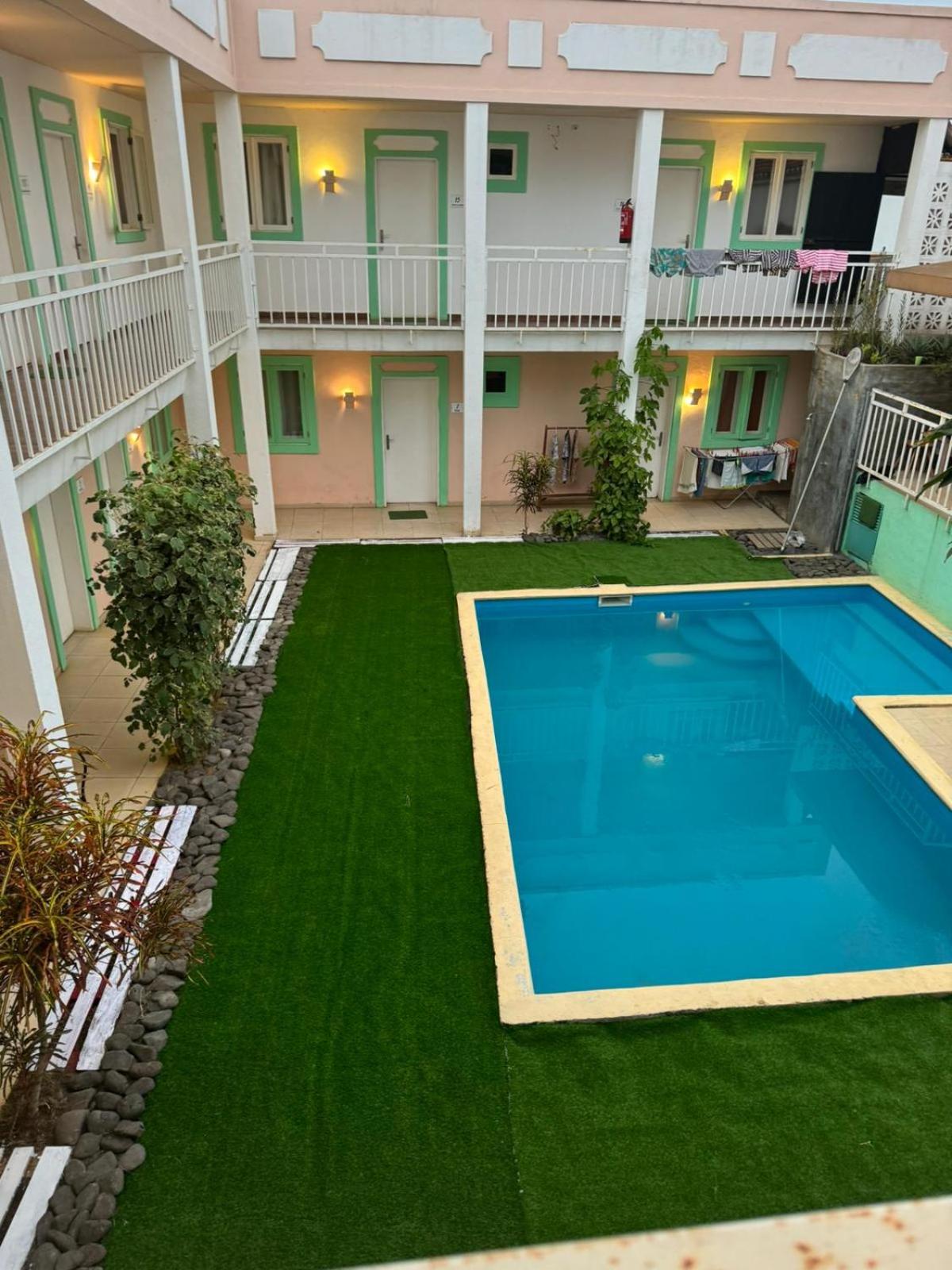 Tem piscina exterior, mas não nos inspirou muita confiança para dar um mergulho.