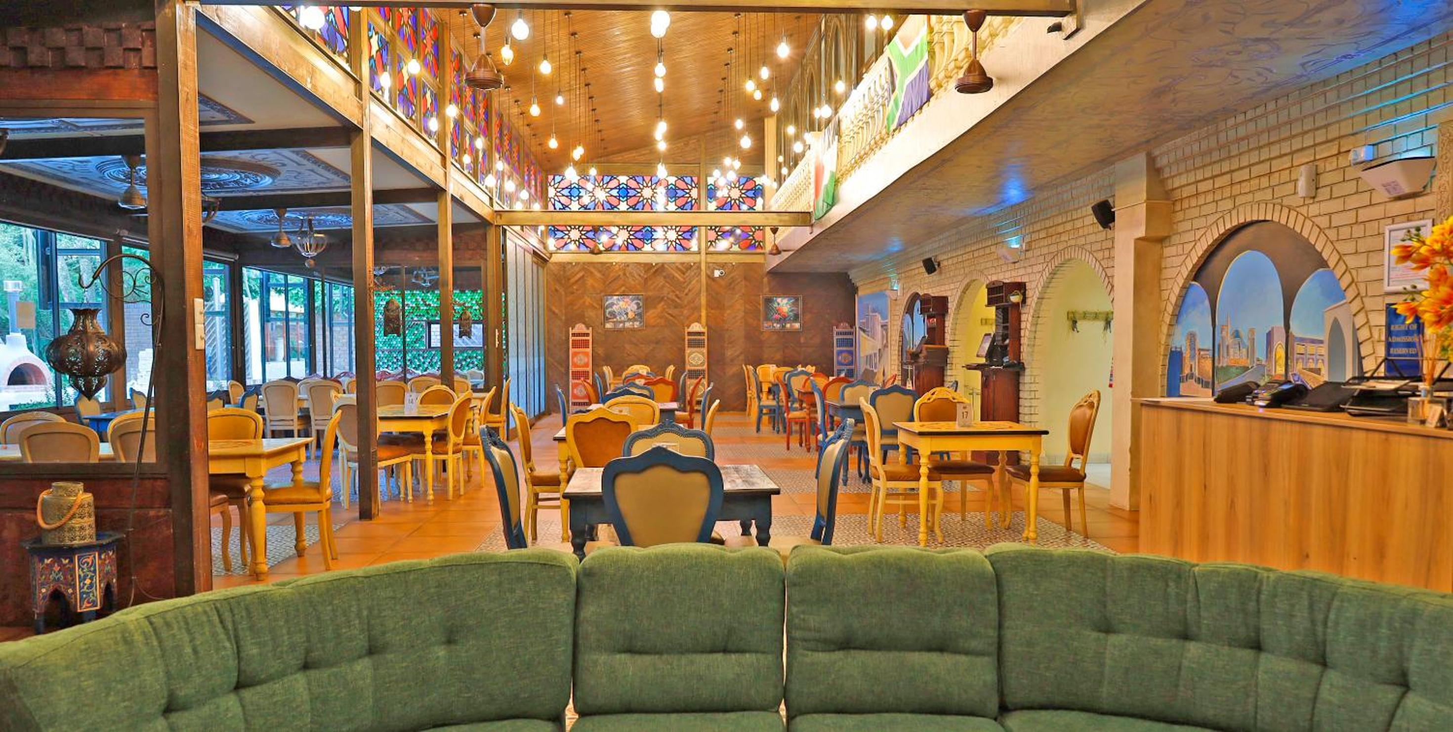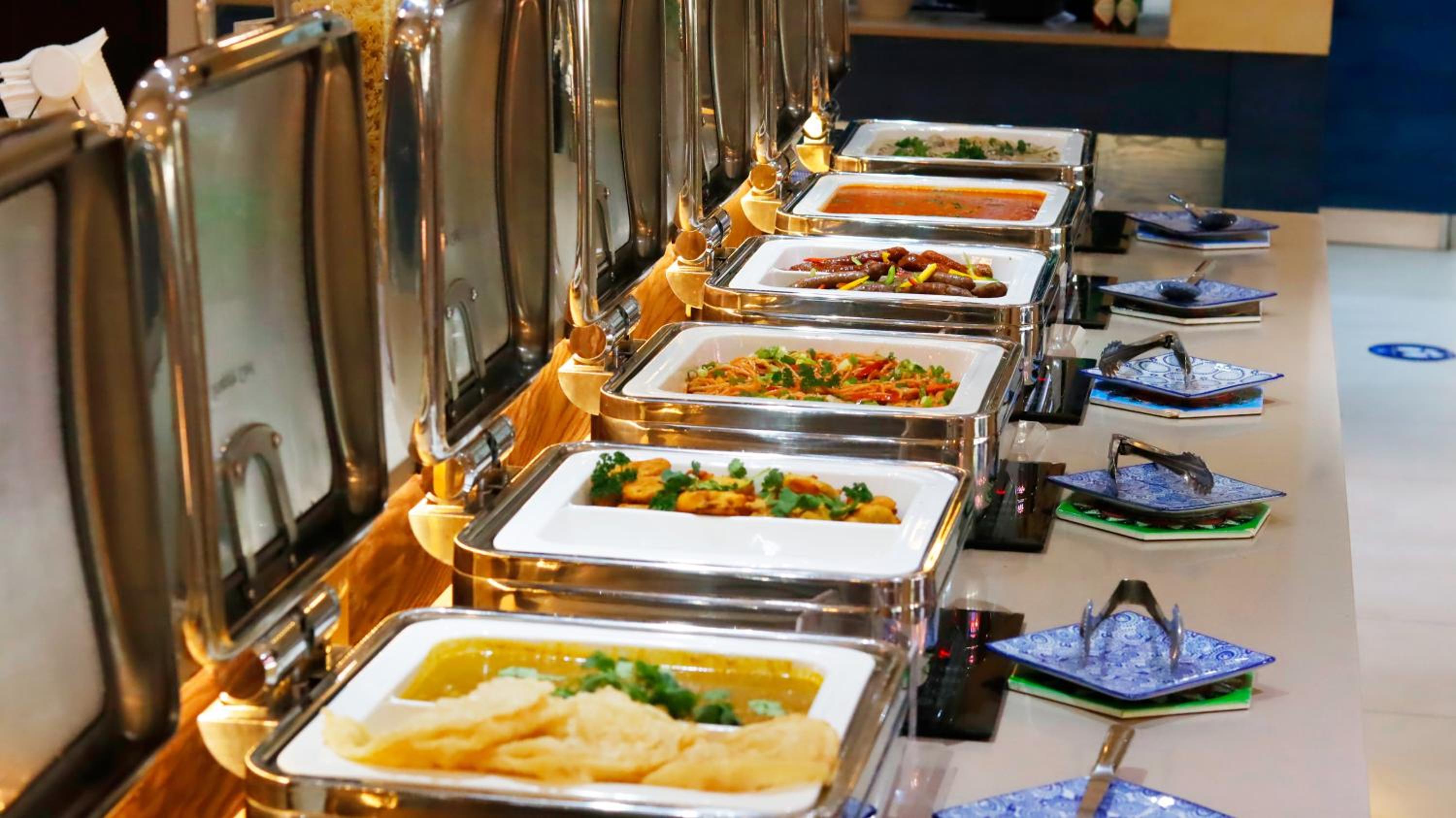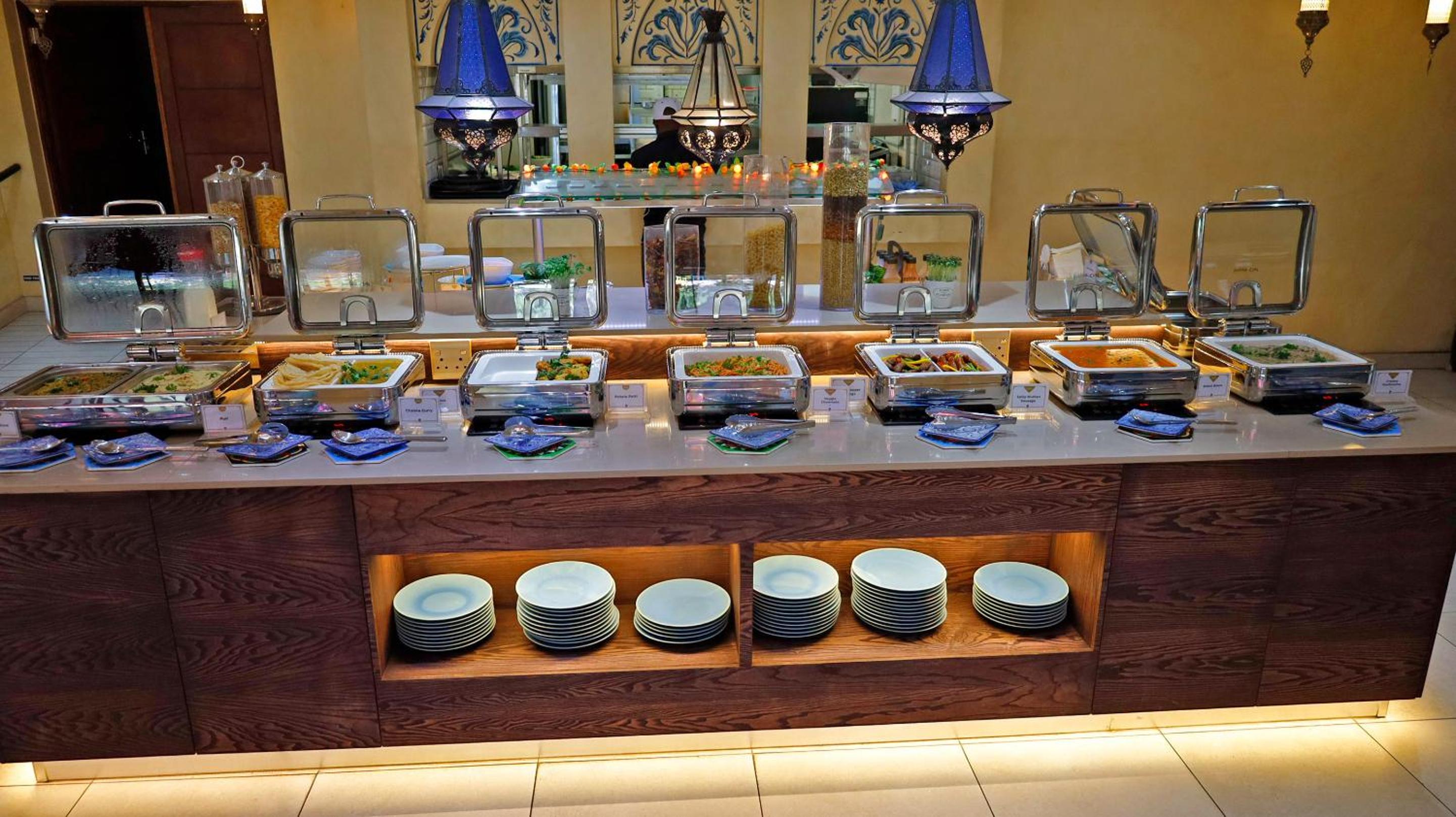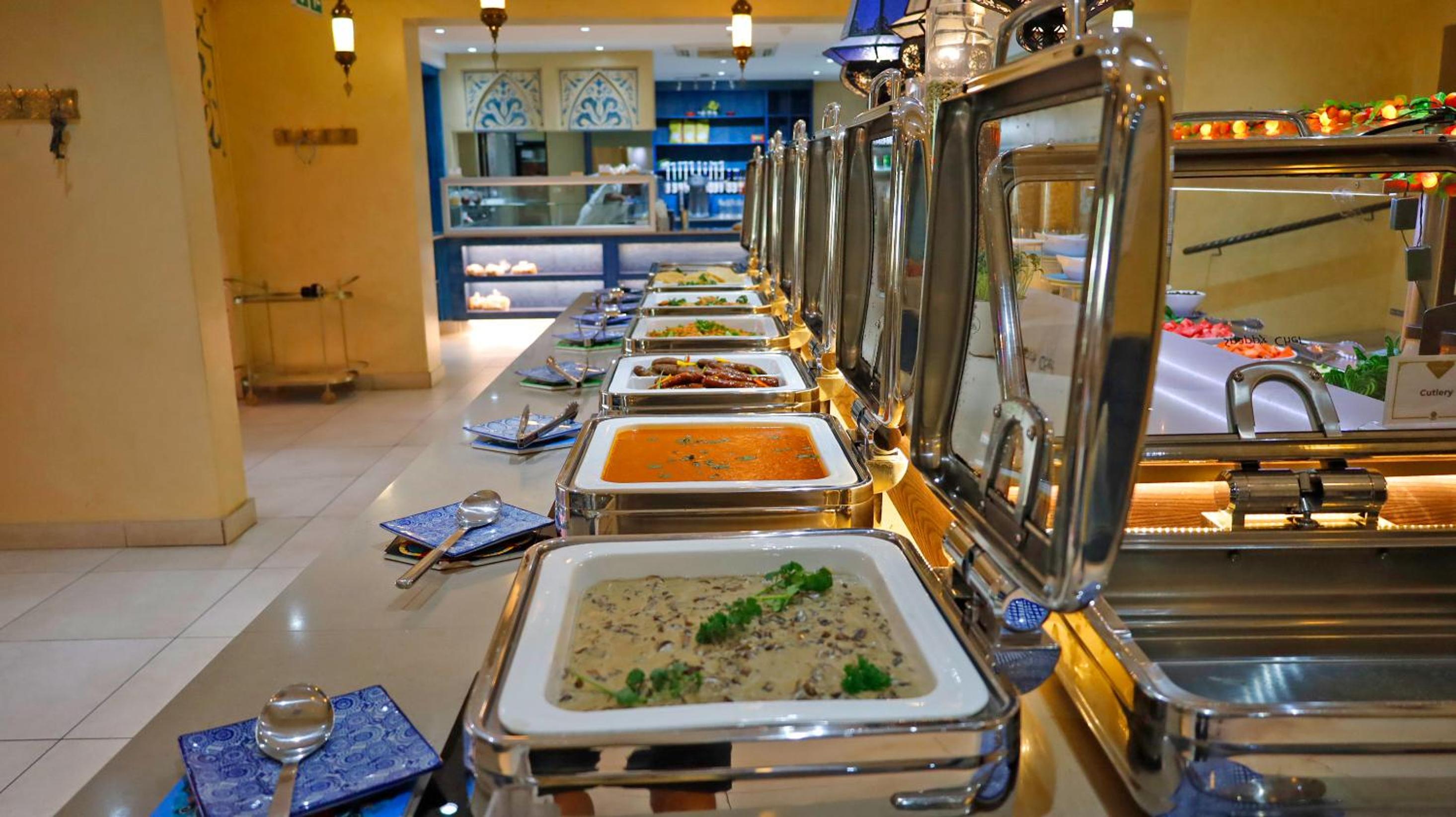 Guests can enjoy a variety of cuisine options, including Indian, Middle Eastern, and Moroccan dishes, with a halal option available upon request.
